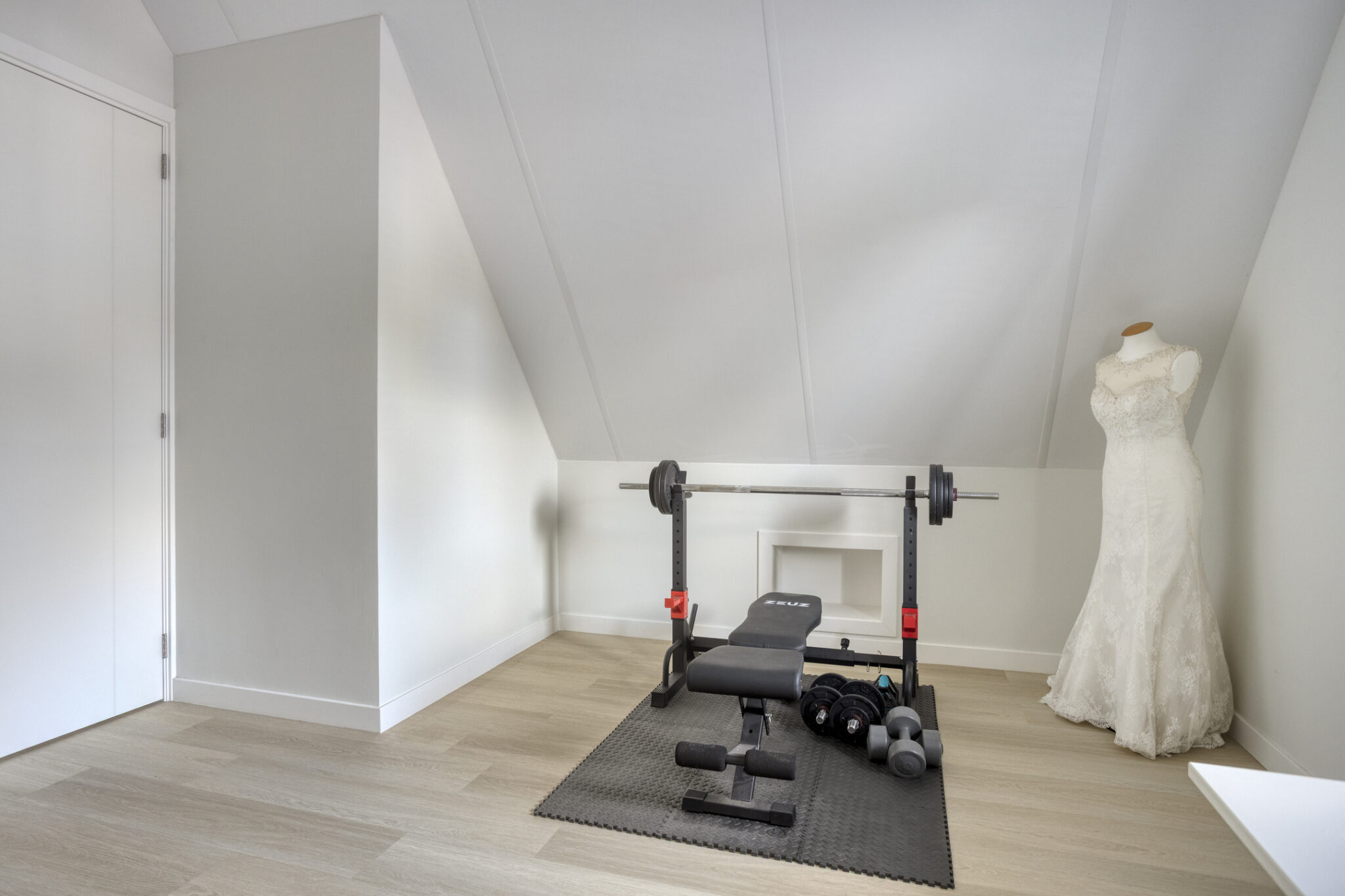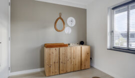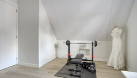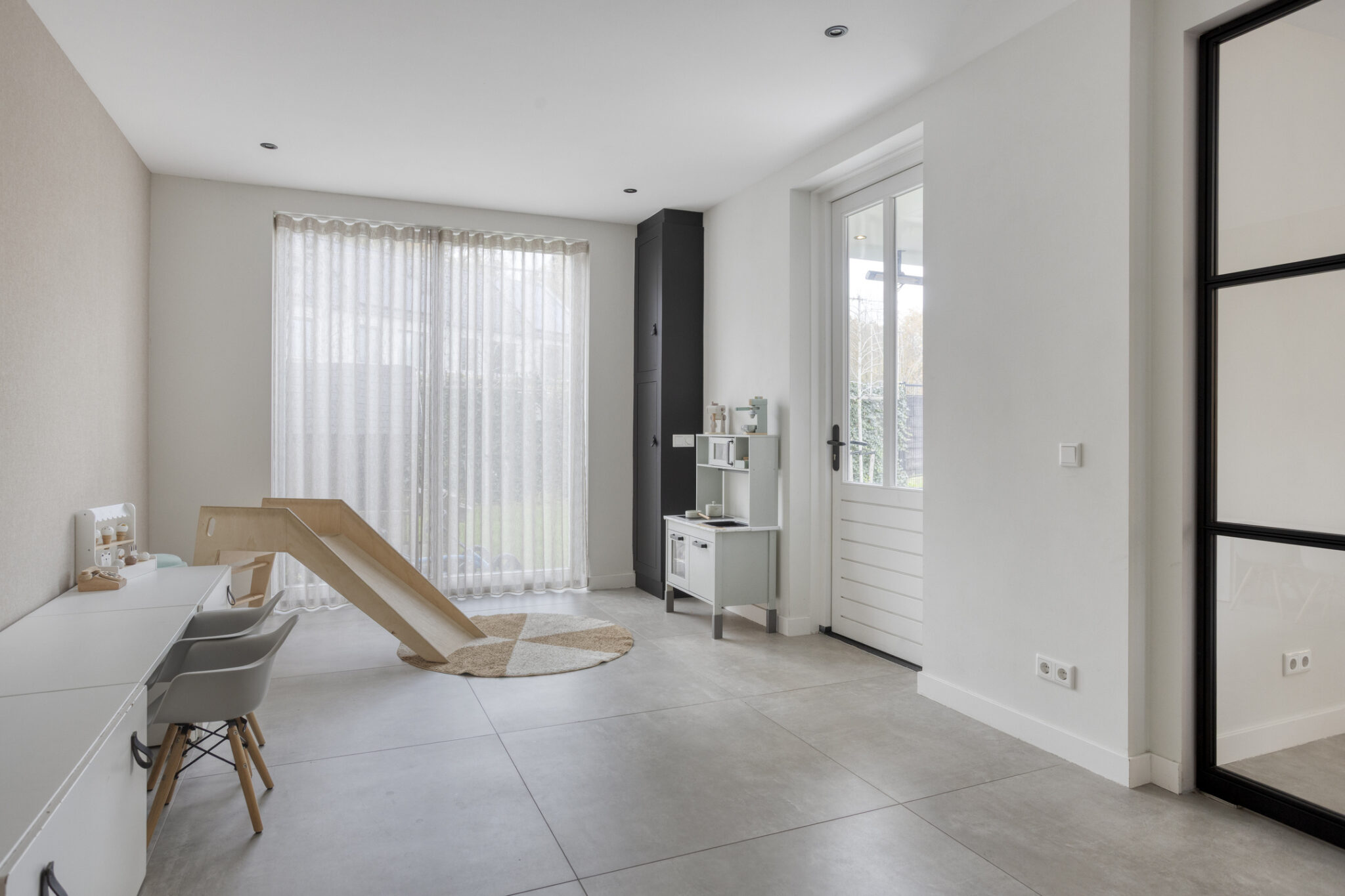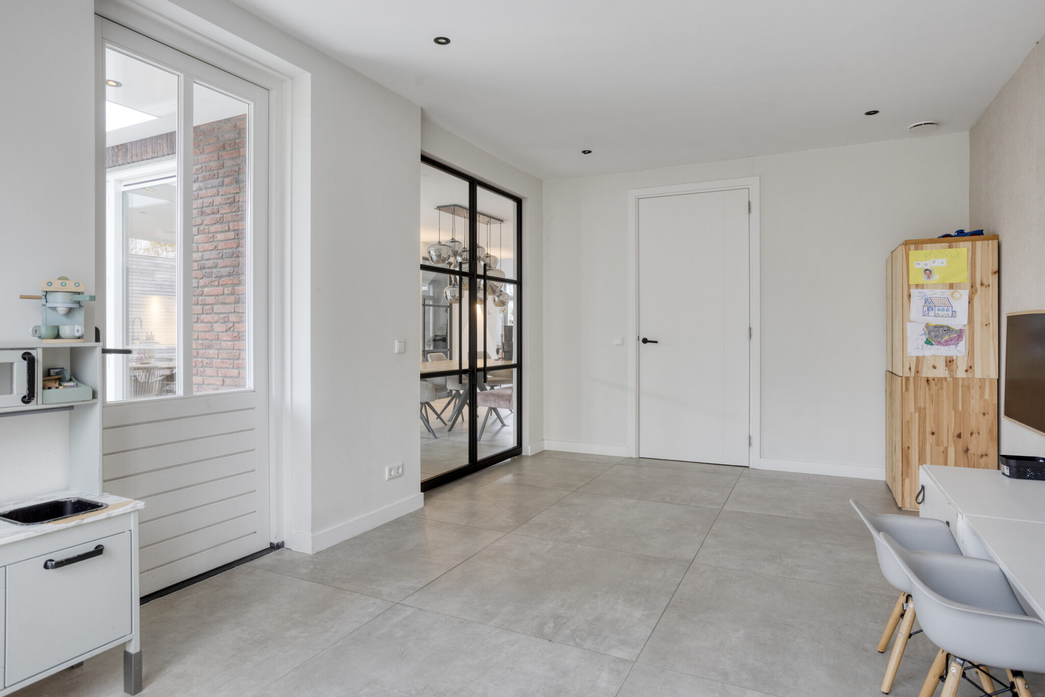 Dubbele taatsdeuren leiden vanuit de keuken naar de speelkamer, ca. 19 m², op de begane grond. Door de tweede meterkast zijn er vele mogelijkheden tot gebruik; de keuze is aan u! Vanuit deze ruimte is direct toegang tot buiten te verkrijgen maar ook tot de garage aan de voorzijde.