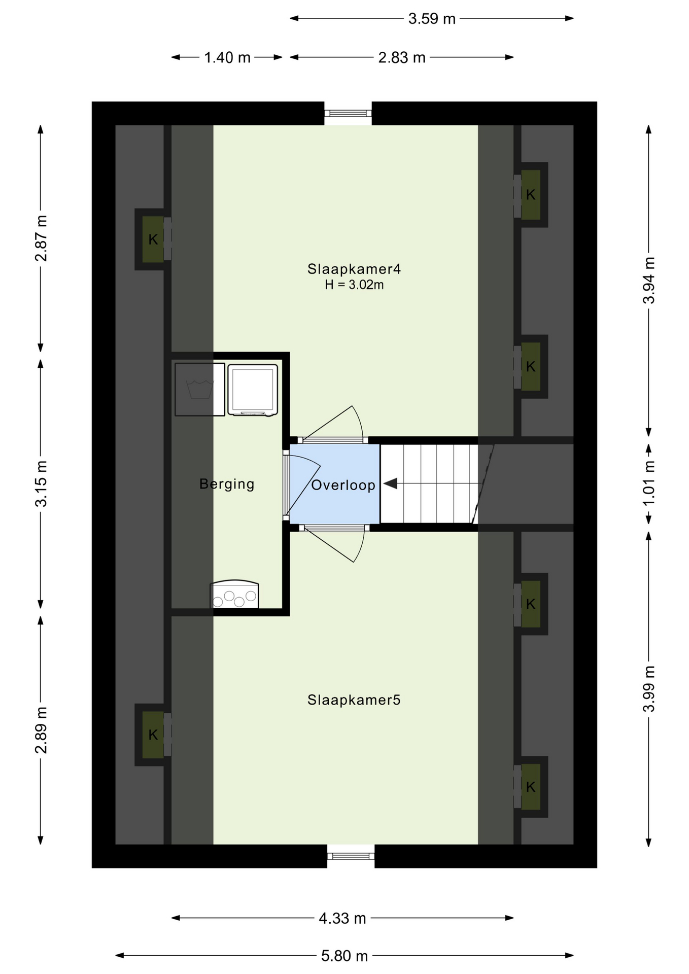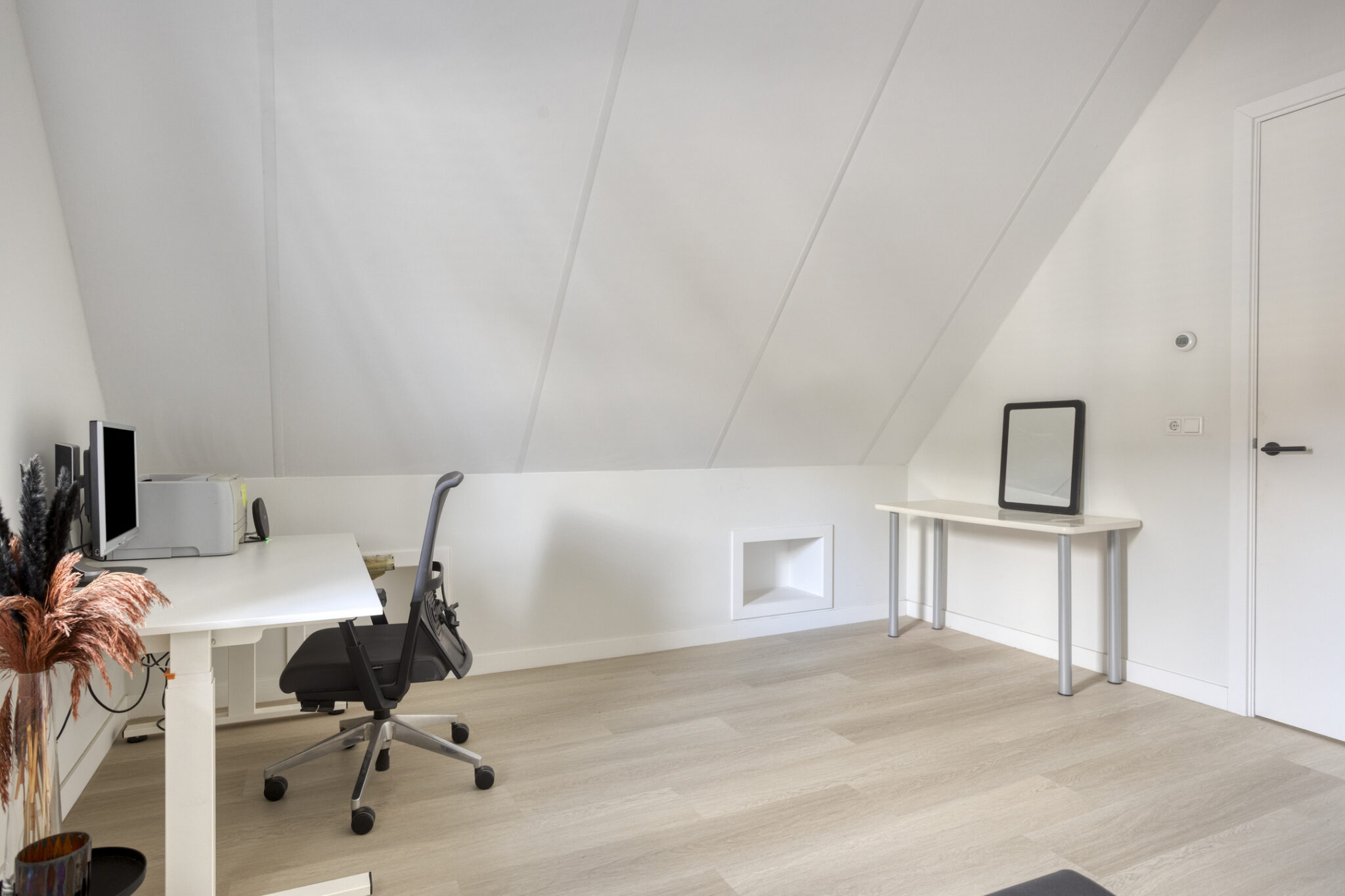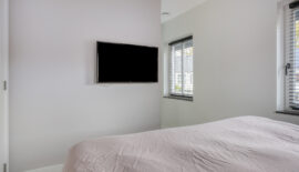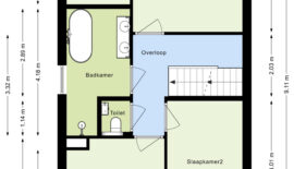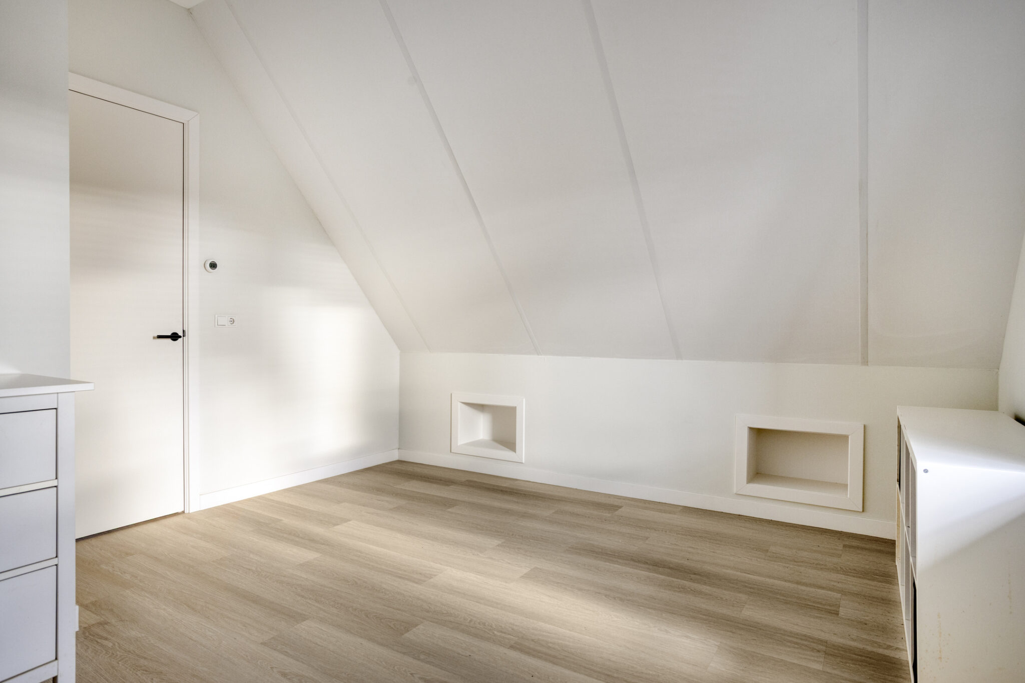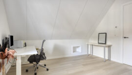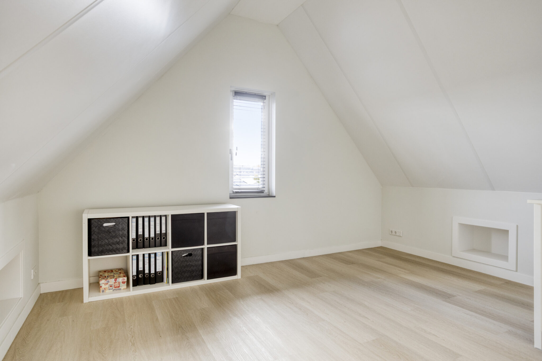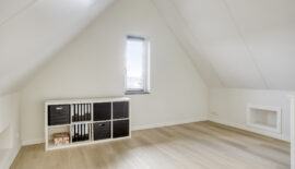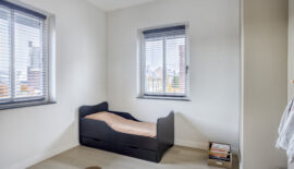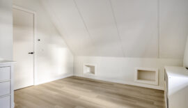 De bovenste verdieping is nog een volwaardige slaapverdieping met twee slaapkamers. Zowel de oppervlakte als de hoogte maken dit tot twee royale kamers. Ook deze kamers zijn voorzien van een moderne pvc-vloer in houtmotief.