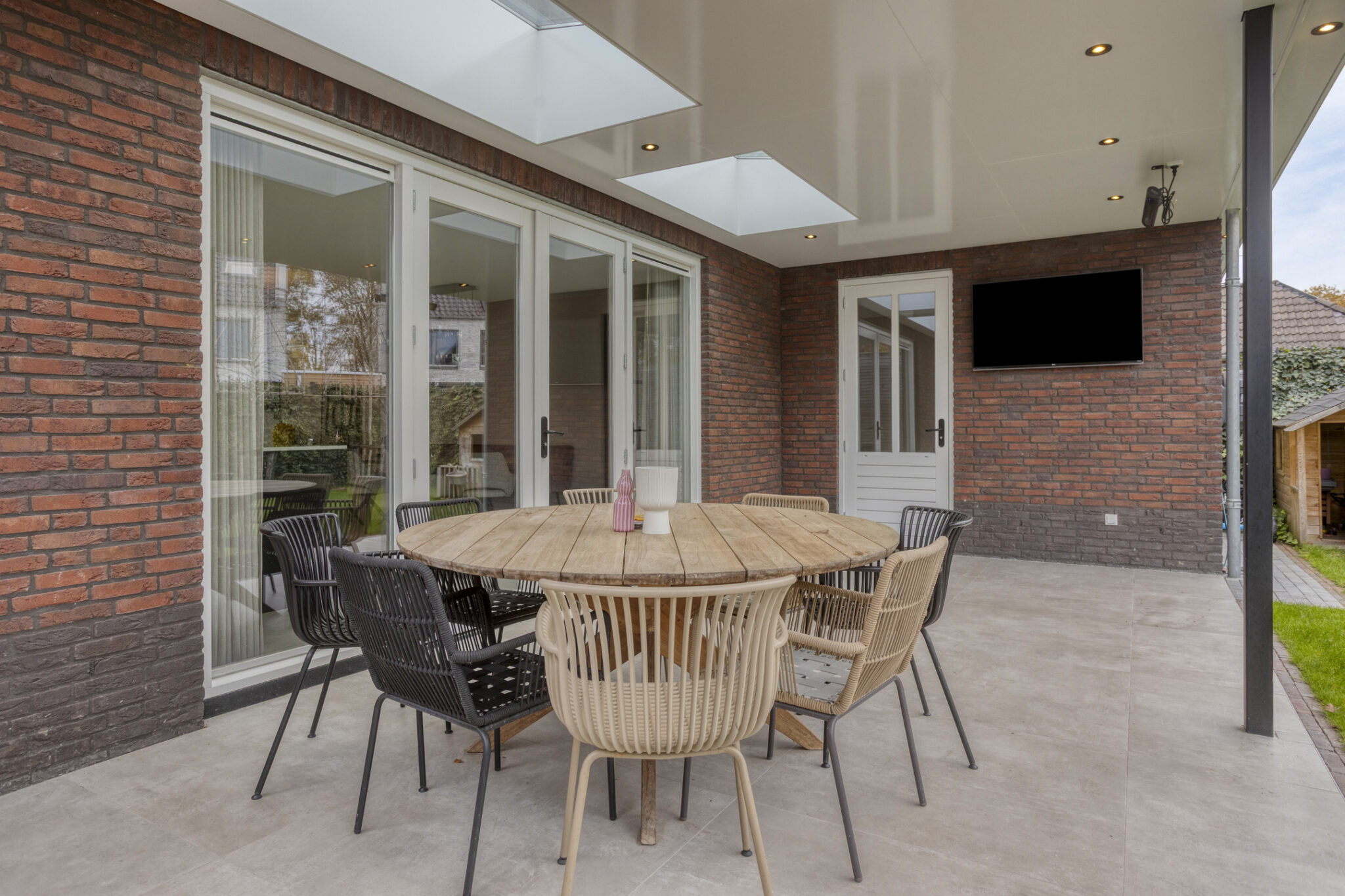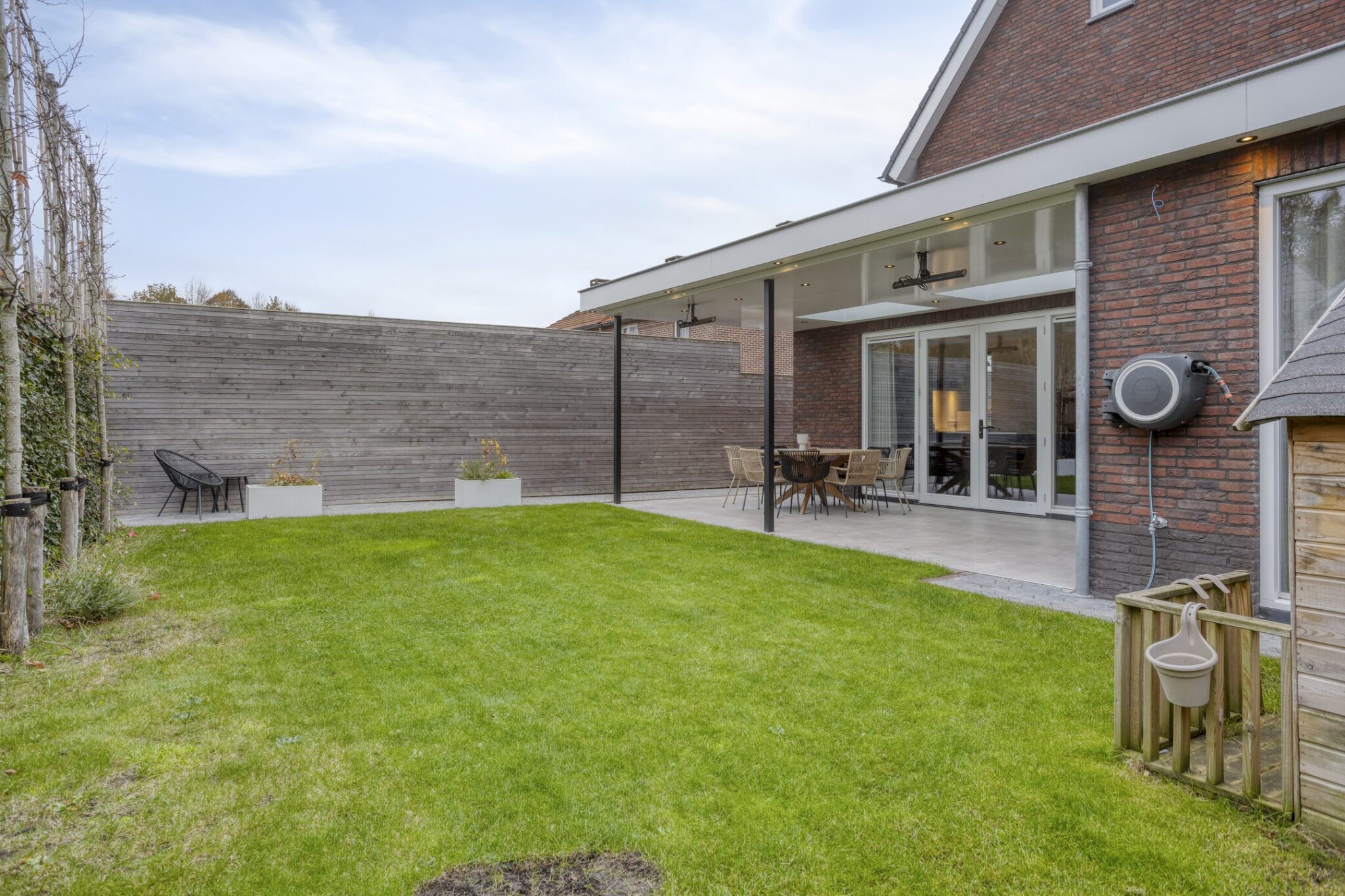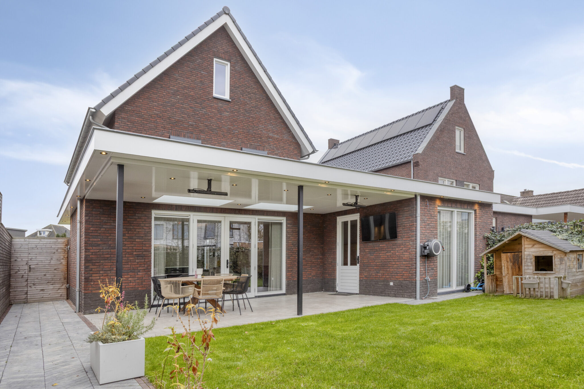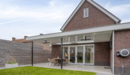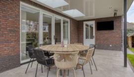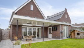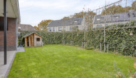 Bij deze woning hoort natuurlijk ook een prettige achtertuin. Met grotendeels gazon en een terras met overkapping is dit een ideale achtertuin voor diegene die graag lekker van het buitenleven wil genieten. De overkapping is voorzien van een lichtstraat en heeft spotjes rondom voor een sfeervol geheel.