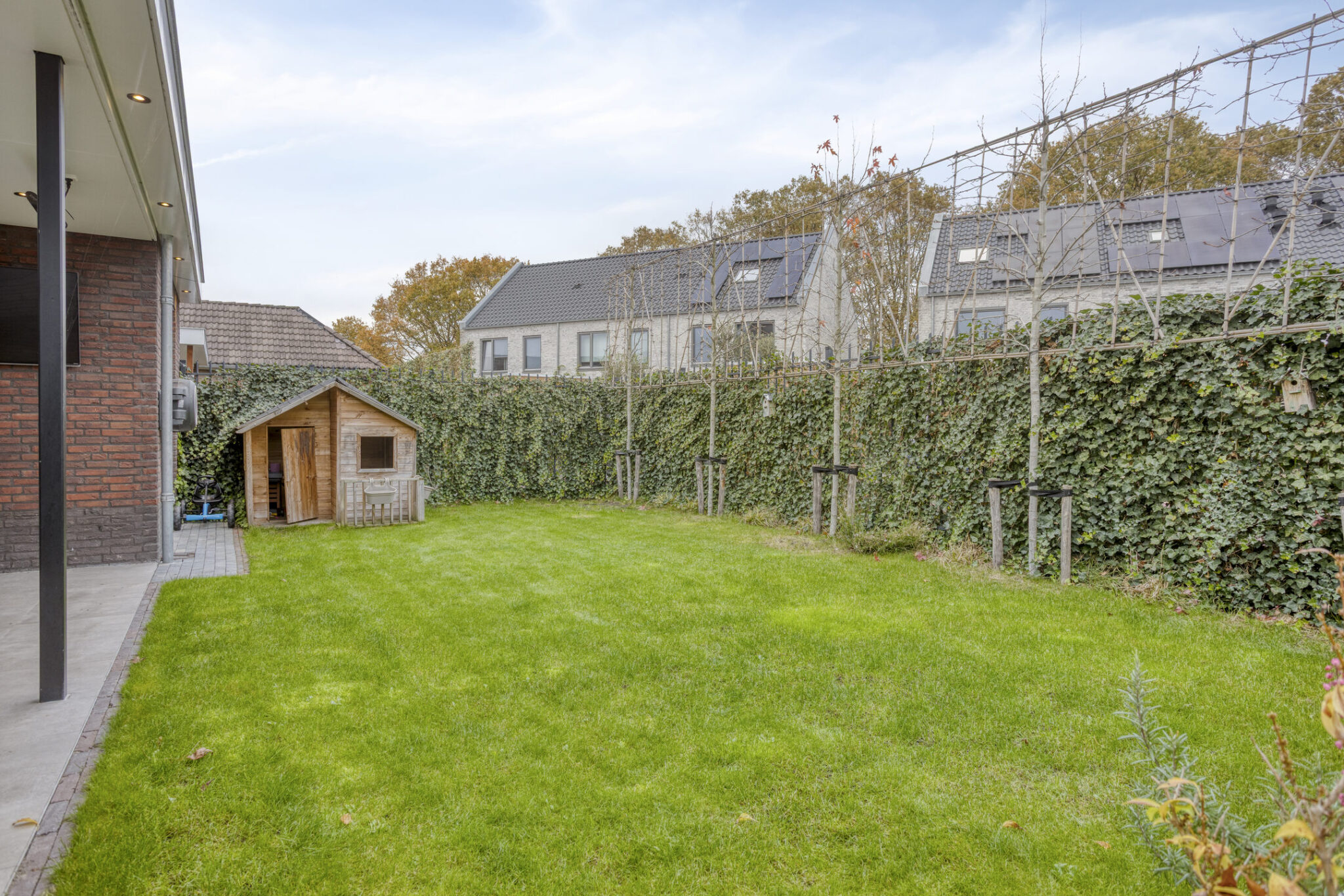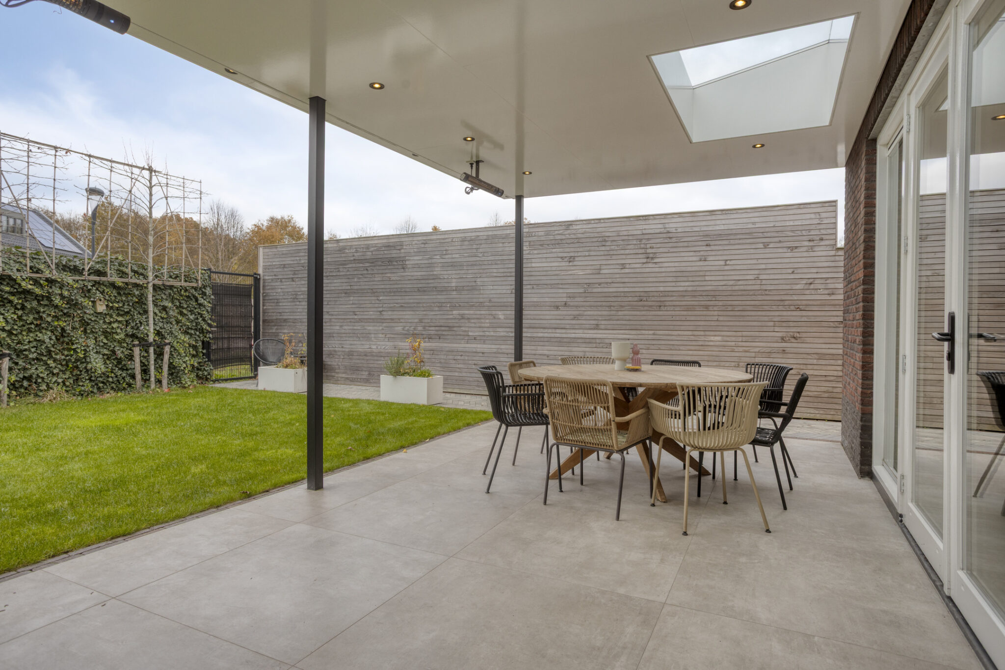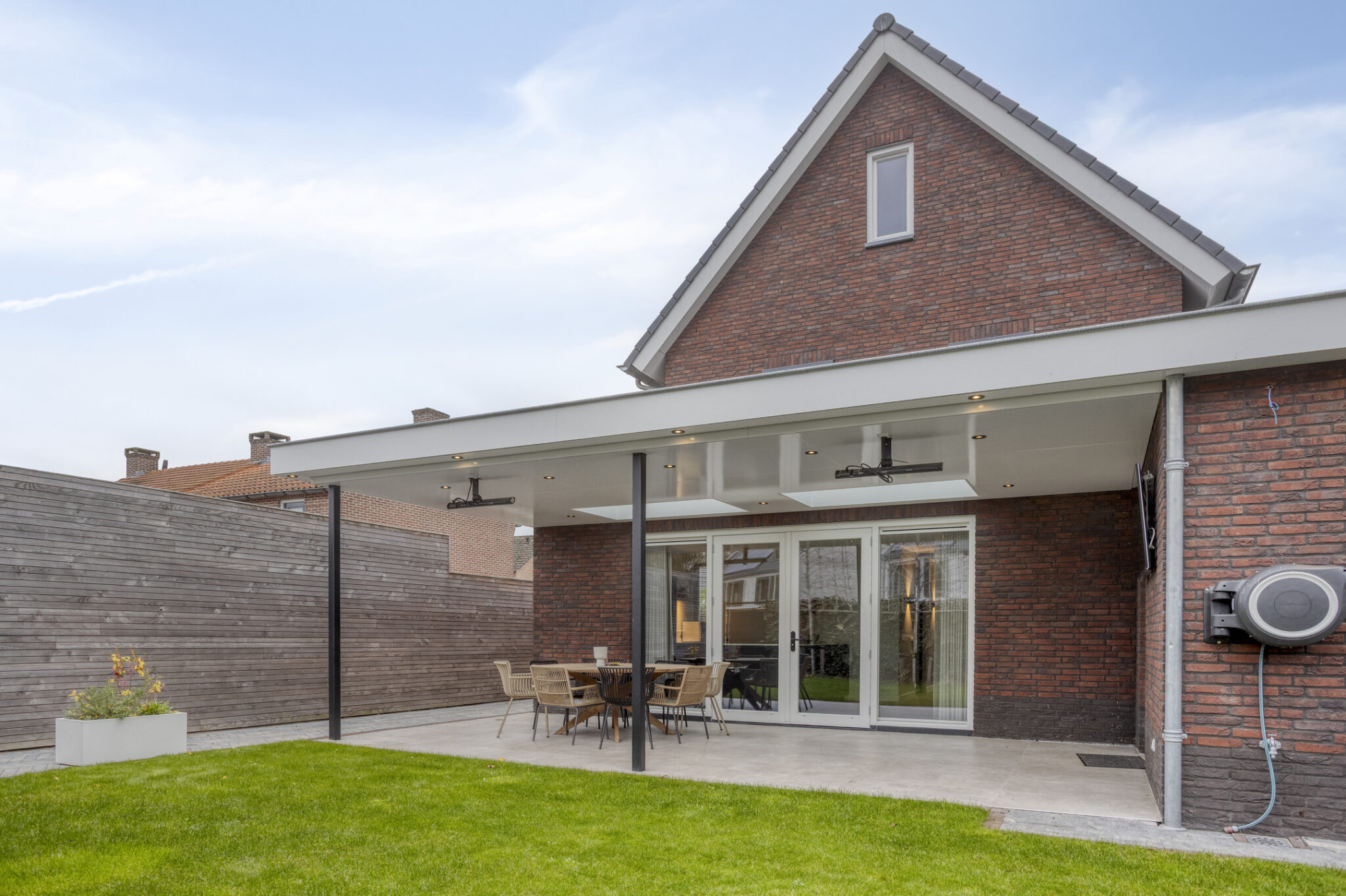 Bij deze woning hoort natuurlijk ook een prettige achtertuin. Met grotendeels gazon en een terras met overkapping is dit een ideale achtertuin voor diegene die graag lekker van het buitenleven wil genieten. De overkapping is voorzien van een lichtstraat en heeft spotjes rondom voor een sfeervol geheel.