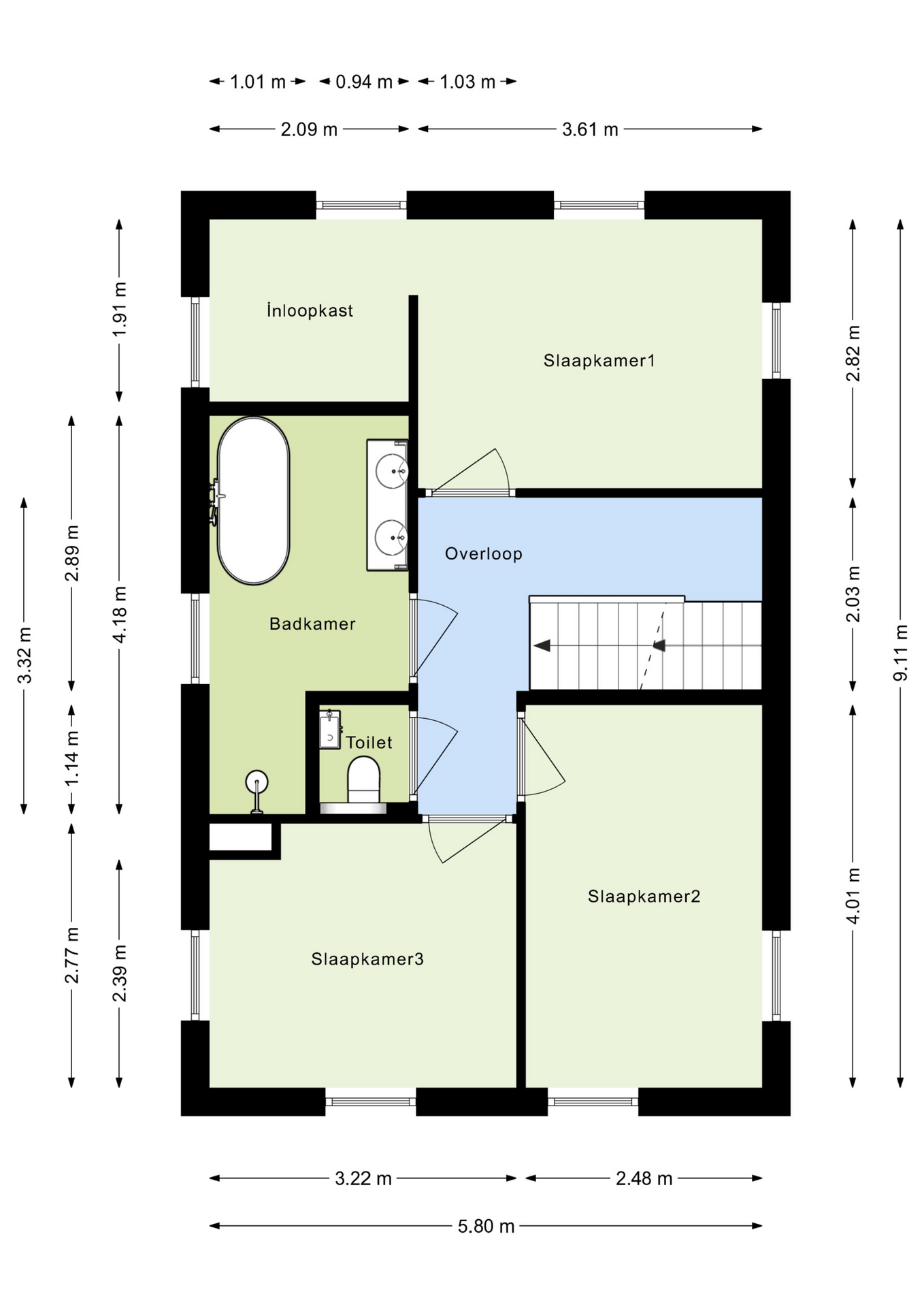 Aansluitend aan de overloop zijn drie slaapkamers te vinden, de luxe badkamer en het separate toilet.