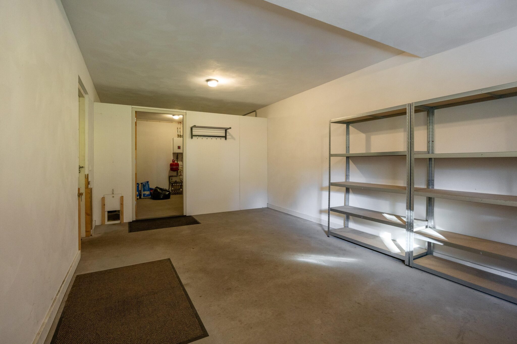 De garage biedt plaats aan één auto en is tevens de locatie van de warmtepomp en de installatie voor de vloerverwarming. De gehele begane grond is afgewerkt met een betegelde vloer.