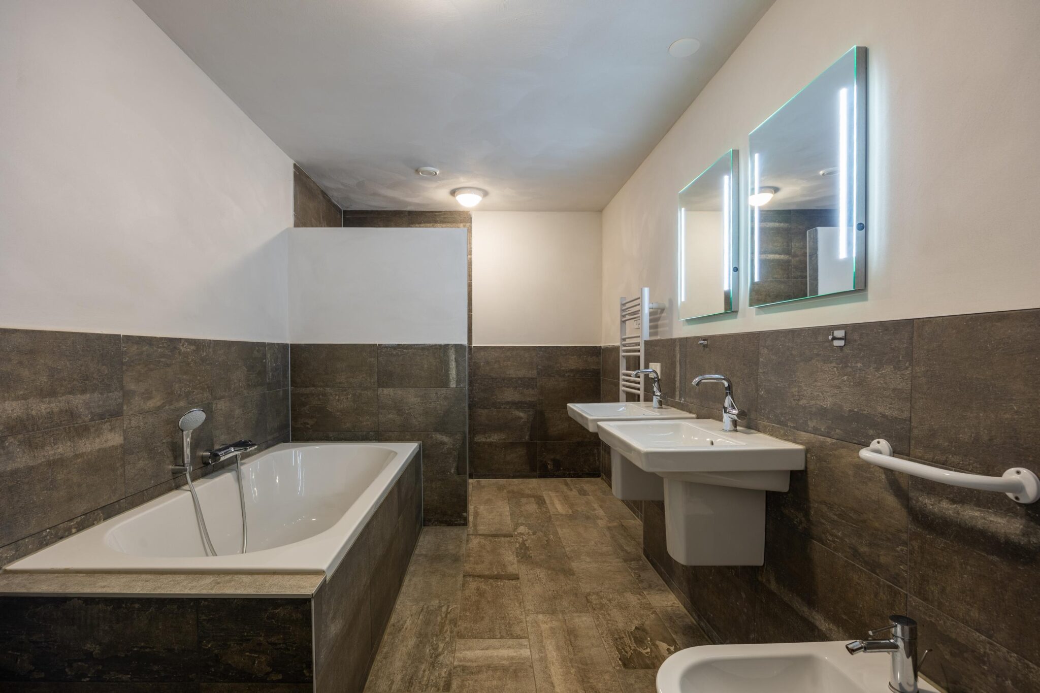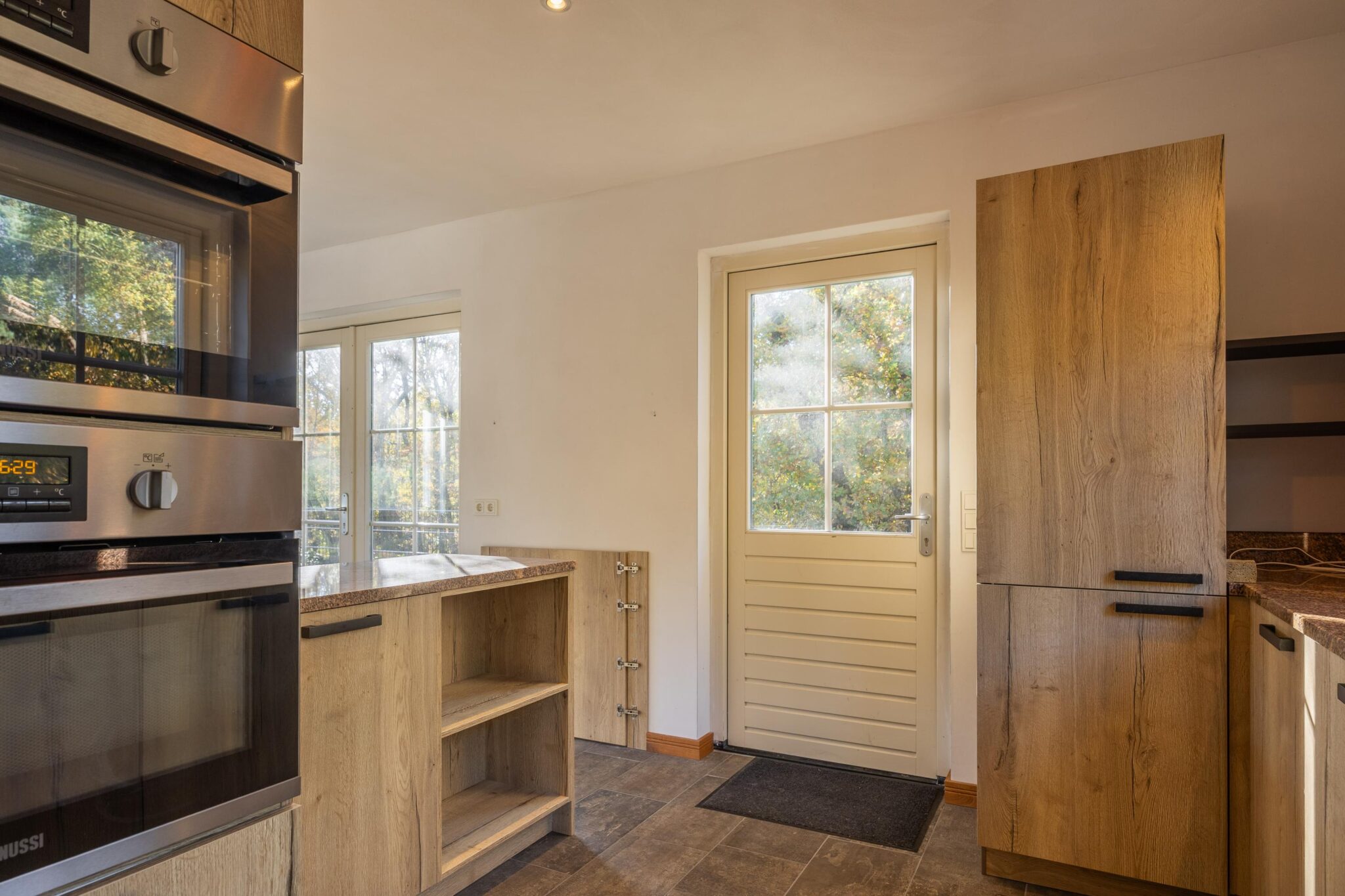 De bijkeuken is praktisch ingericht en voorzien van een inductiekookplaat met vier kookzones, een afzuigkap en een spoelbak. Vanuit hier is er toegang tot een handige opbergruimte met de aansluitingen voor het witgoed, evenals tot de ruime badkamer. De badkamer is uitgerust met een inloopdouche, een ligbad, een toilet, een bidet, dubbele wastafel en een handdoek radiator.