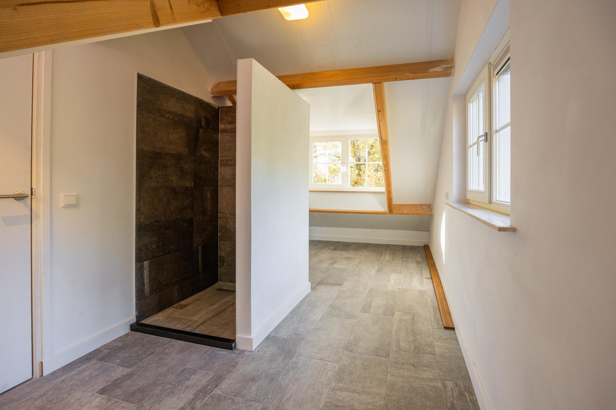 Op de tweede verdieping bevindt zich een tweede badkamer met douche, wastafelmeubel en dakkapel, evenals een derde slaapkamer. Ook deze slaapkamer beschikt over een dakkapel, wat zorgt voor extra lichtinval en een ruimtelijk gevoel.