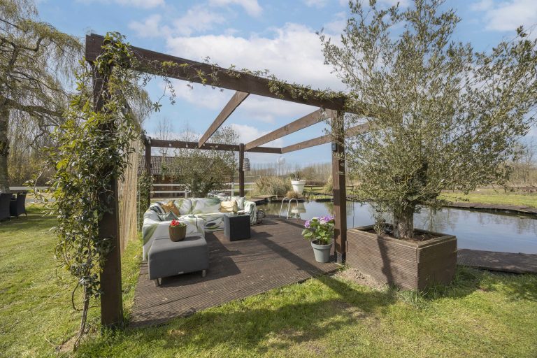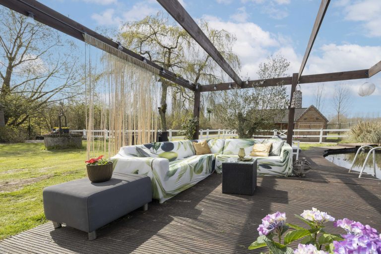 Direct achter de woning bevindt zich een terras met elektrisch zonnescherm, ideaal voor zonnige dagen. De overkapping bij de serre, voorzien van een houtkachel, maakt het mogelijk om ook op koelere momenten comfortabel buiten te zitten. Daarnaast is er een tweede overkapping met schuifdeuren, waar tevens de omvormer van de zonnepanelen is geplaatst.