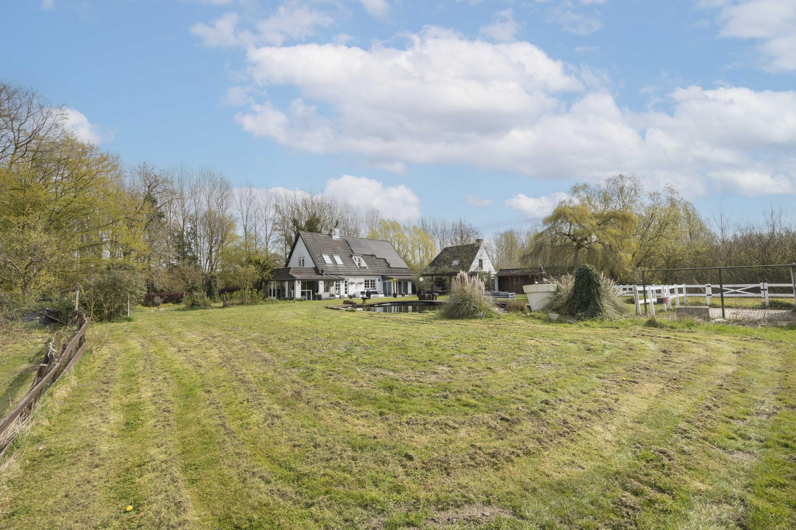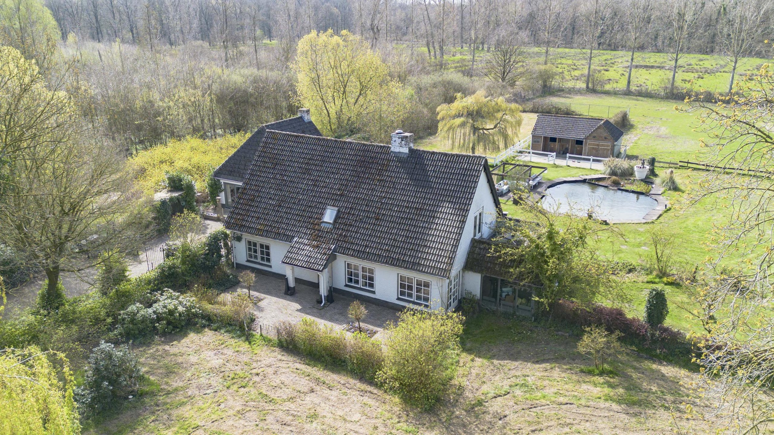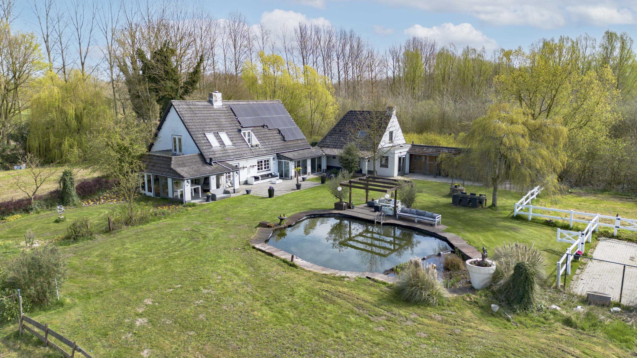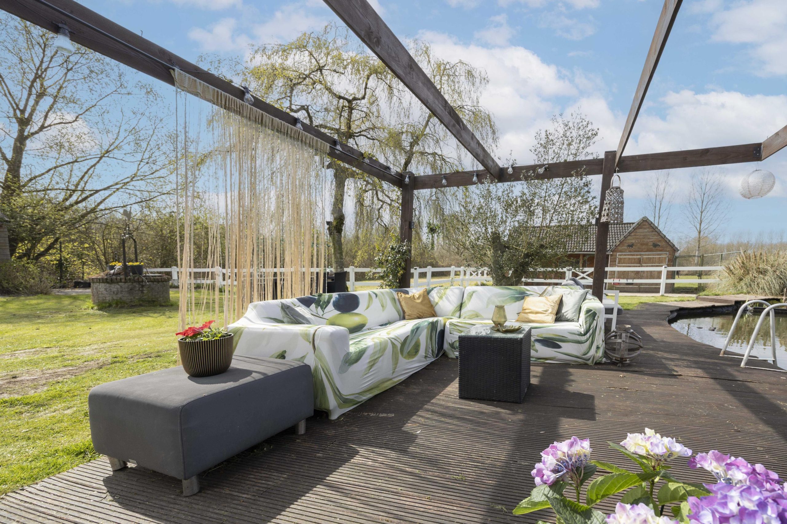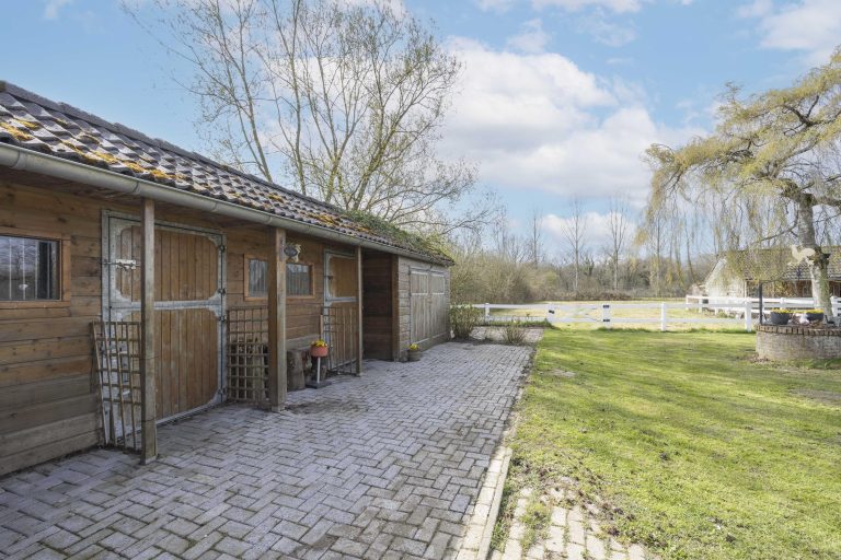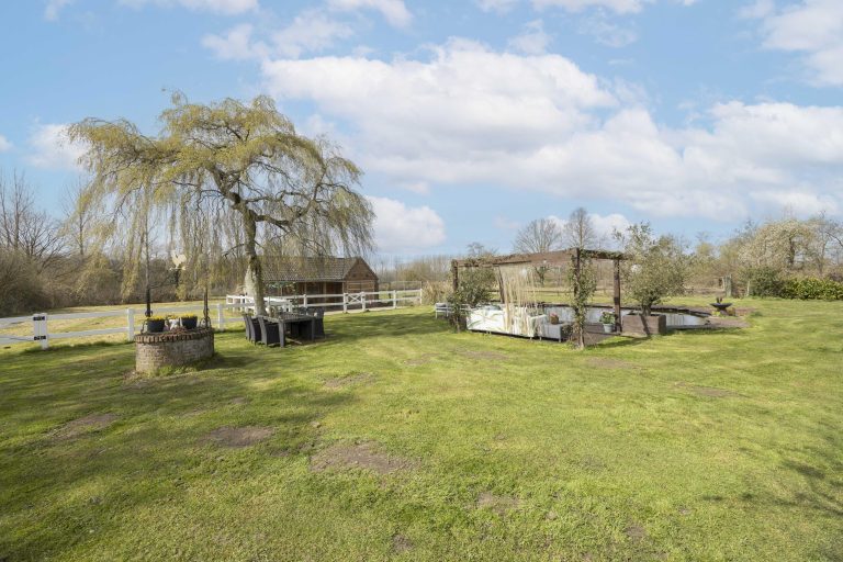 De tuin wordt verder verrijkt door een zwemvijver met pomp met plantenfilter systeem en een aangrenzende pergola, die een sfeervolle plek biedt om te ontspannen. Voor paardenliefhebbers is er een volledig omheinde paardenwei, met daarnaast een paardenstal direct grenzend aan de wei.