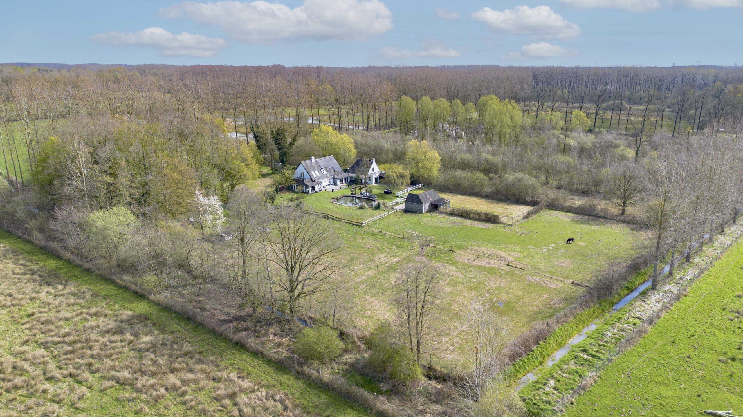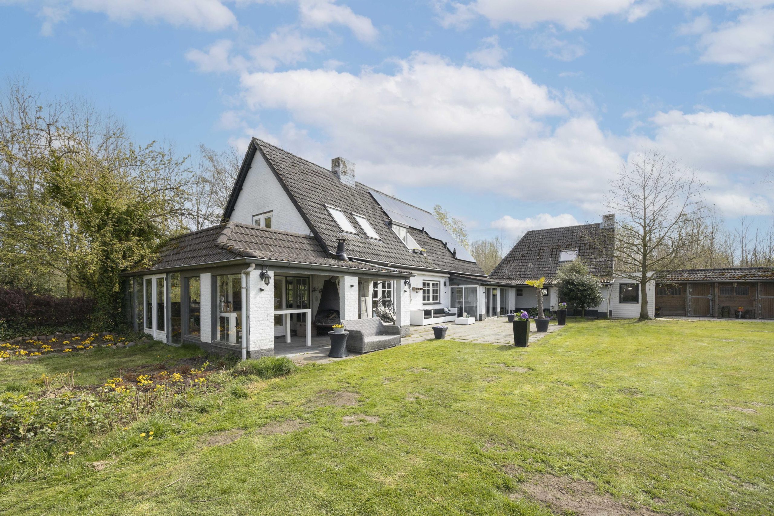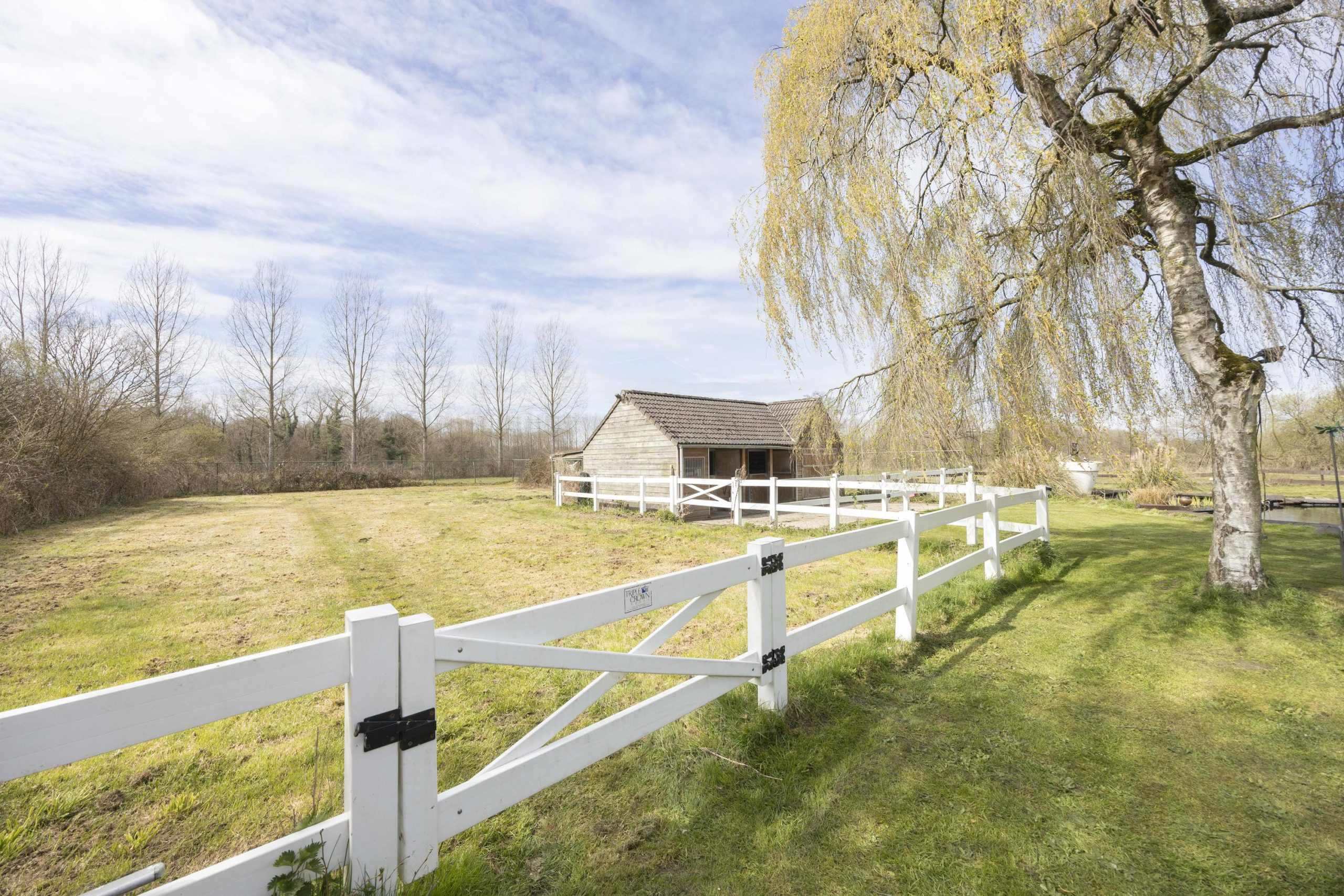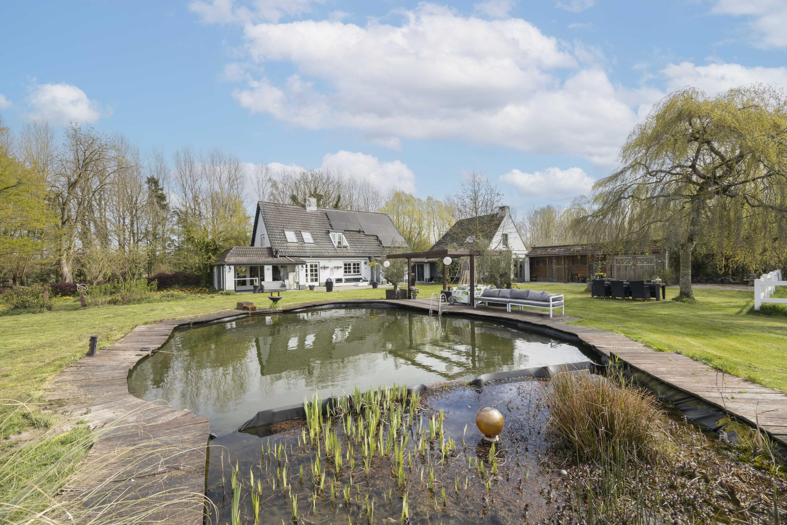De tuin wordt verder verrijkt door een zwemvijver met pomp met plantenfilter systeem en een aangrenzende pergola, die een sfeervolle plek biedt om te ontspannen. Voor paardenliefhebbers is er een volledig omheinde paardenwei, met daarnaast een paardenstal direct grenzend aan de wei.