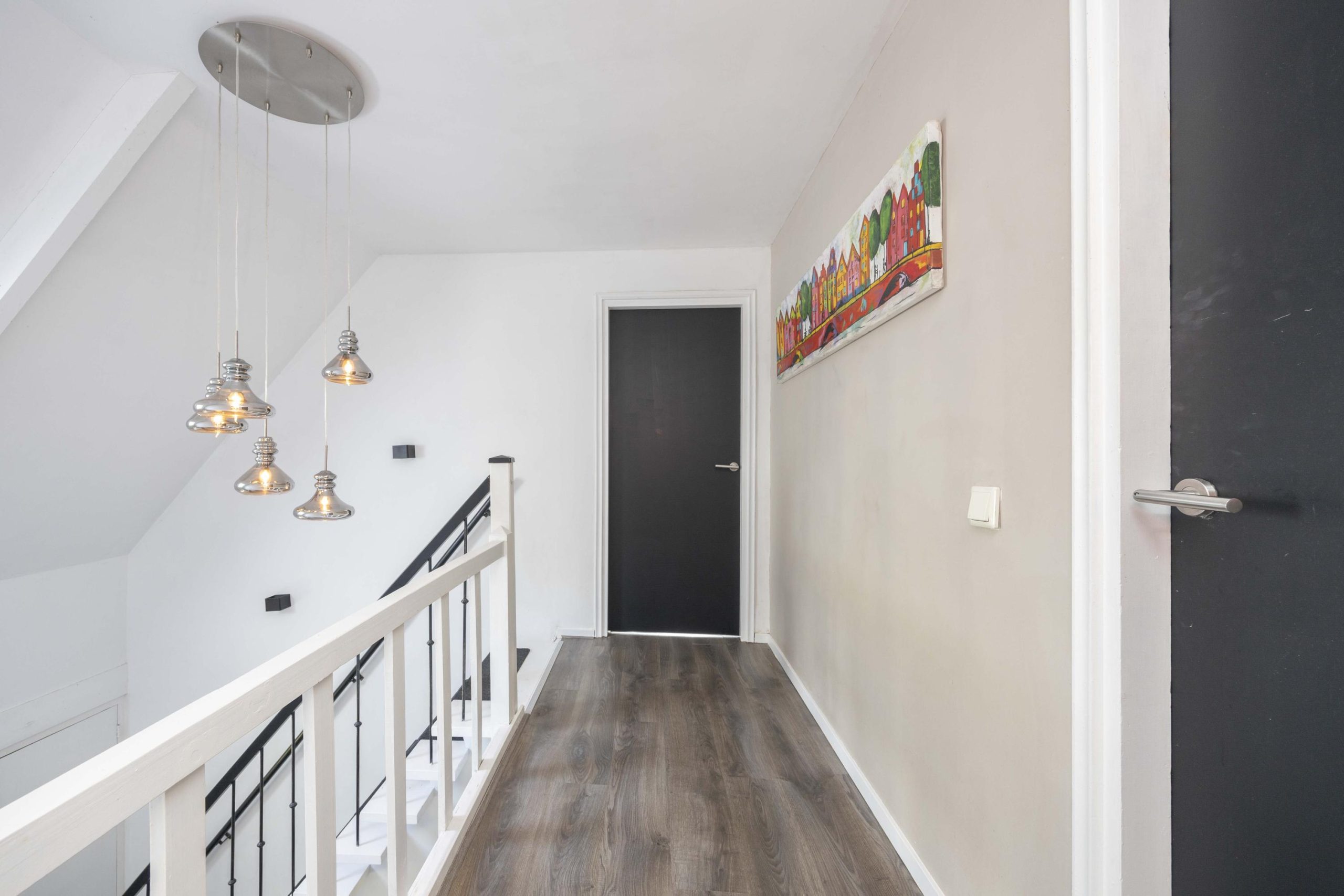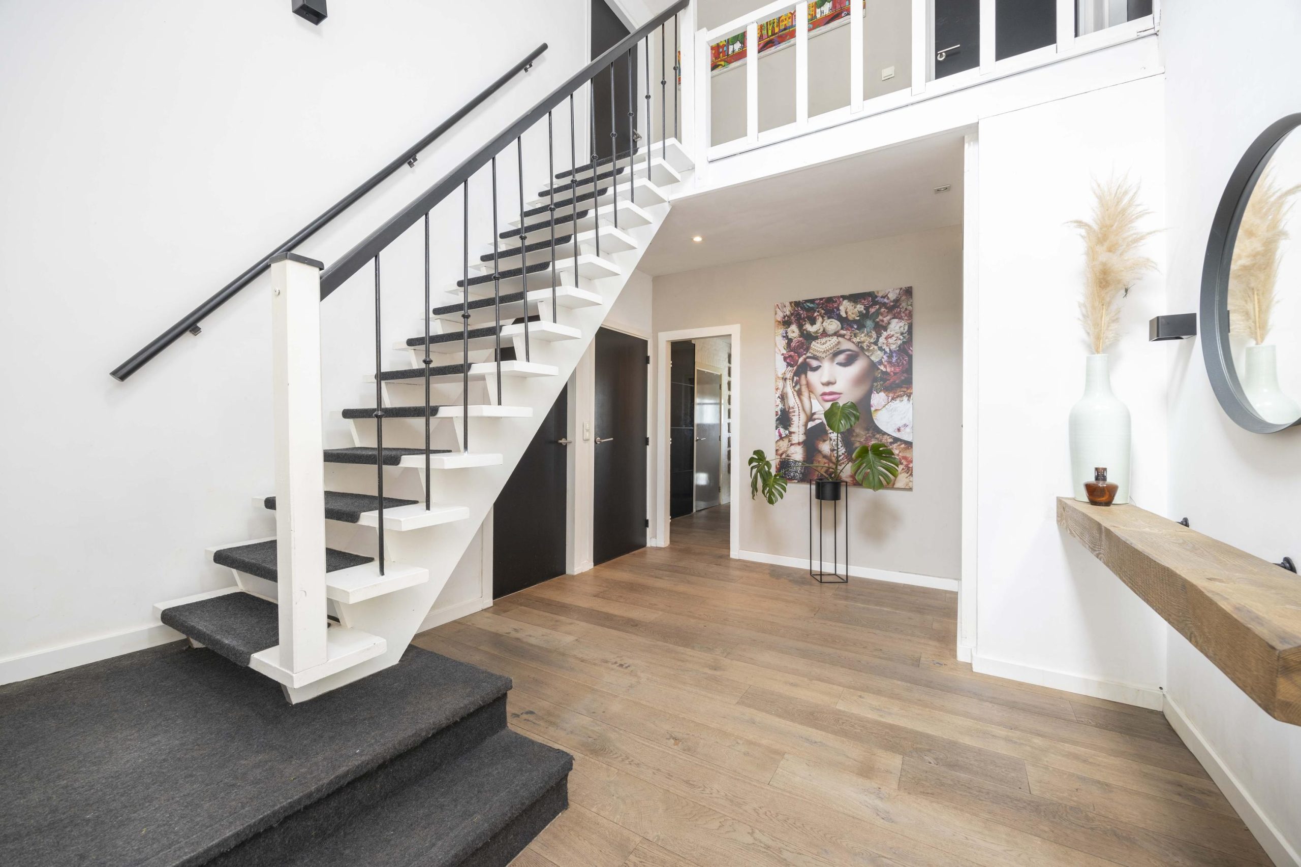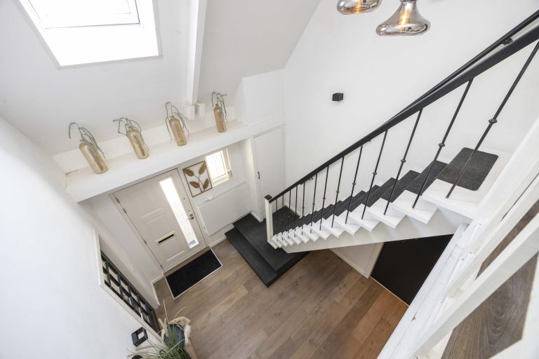 De trapopgang naar de eerste verdieping verloopt in twee delen. Na het eerste gedeelte is een plateau met daaraan de gemoderniseerde meterkast. De overloop geeft toegang tot twee slaapkamers en de badkamer en vormt een centrale verbinding tussen de verschillende ruimtes.