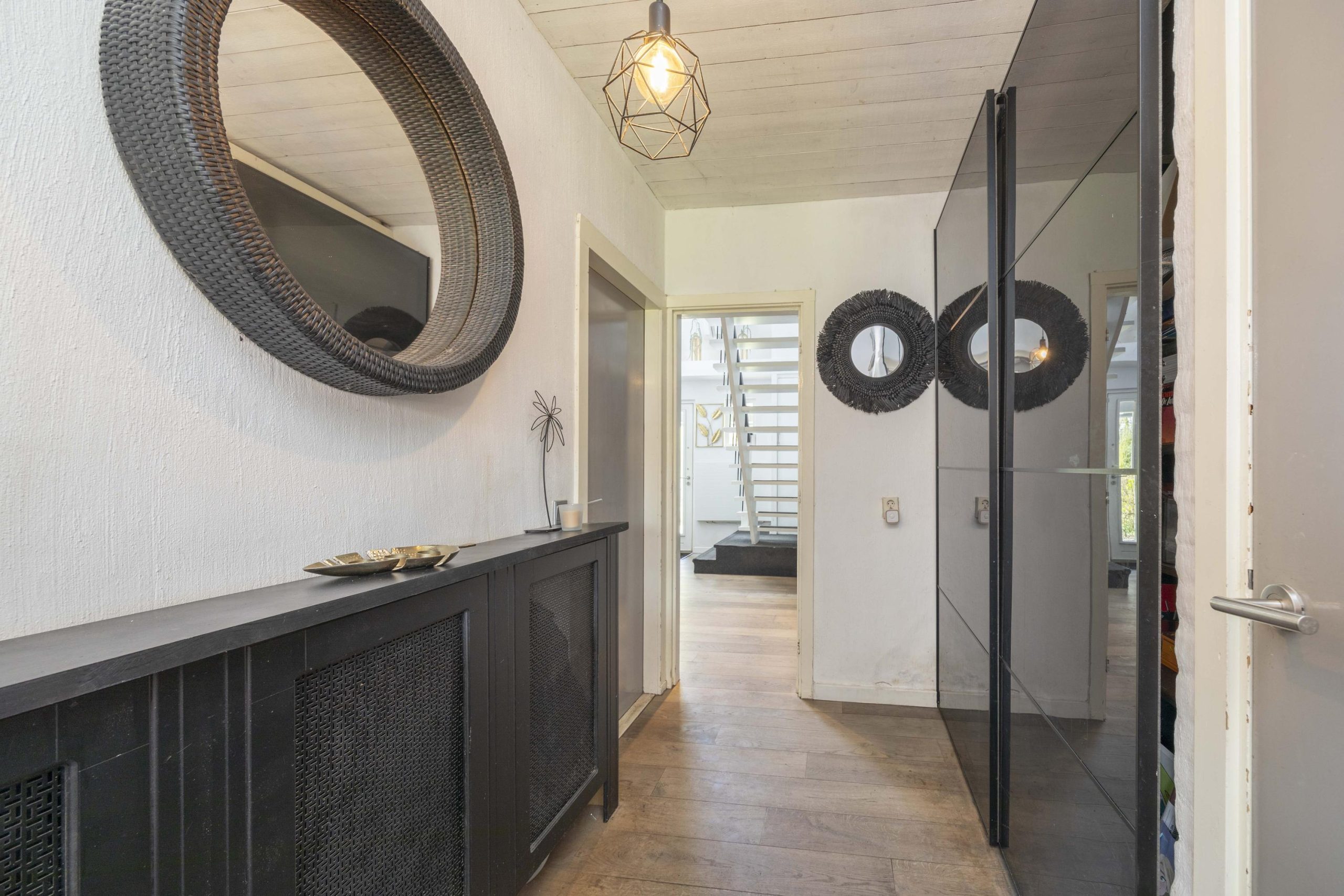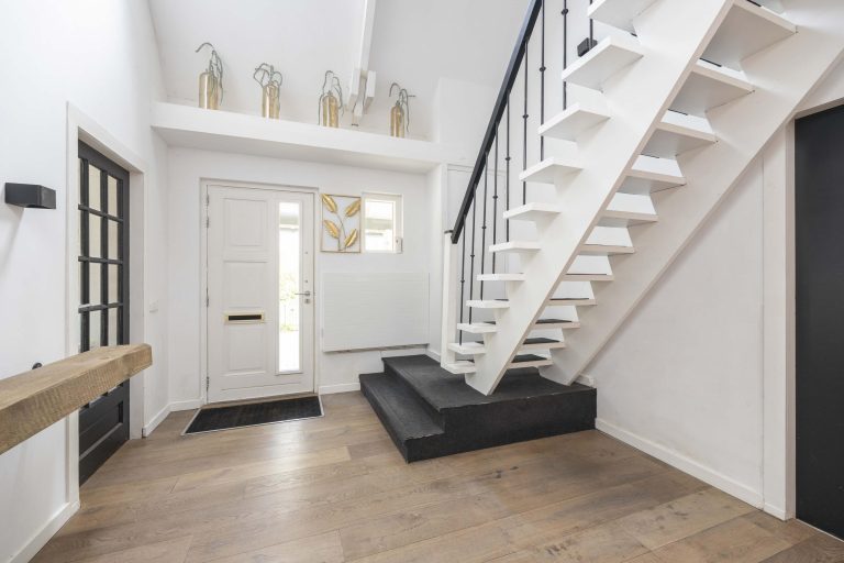 Via de entree aan de voorzijde betreedt u deze vrijstaande woning. De hal met vide vormt een ruimtelijke ontvangst met directe toegang tot de woonkamer en de trapopgang naar de eerste verdieping. Praktisch is de vaste kast voor de garderobe, terwijl de houten vloer direct een warme basis legt. In de hal bevindt zich tevens het volledig betegelde toilet, uitgevoerd met een hangend closet, fonteintje en mechanische afzuiging.