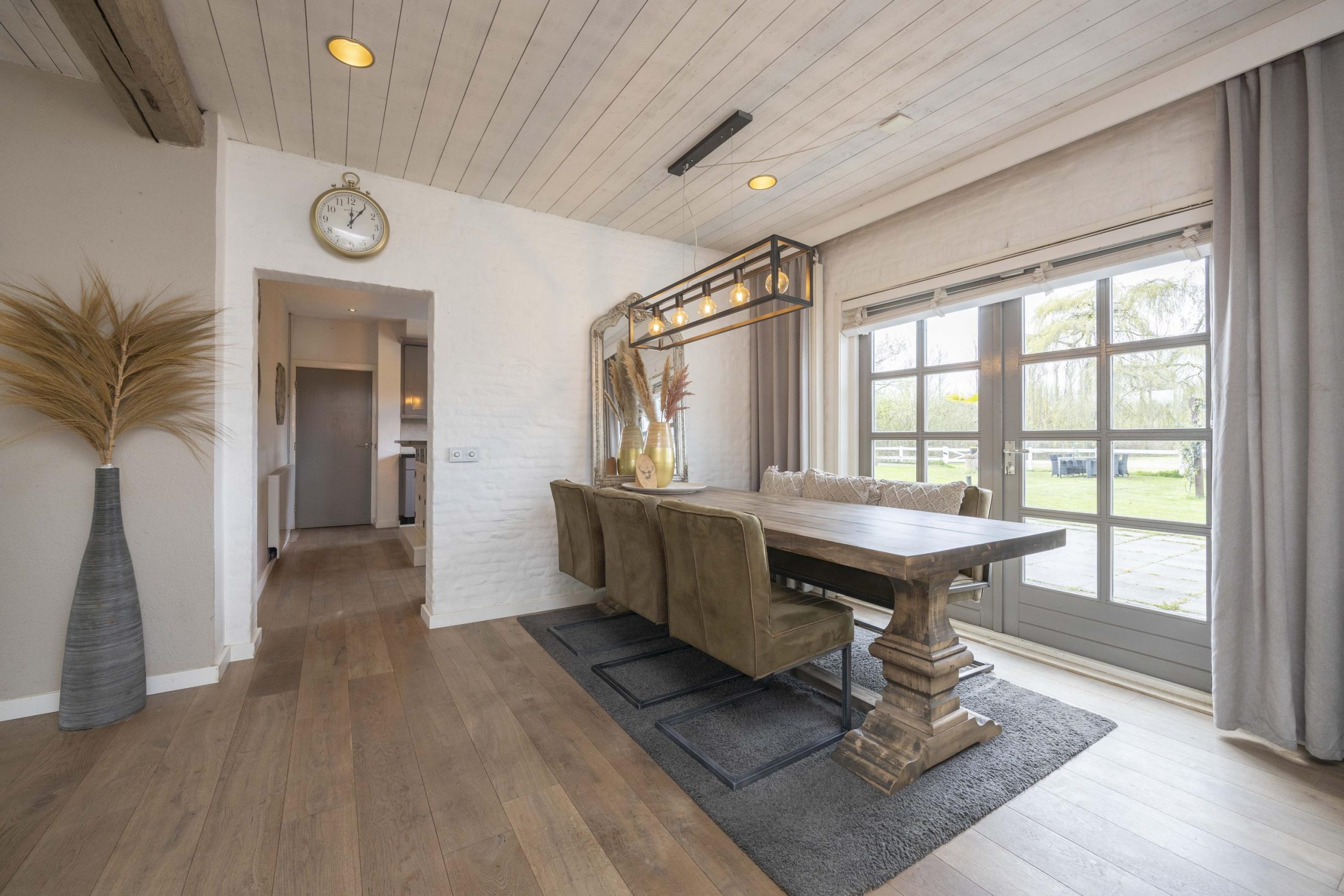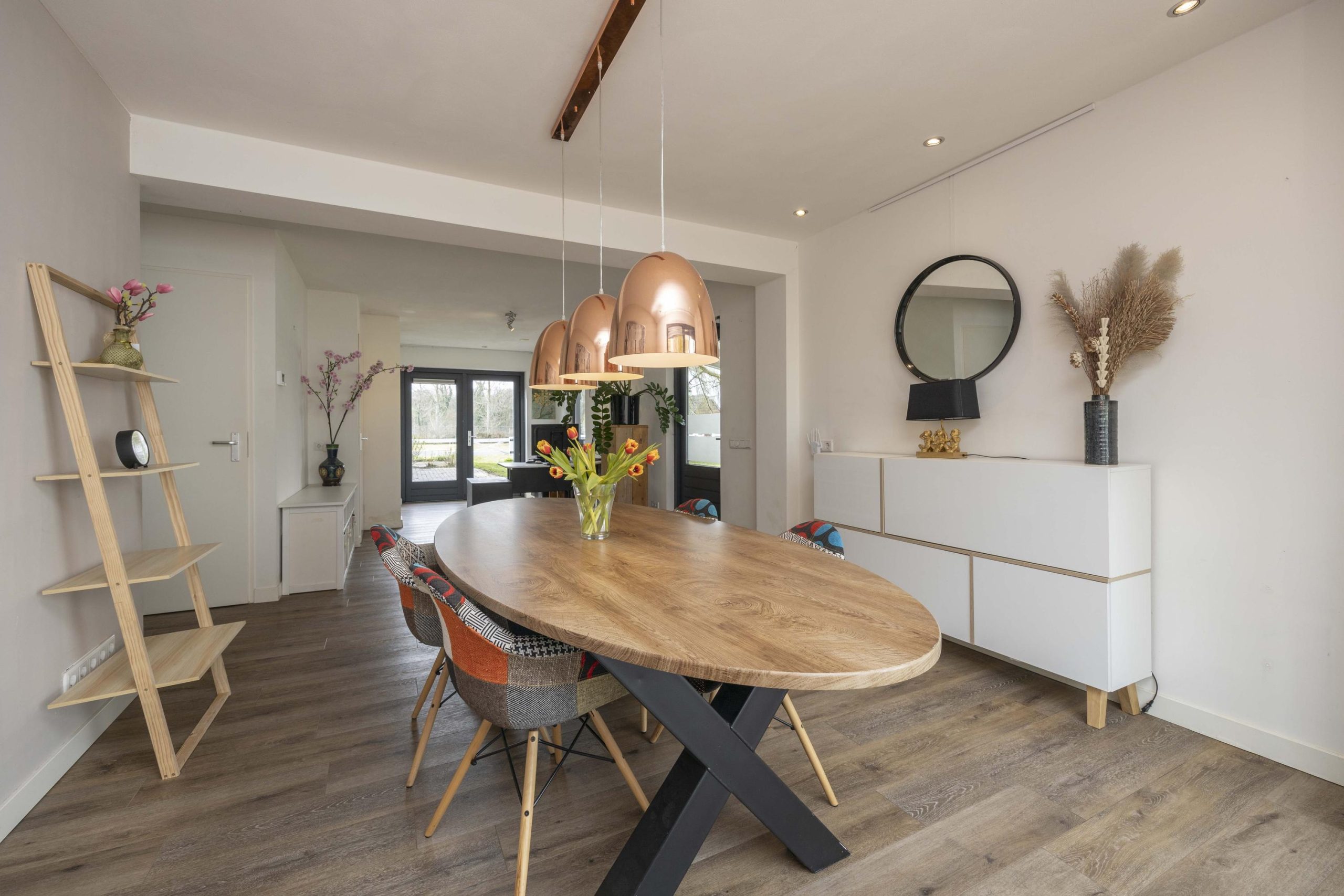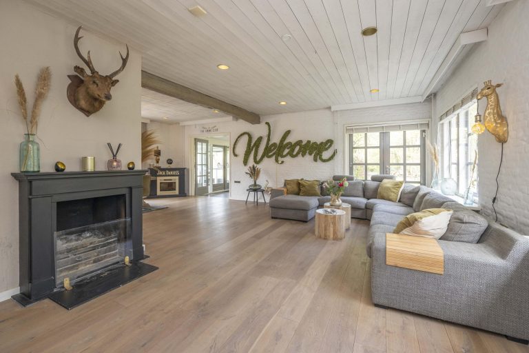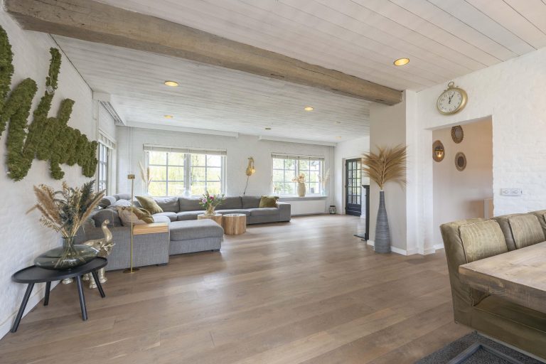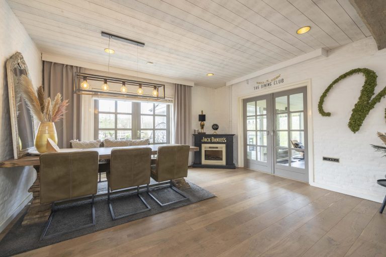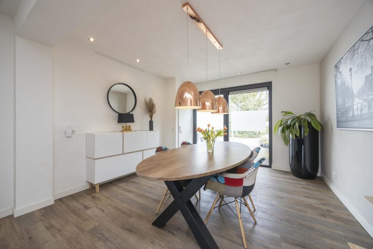 De woonkamer is licht en sfeervol, met grote raampartijen voorzien van roedeverdeling. De houten vloer loopt hier door en versterkt het warme karakter van de ruimte. De zithoek is ingericht rond de open haard en elektrische haard, wat zorgt voor een aangename sfeer, terwijl radiatoren het comfort waarborgen. Aan de tuinzijde bevindt zich de eethoek met uitzicht op het groen. Dubbele deuren naar de achtertuin zorgen voor een prettige verbinding met buiten.