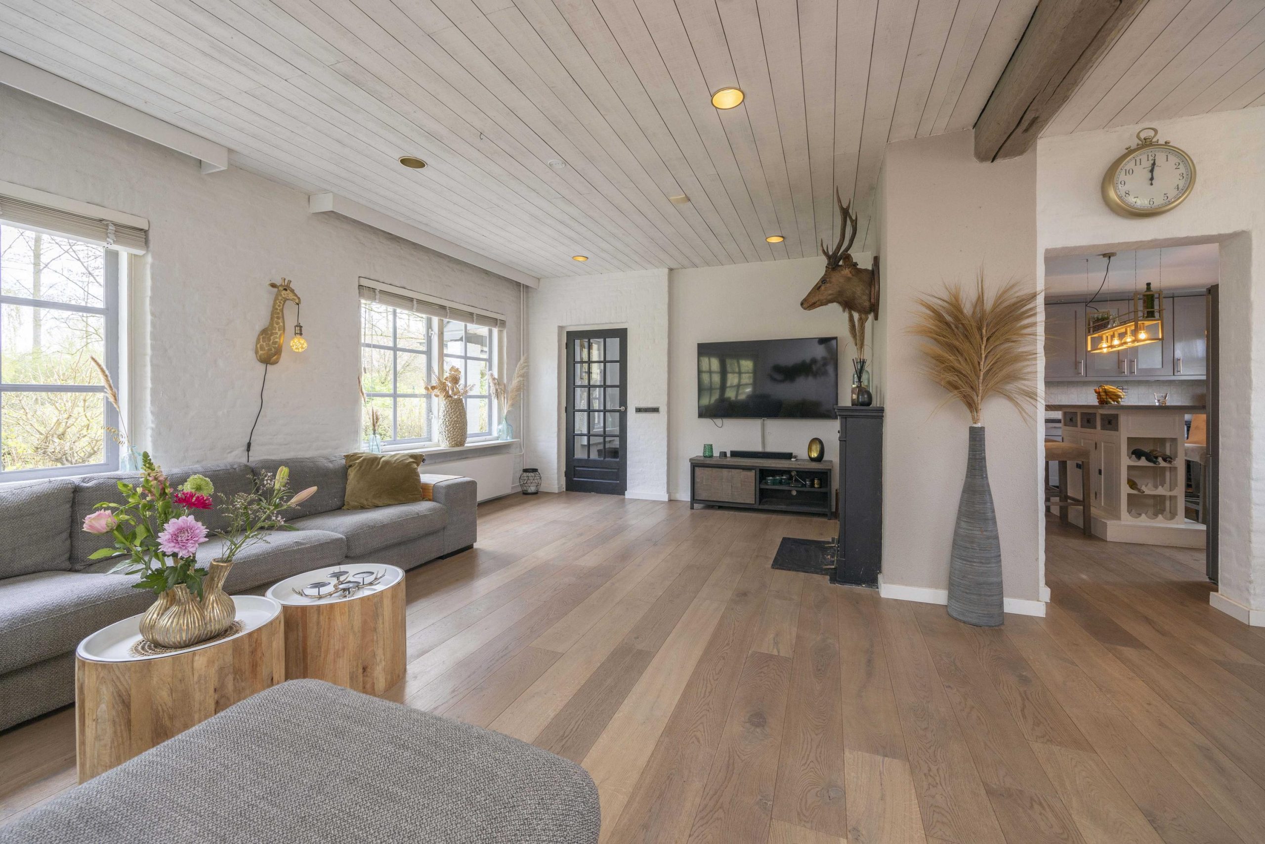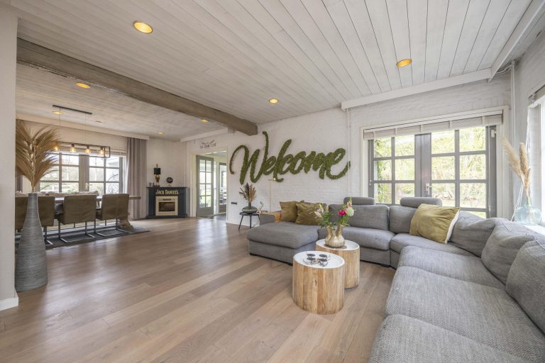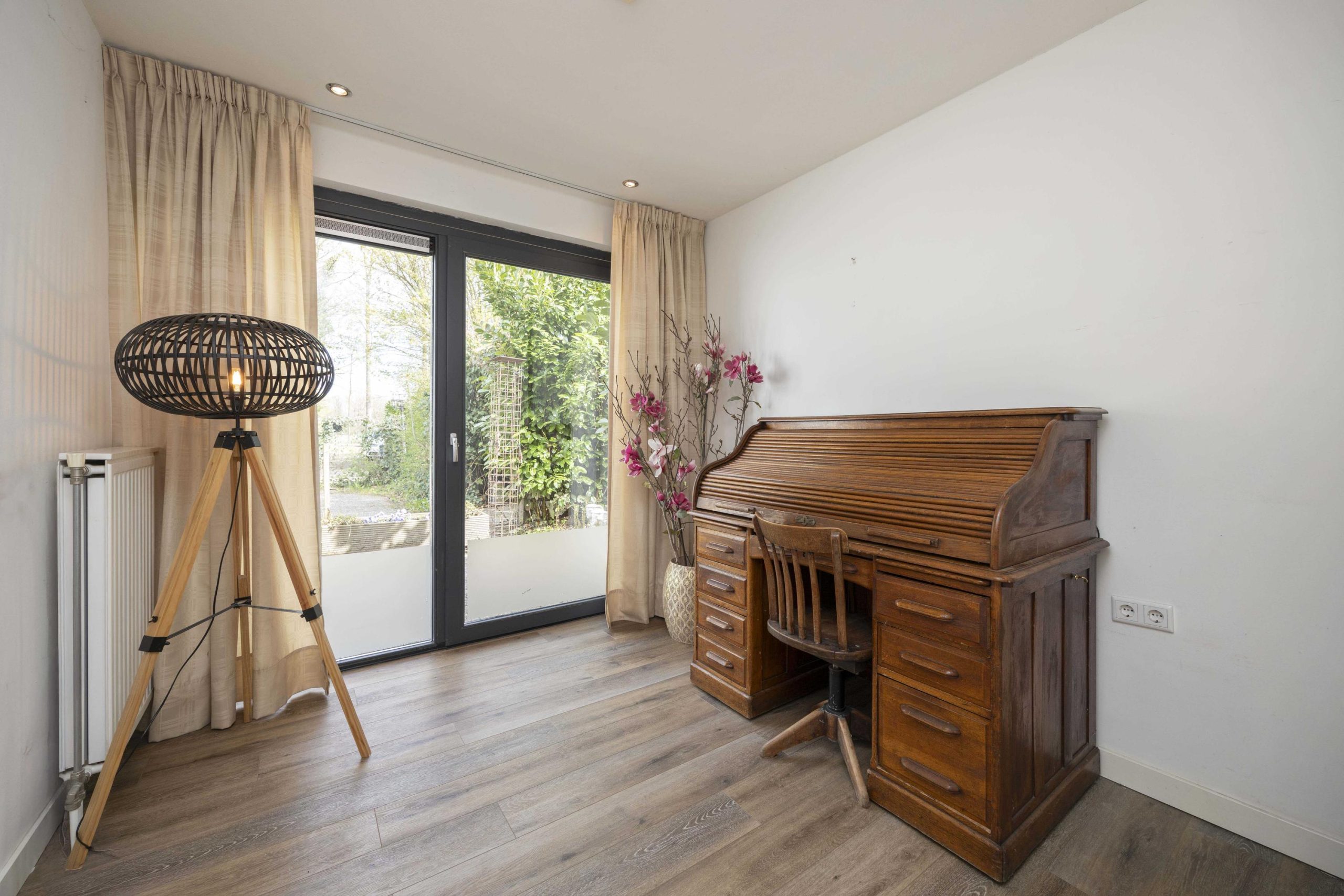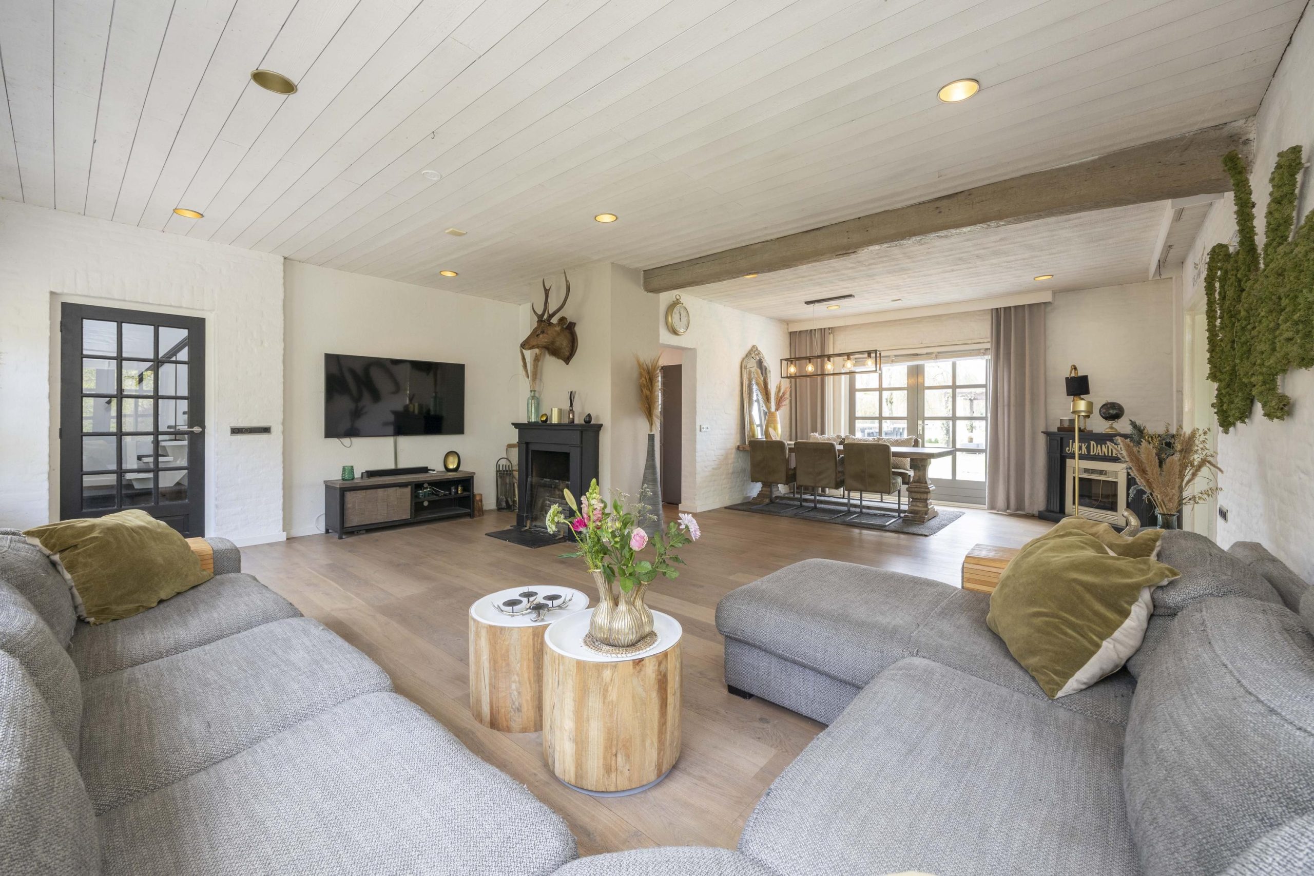 De woonkamer is licht en sfeervol, met grote raampartijen voorzien van roedeverdeling. De houten vloer loopt hier door en versterkt het warme karakter van de ruimte. De zithoek is ingericht rond de open haard en elektrische haard, wat zorgt voor een aangename sfeer, terwijl radiatoren het comfort waarborgen. Aan de tuinzijde bevindt zich de eethoek met uitzicht op het groen. Dubbele deuren naar de achtertuin zorgen voor een prettige verbinding met buiten.