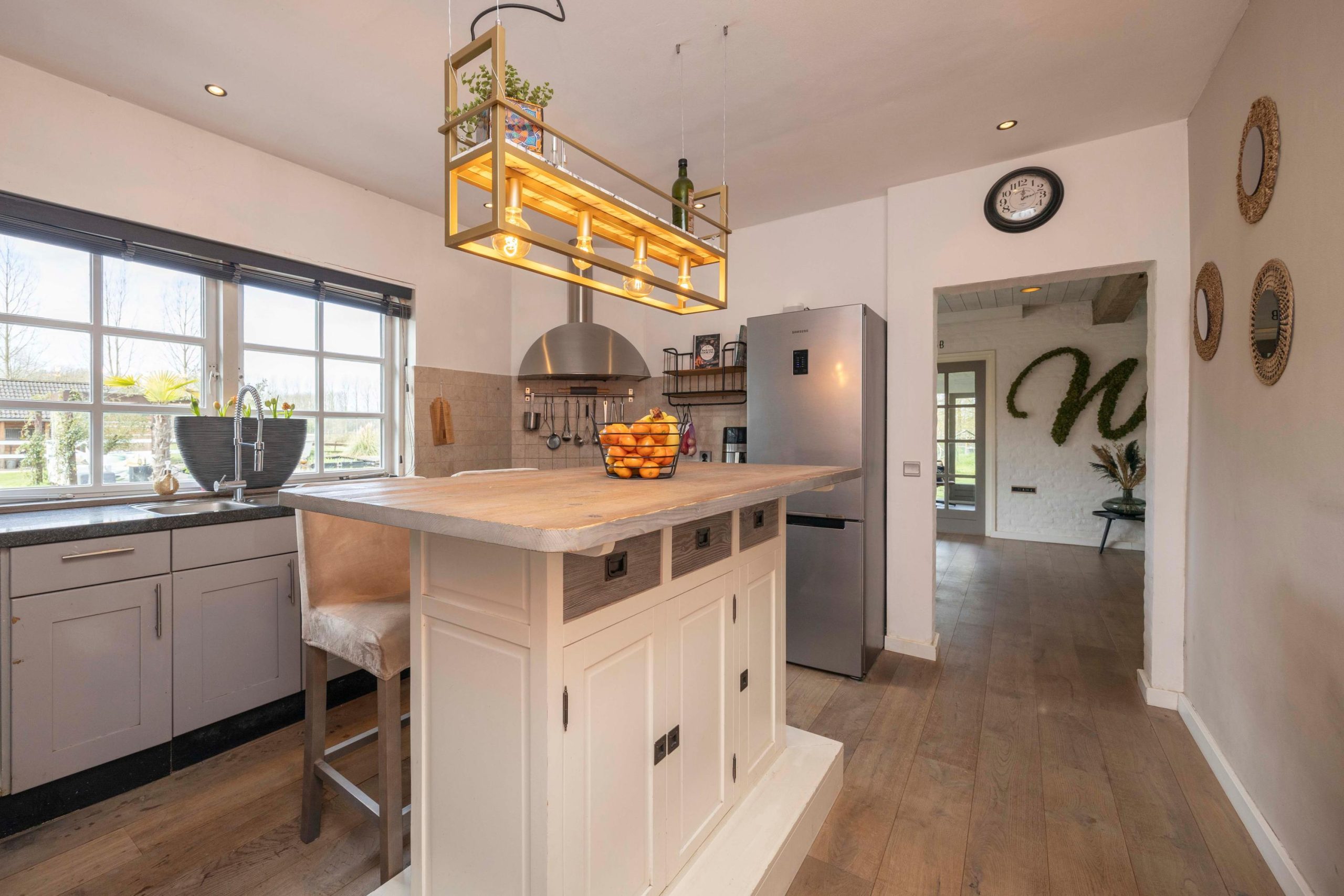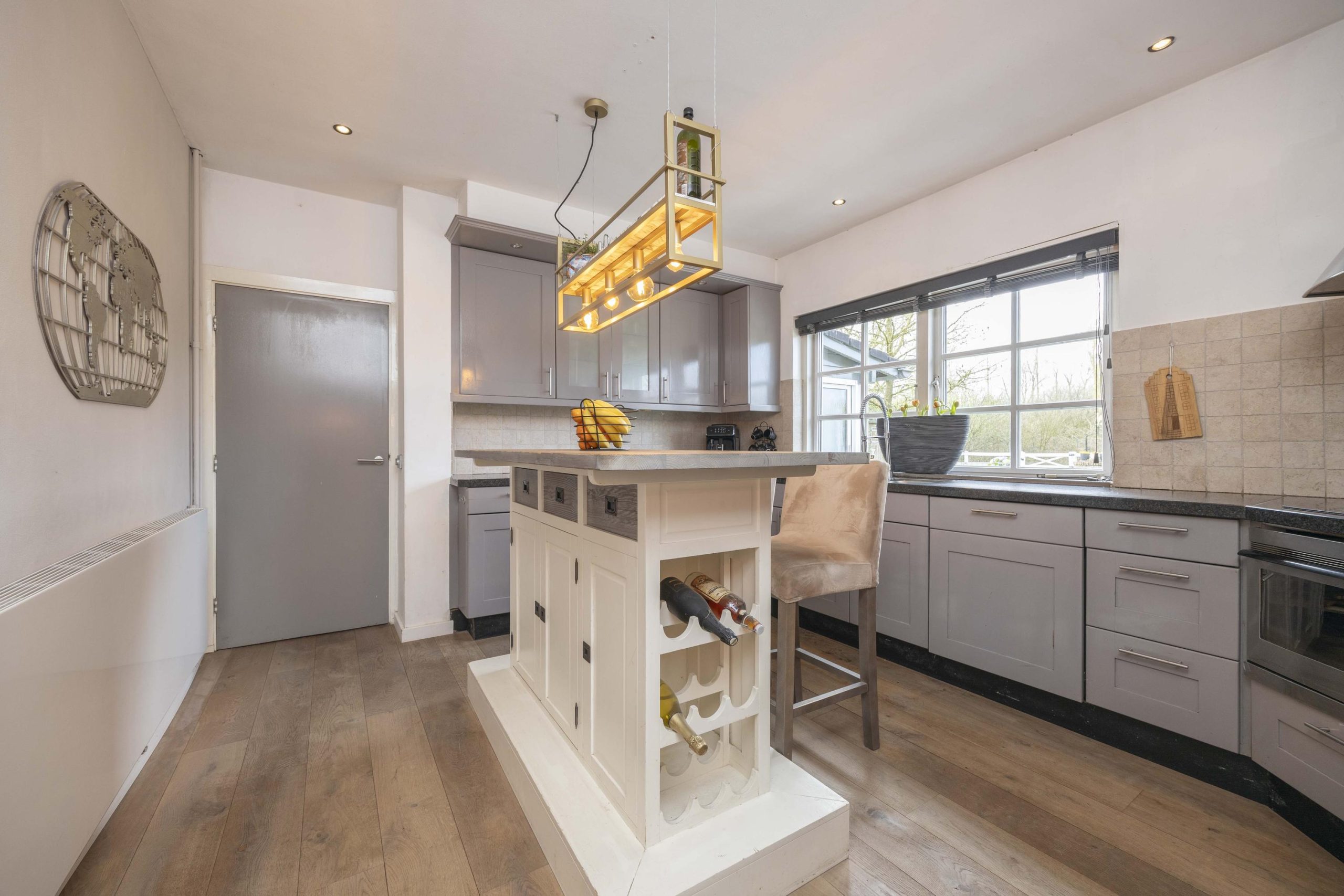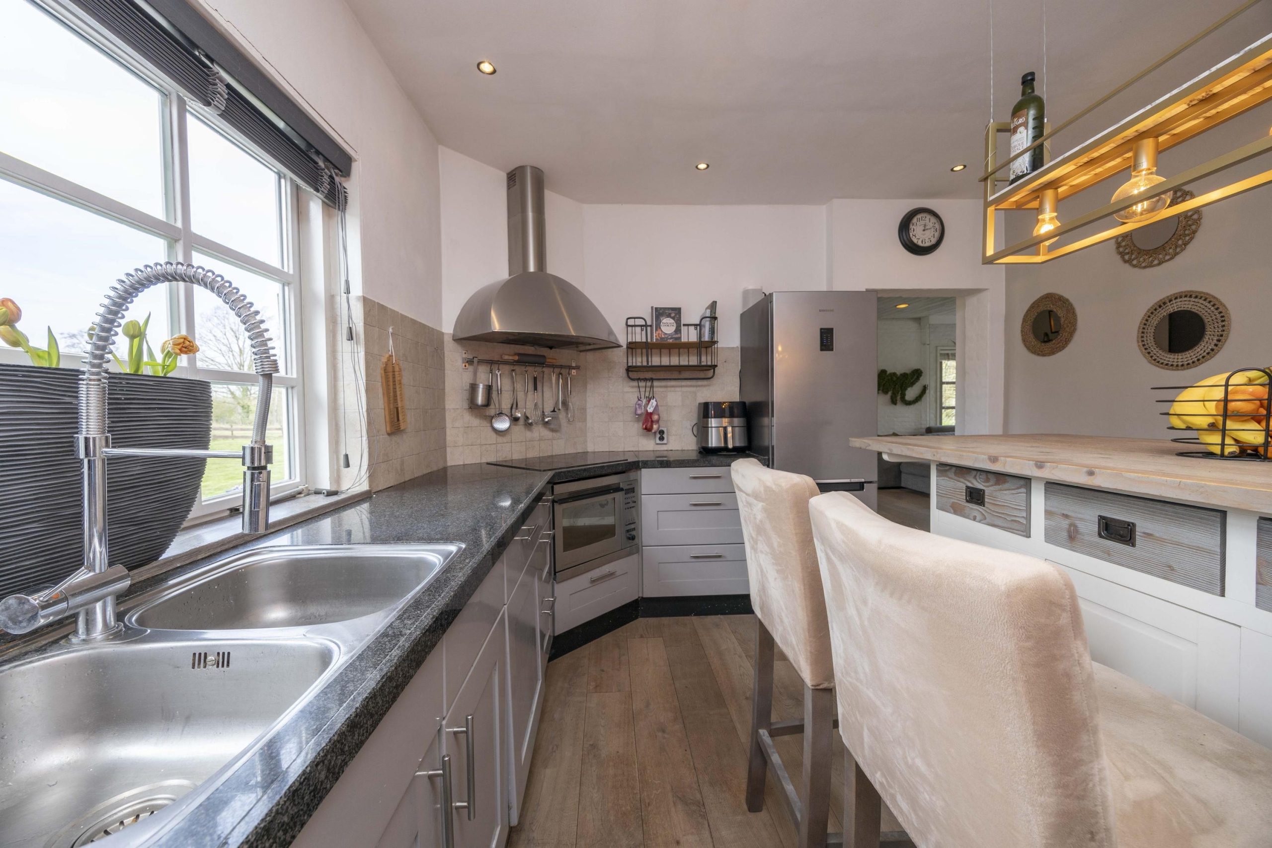 Een open doorgang leidt vanuit de woonkamer naar de keuken, uitgevoerd in een praktische U-opstelling. De keuken is uitgerust met een keramische kookplaat, afzuigkap, combi-oven, vaatwasser en een losse koel-/vriescombinatie. Onder- en bovenkasten bieden volop bergruimte. Centraal in de keuken staat een bartafel met extra opbergruimte en een informele zitplek met hoge krukken. Ook hier zorgt de houten vloer voor eenheid.