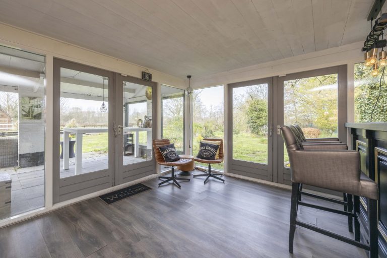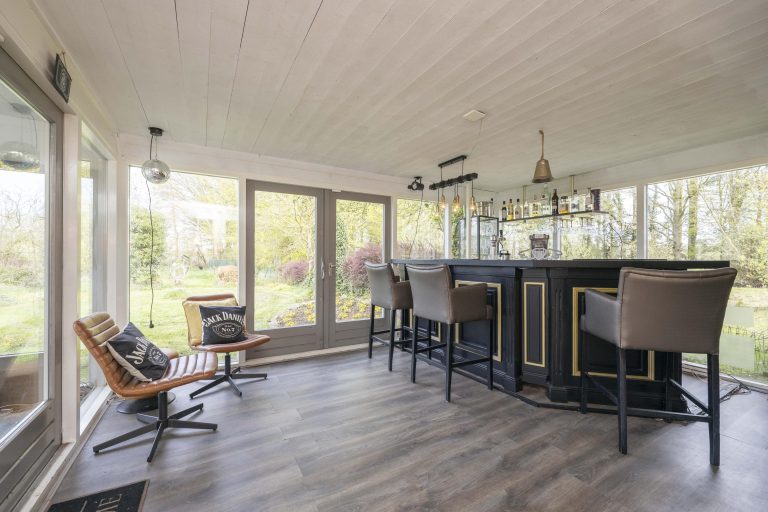 Aangrenzend aan de woonkamer bevindt zich de serre, momenteel ingericht als bar. Deze ruimte is voorzien van een laminaatvloer en grote glaspartijen. Door de ligging en verbinding met zowel buiten als binnen is het een flexibele ruimte die naar wens kan worden gebruikt.
