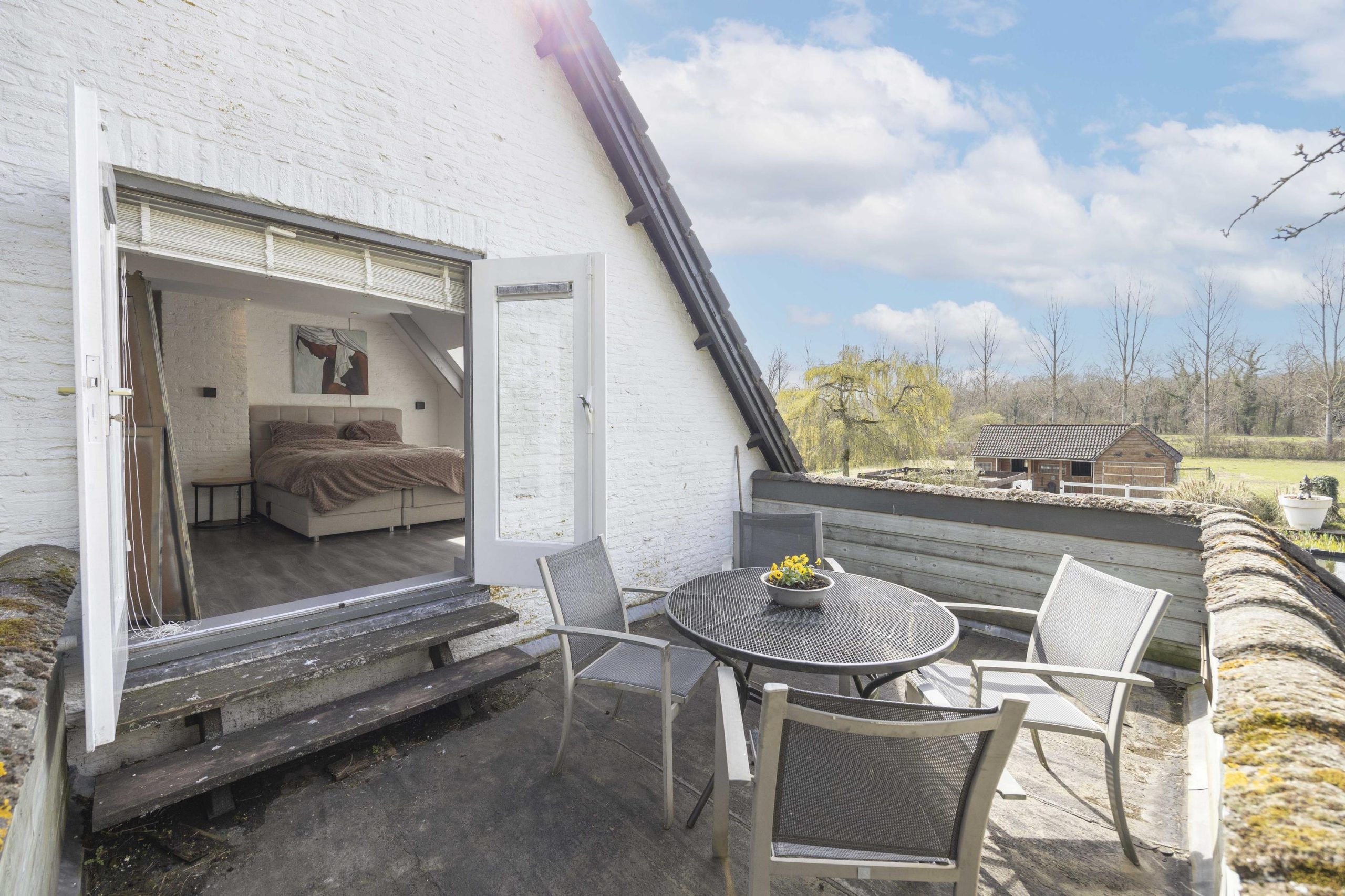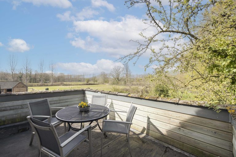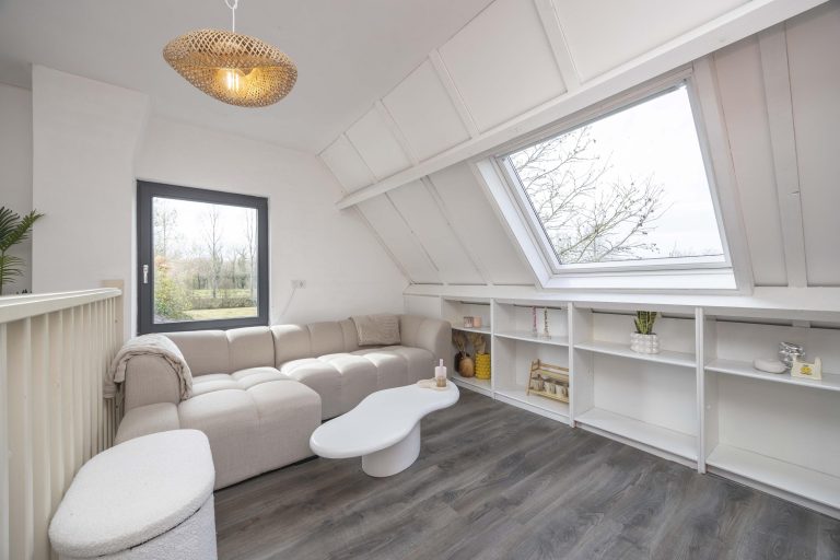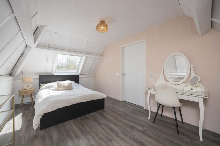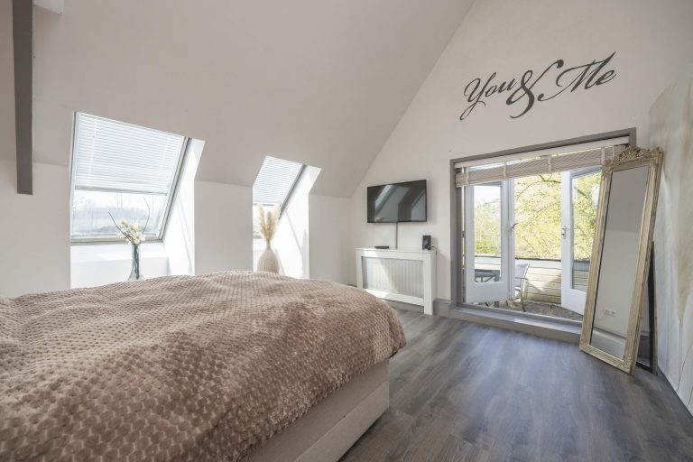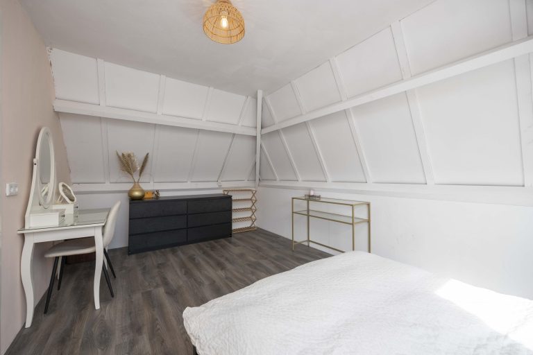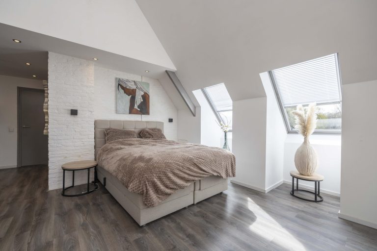 De hoofdslaapkamer is een indrukwekkende ruimte met een hoge nok, wat zorgt voor een extra ruimtelijk gevoel. Twee dakramen aan de achterzijde laten prettig daglicht binnen en bieden zicht op de tuin. Via dubbele deuren is er directe toegang tot een dakterras, een fijne manier om ook op de verdieping te genieten van het buitenleven.