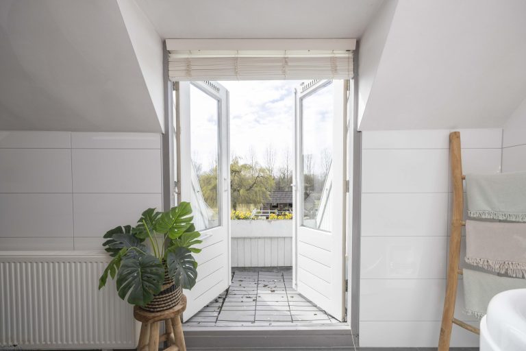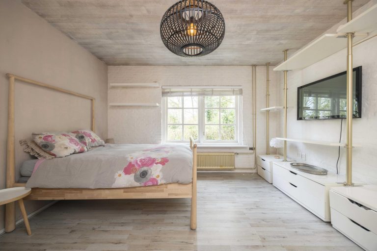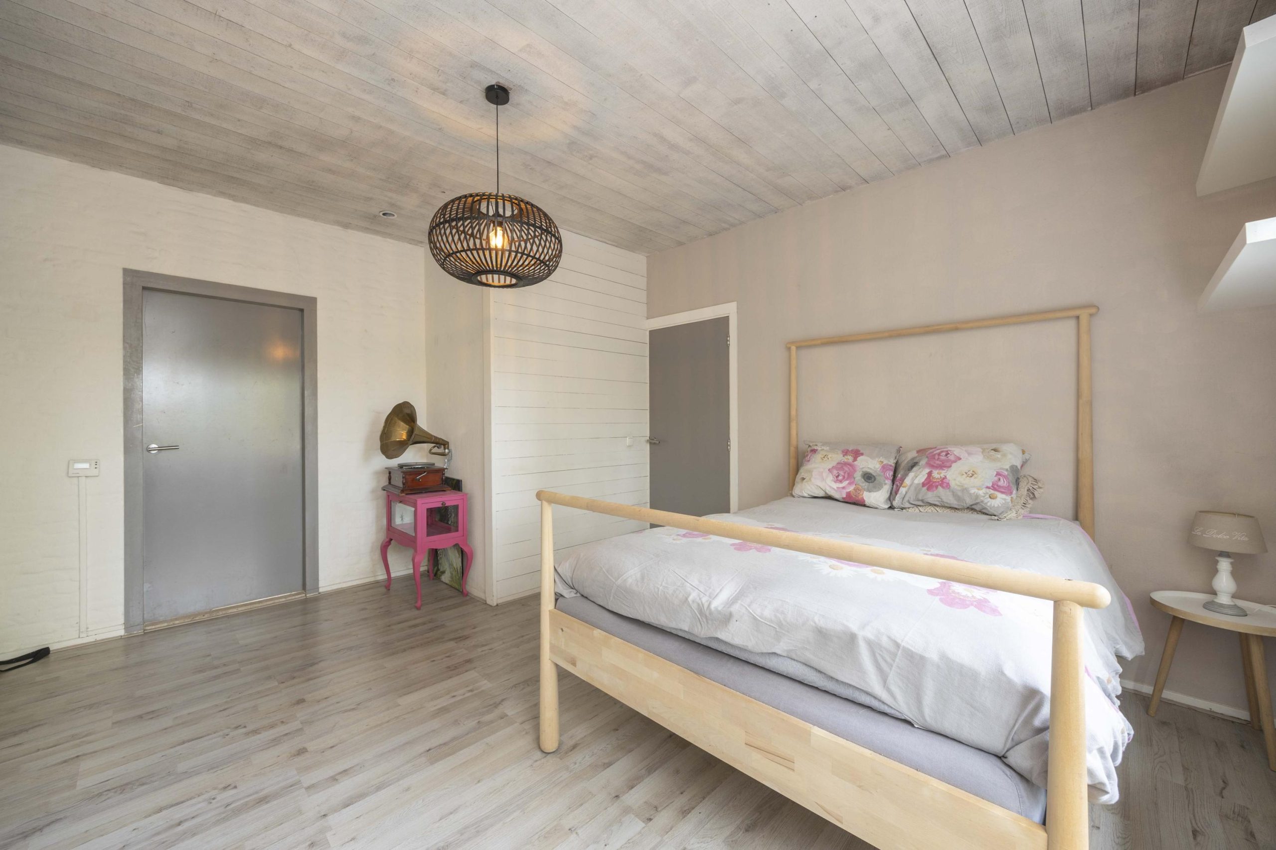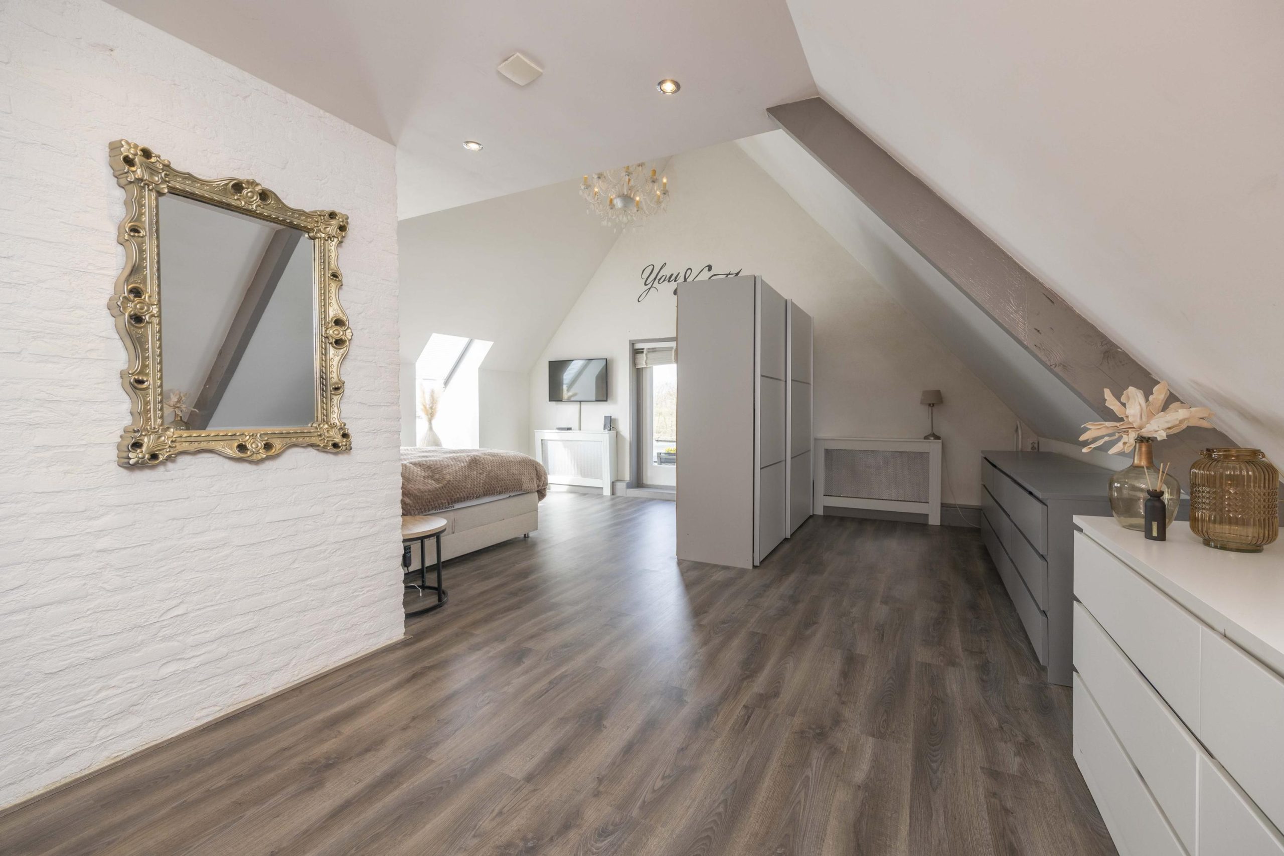 De hoofdslaapkamer is een indrukwekkende ruimte met een hoge nok, wat zorgt voor een extra ruimtelijk gevoel. Twee dakramen aan de achterzijde laten prettig daglicht binnen en bieden zicht op de tuin. Via dubbele deuren is er directe toegang tot een dakterras, een fijne manier om ook op de verdieping te genieten van het buitenleven.