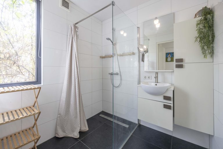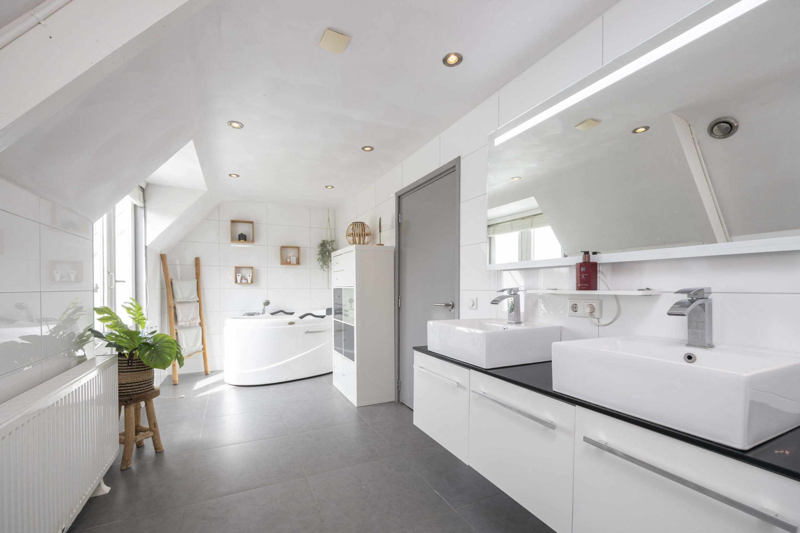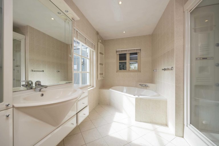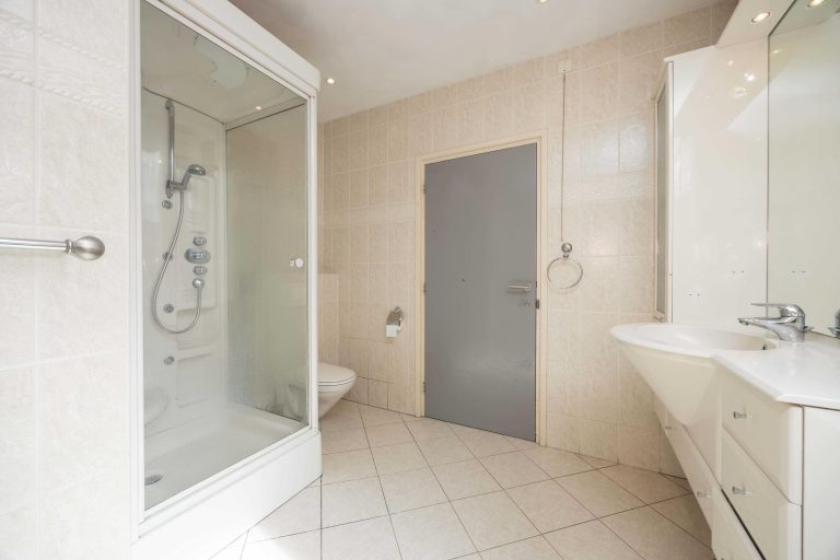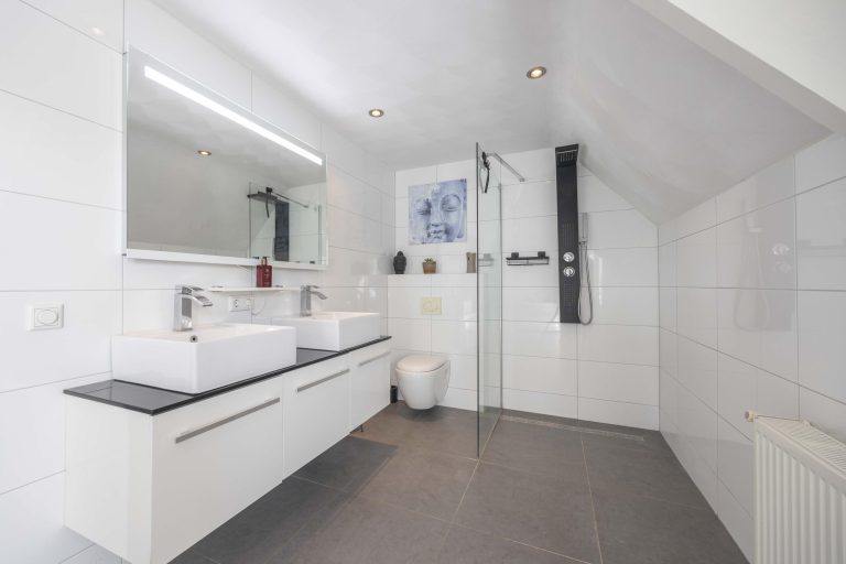 De badkamer is volledig betegeld en uitgevoerd met inbouwspots. De ruimte beschikt over een vrijstaand bad, inloopdouche, dubbele wastafel met meubel en een hangend toilet. Ook vanuit de badkamer is er toegang tot een balkon, waar u geniet van uitzicht over de achtertuin en het omliggende landschap.