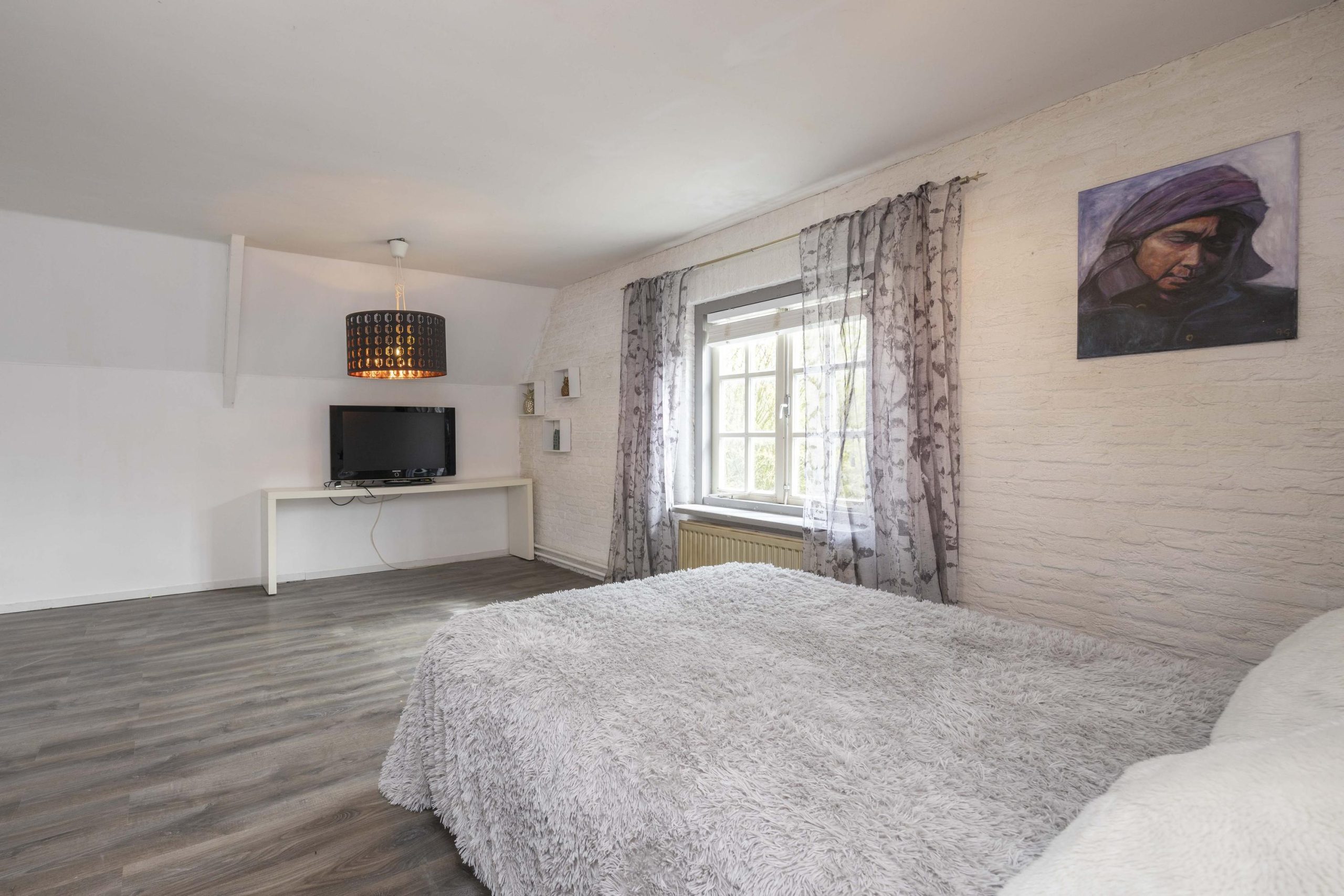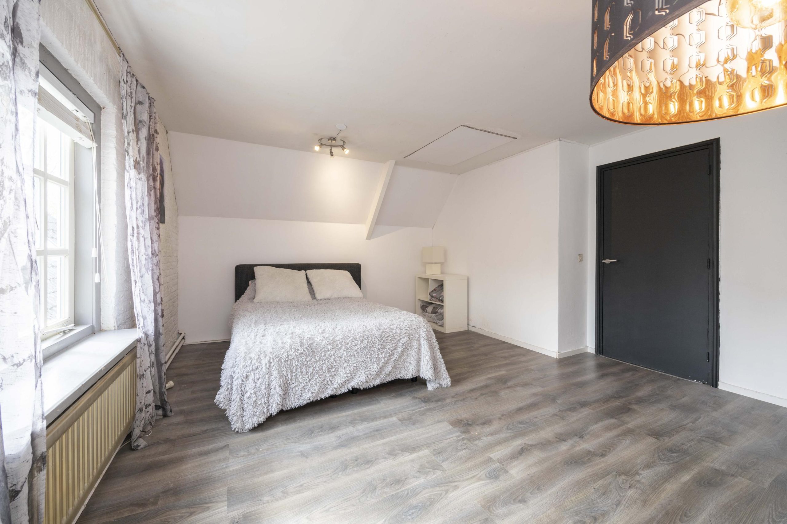 De tweede slaapkamer, gelegen aan de linkerzijde, is afgewerkt met een laminaatvloer en voorzien van houten kozijnen met dubbel glas en roedeverdeling. Vanuit deze kamer is via een vlizotrap de vliering bereikbaar, door enkele aanpassingen door te voeren kan hier een praktische bergruimte worden gecreëerd.
