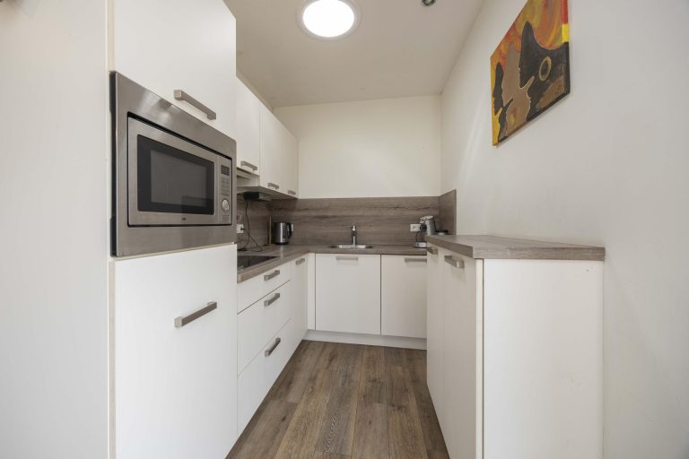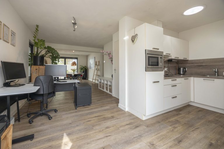 De keuken is compleet uitgevoerd en voorzien van een koelkast, inductiekookplaat, afzuigkap, combi- oven en vaatwasser, met zowel onder- als bovenkasten voor voldoende bergruimte. Zowel de woonkamer als de keuken zijn voorzien van vloerverwarming.