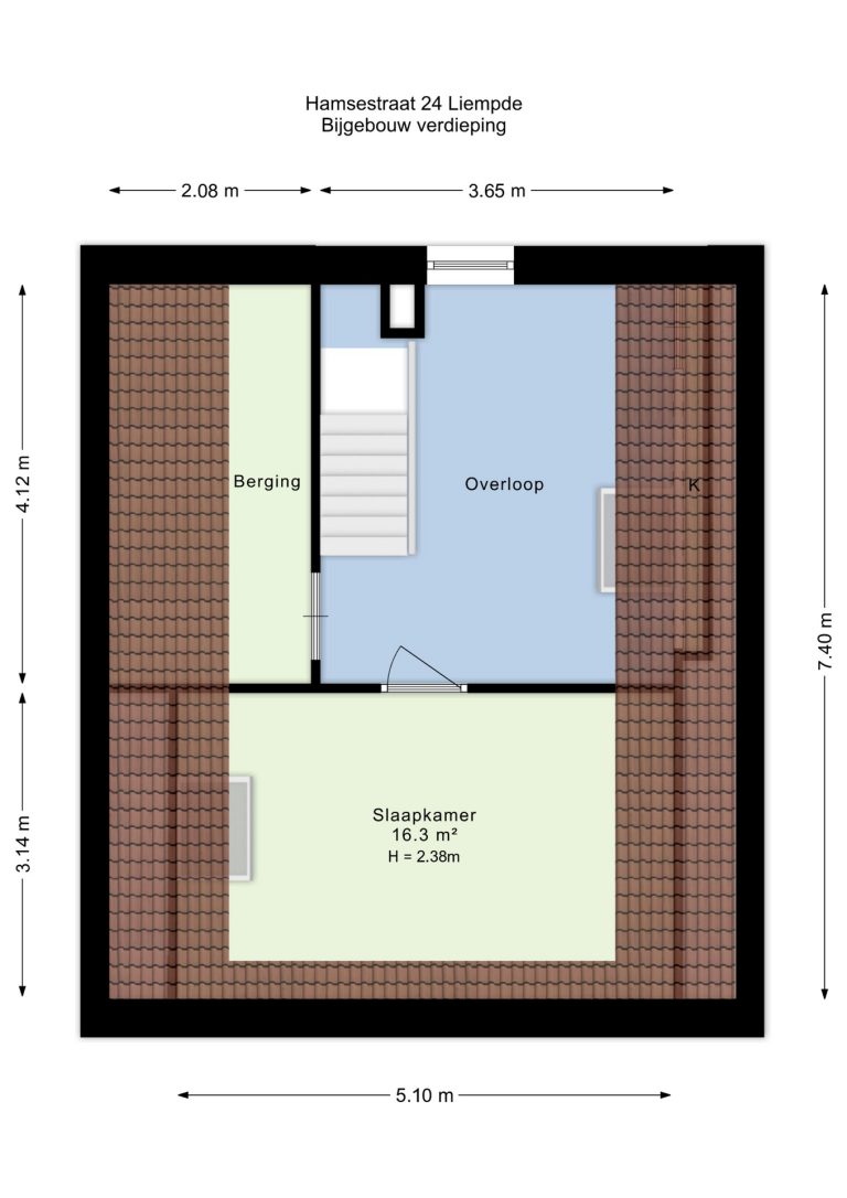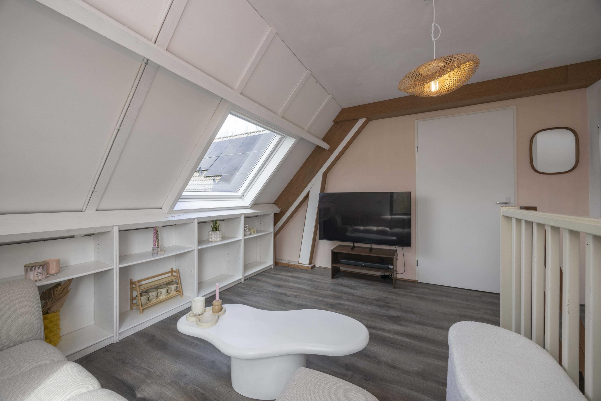 De verdieping is bereikbaar via een afgesloten trapopgang en biedt een verrassend ruime indeling. Op de overloop is een extra woonkamer gecreëerd, met een dakraam dat zorgt voor prettig daglicht en uitzicht op de tuin. Daarnaast is er een separate bergruimte aanwezig. De slaapkamer op deze verdieping is afgewerkt met een laminaatvloer en beschikt over een dakraam. Verwarming vindt hier plaats via een elektrische kachel.