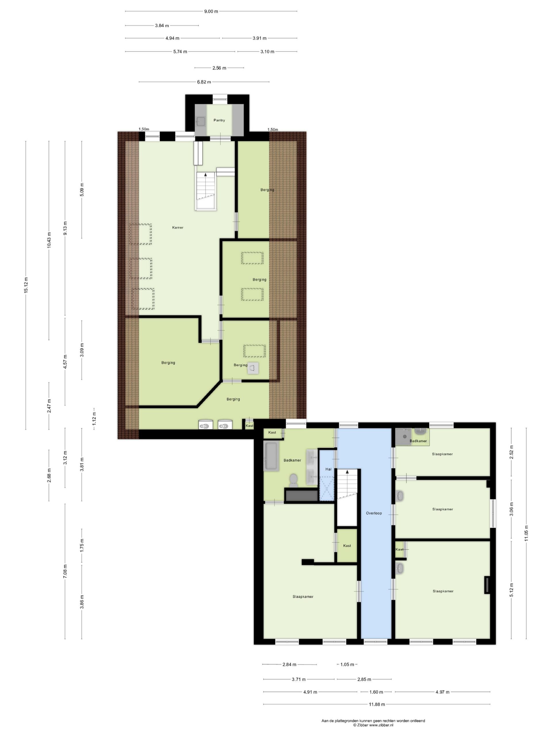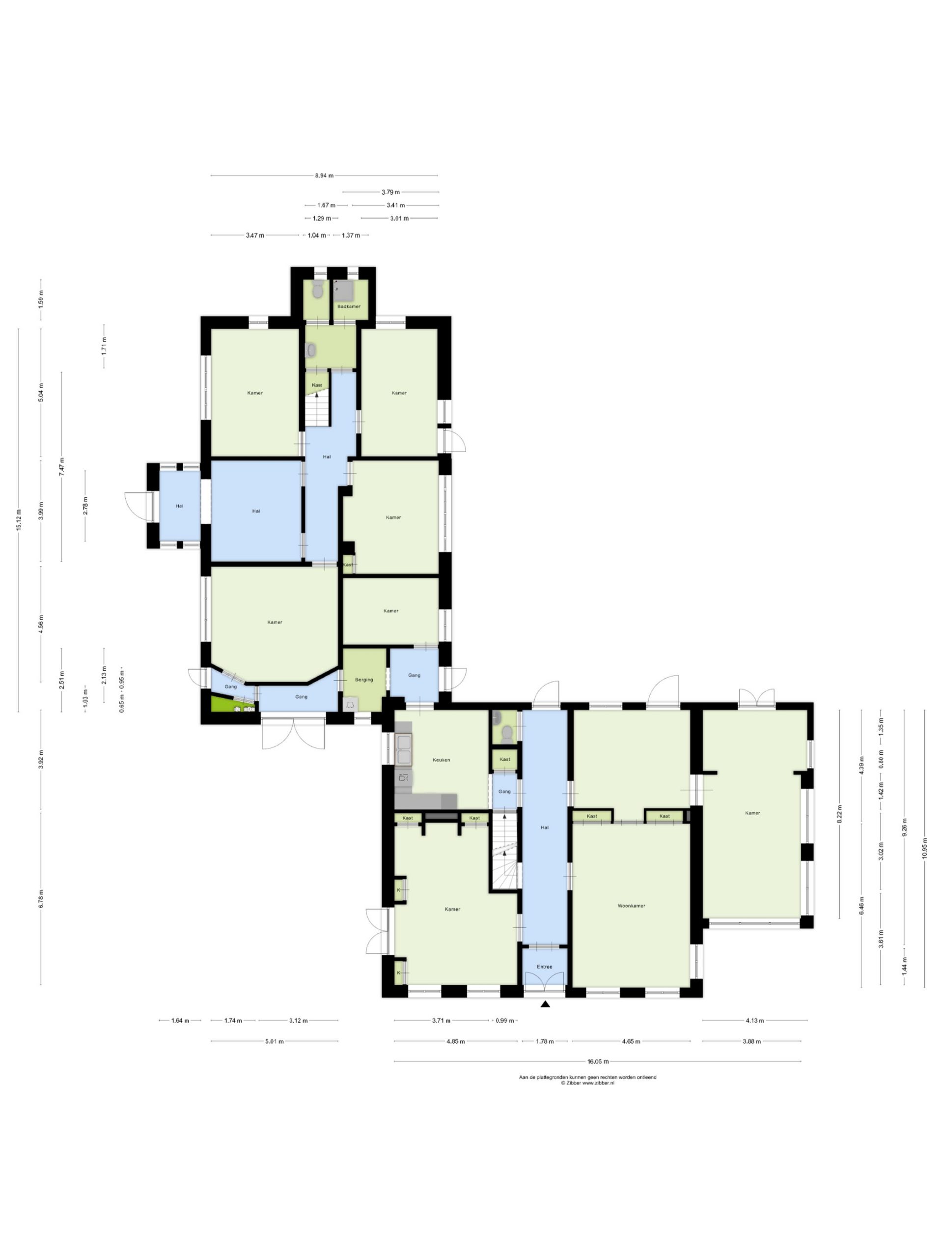 Via de bijkeuken van de woning of een separate ingang aan de linkerzijde van de bedrijfsruimte is de hal van de aanbouw te bereiken. Op de begane grond bevinden zich vier royale kamers en een badkamer met douche en toilet. De eerste verdieping is voorzien van een pantry en een grote open ruimte met meerdere dakramen, evenals diverse bergruimten. De kamers op zowel de begane grond als de bovenverdieping zijn flexibel in te richten en de bestemming ‘dienstverlening’ biedt voldoende kansen en mogelijkheden.