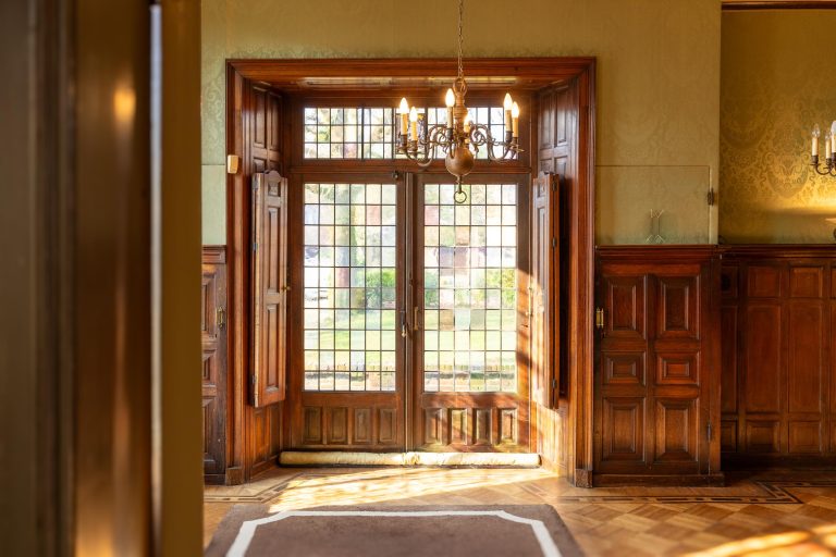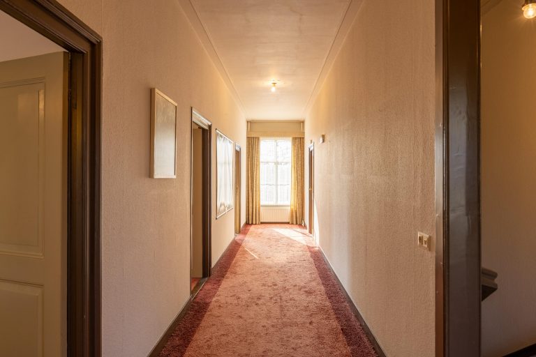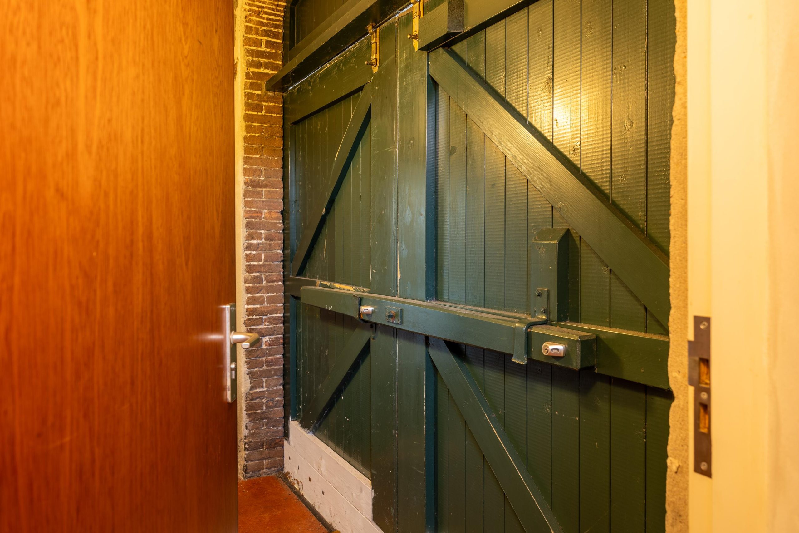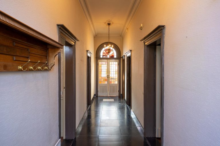 Via de statige voordeur in de imposante voorgevel bereikt u het portaal met dubbele taatsdeuren, die toegang bieden tot de hal met een fraaie authentieke plavuizenvloer.