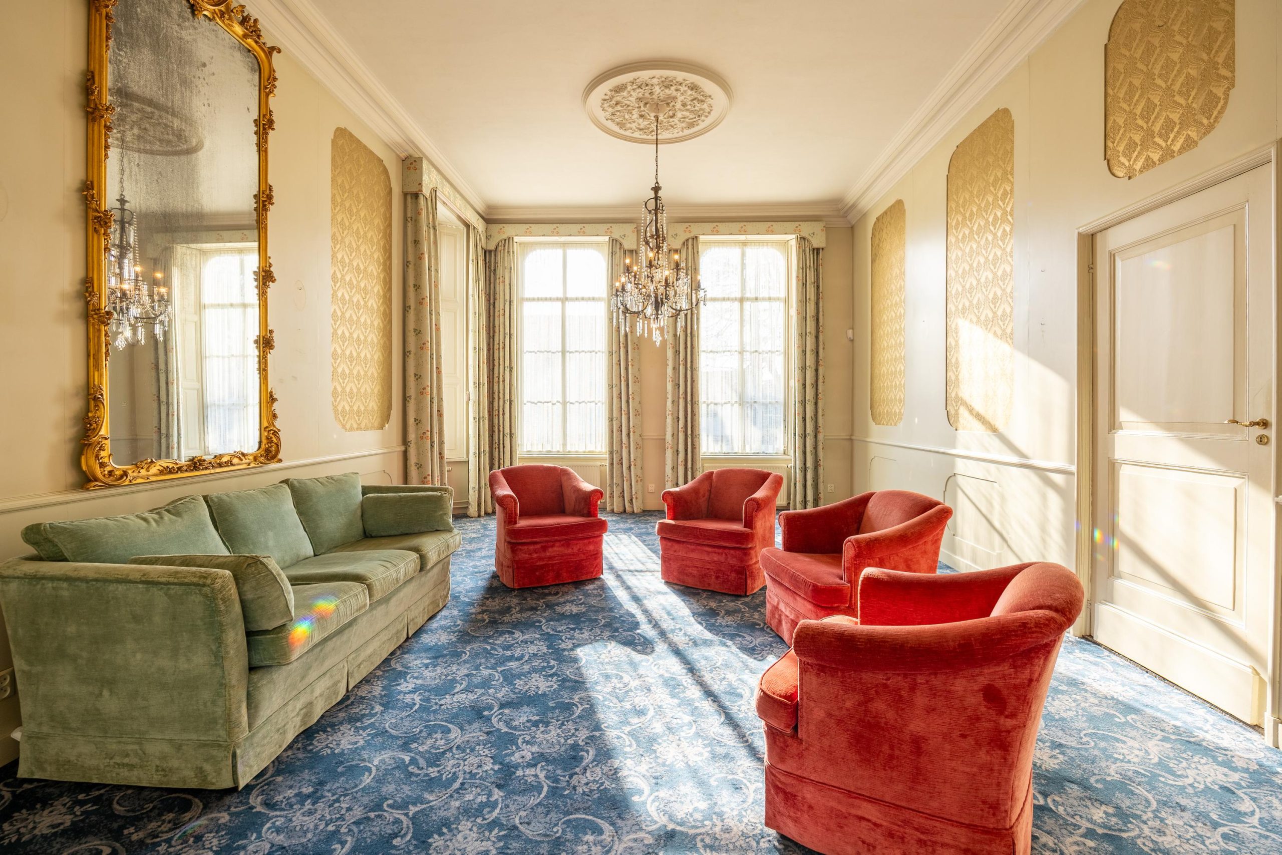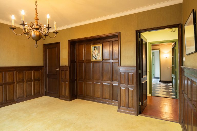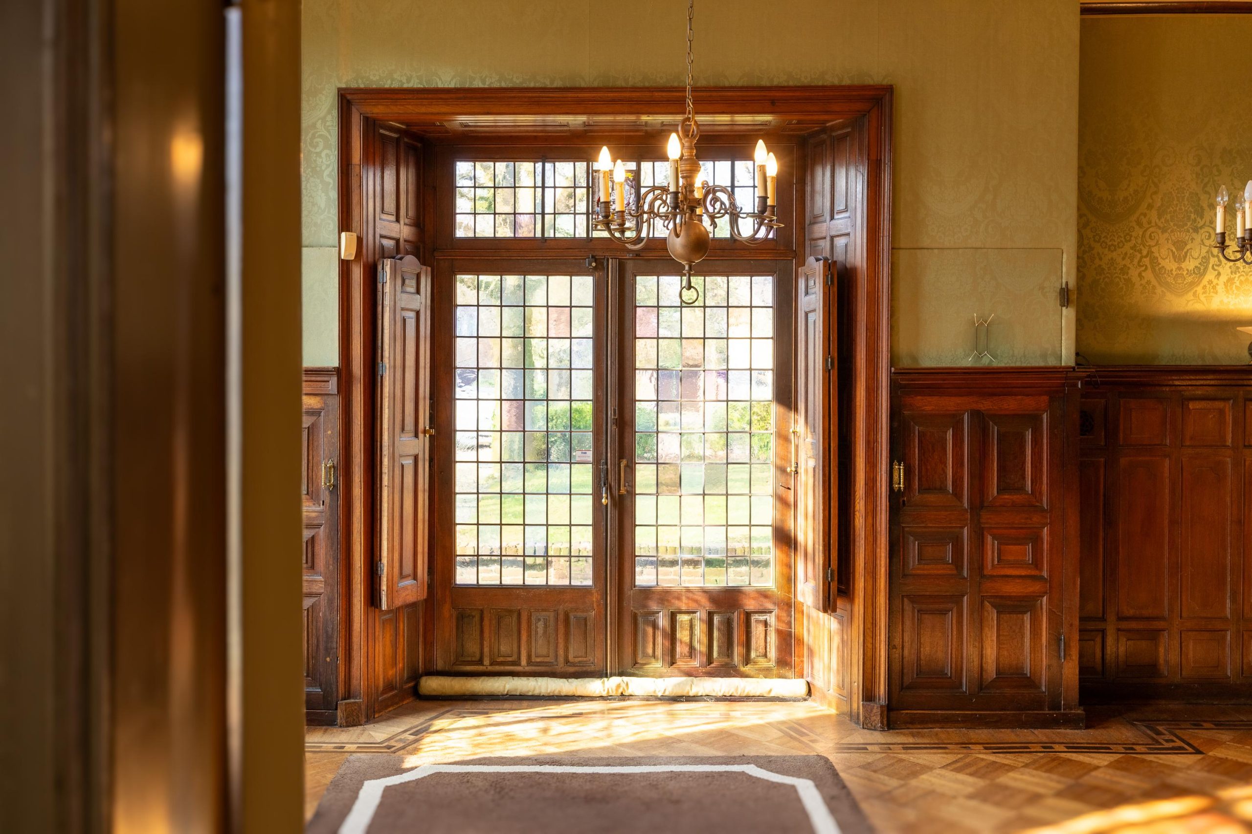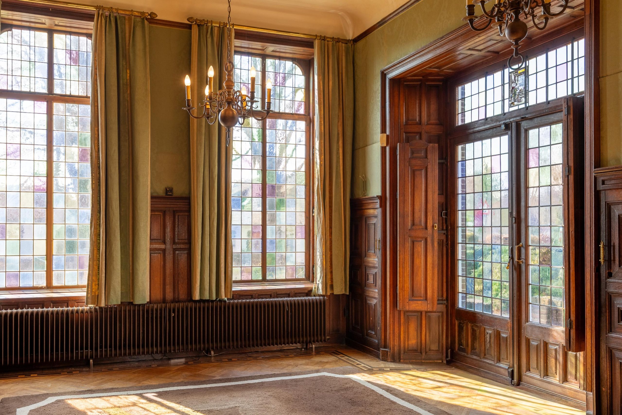 De hal verbindt verschillende royale vertrekken met elkaar, die naar wens kunnen worden ingedeeld als woonkamer, eetkamer, recreatiekamer en zitkamer. De eerste ruimte bevindt zich aan de voorzijde van de woning en is voorzien van prachtige houten elementen, waaronder maatwerk lambrisering met ingebouwde kasten, een fraaie houten vloer en daarnaast diverse glas-in-looddetails.