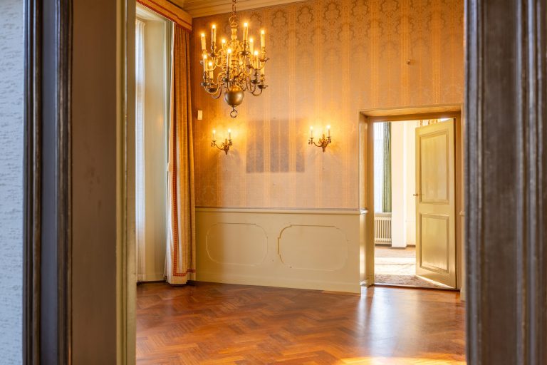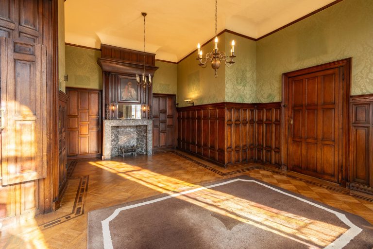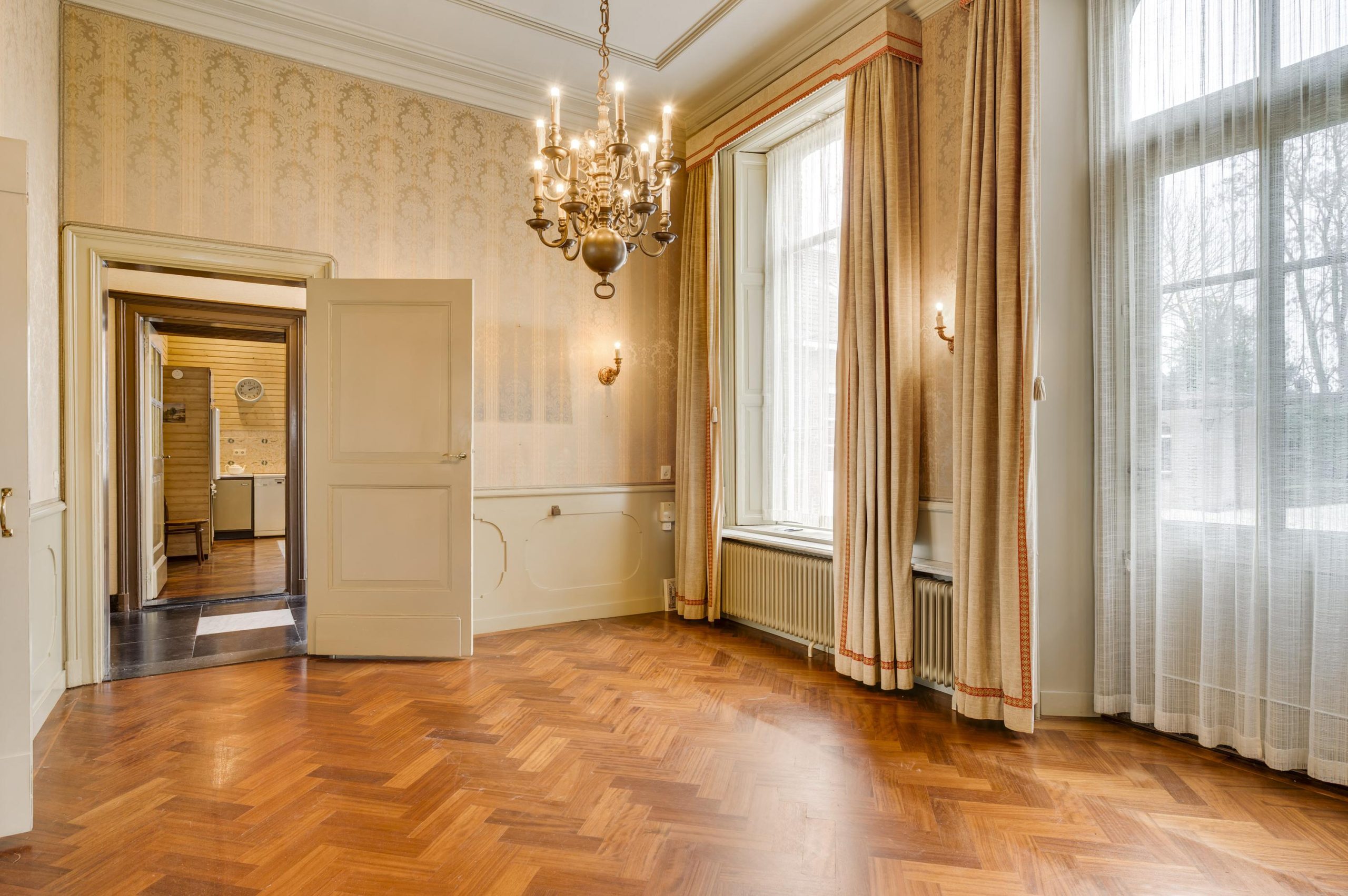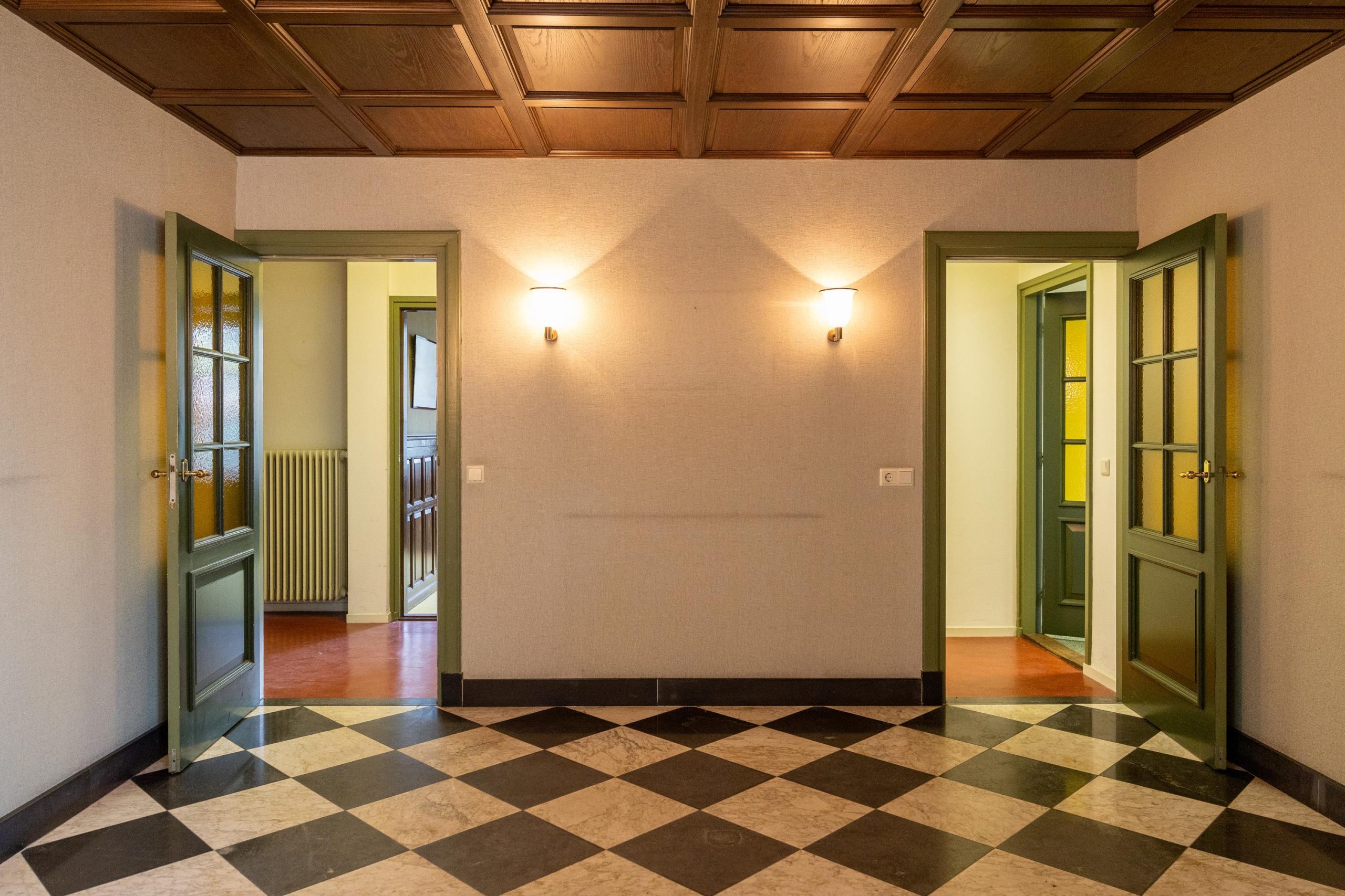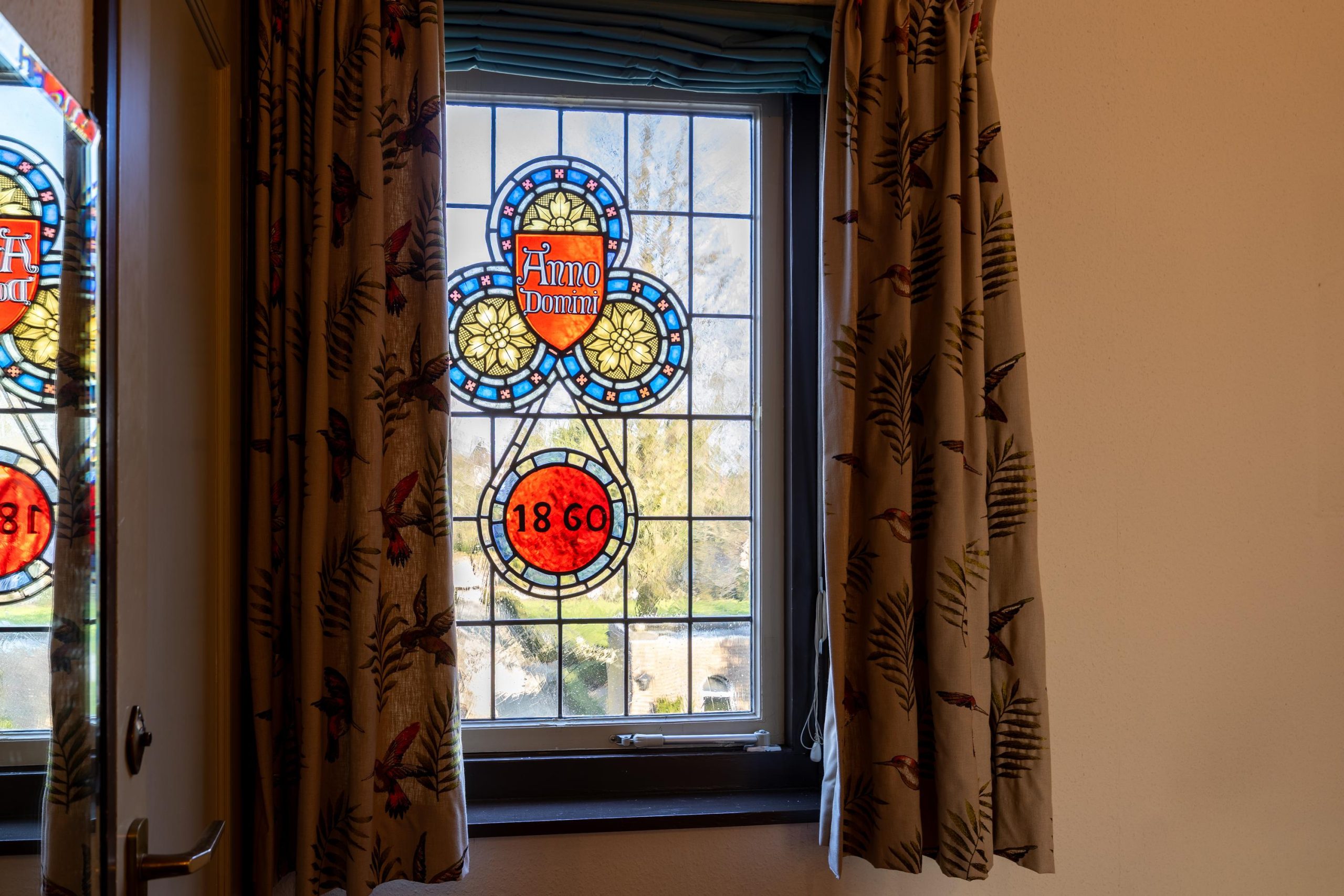 De hal verbindt verschillende royale vertrekken met elkaar, die naar wens kunnen worden ingedeeld als woonkamer, eetkamer, recreatiekamer en zitkamer. De eerste ruimte bevindt zich aan de voorzijde van de woning en is voorzien van prachtige houten elementen, waaronder maatwerk lambrisering met ingebouwde kasten, een fraaie houten vloer en daarnaast diverse glas-in-looddetails.