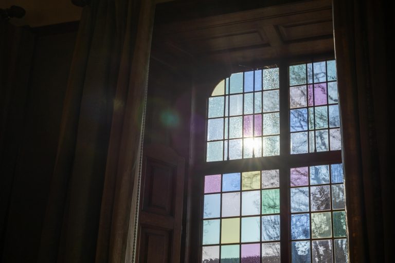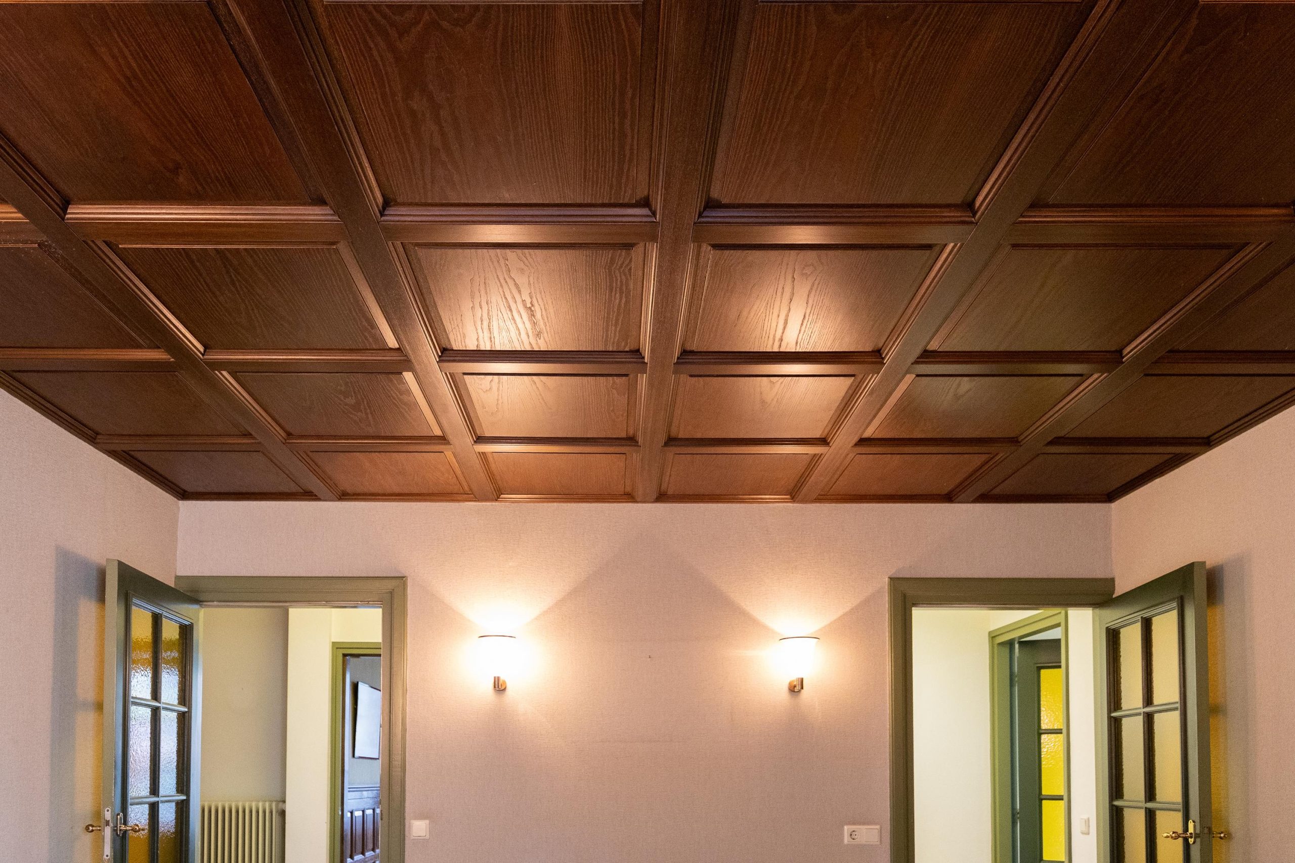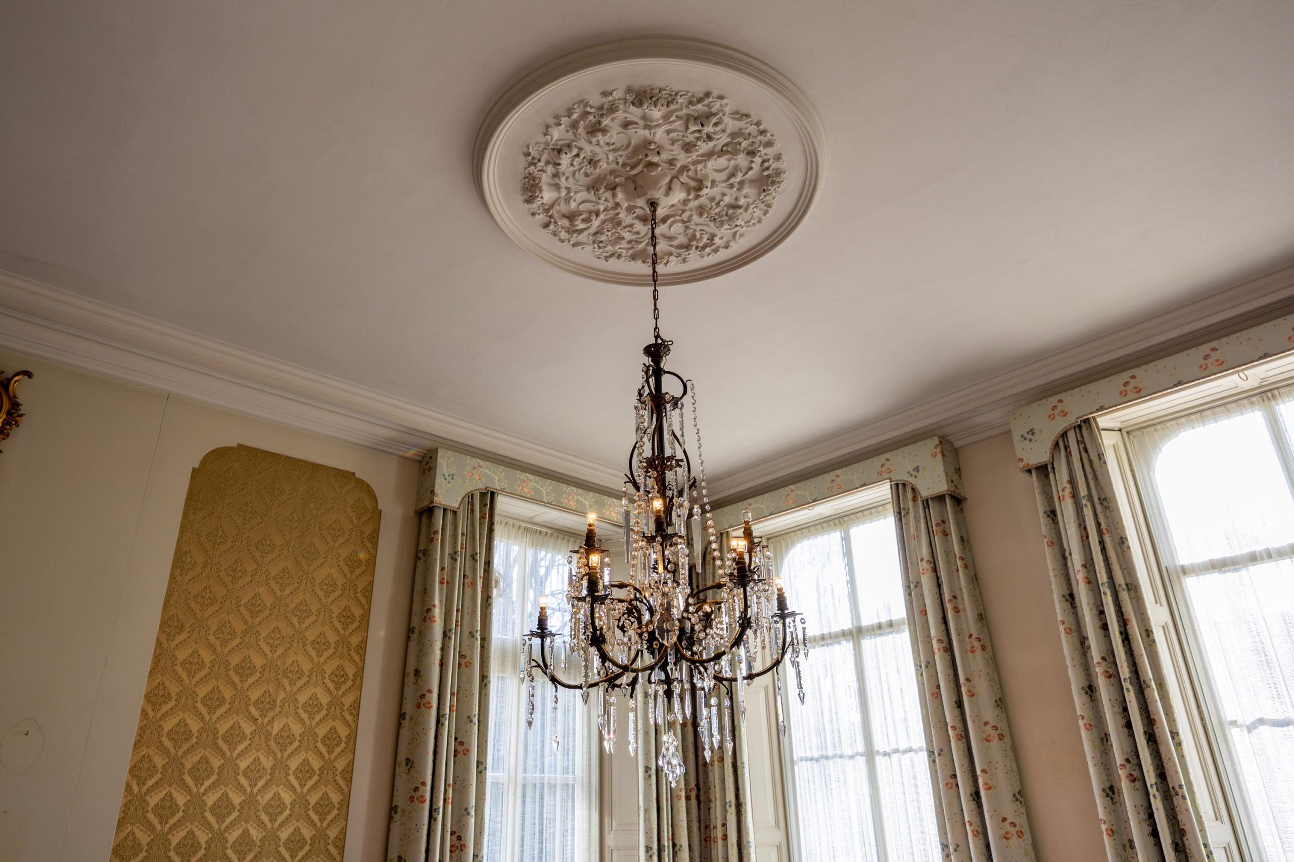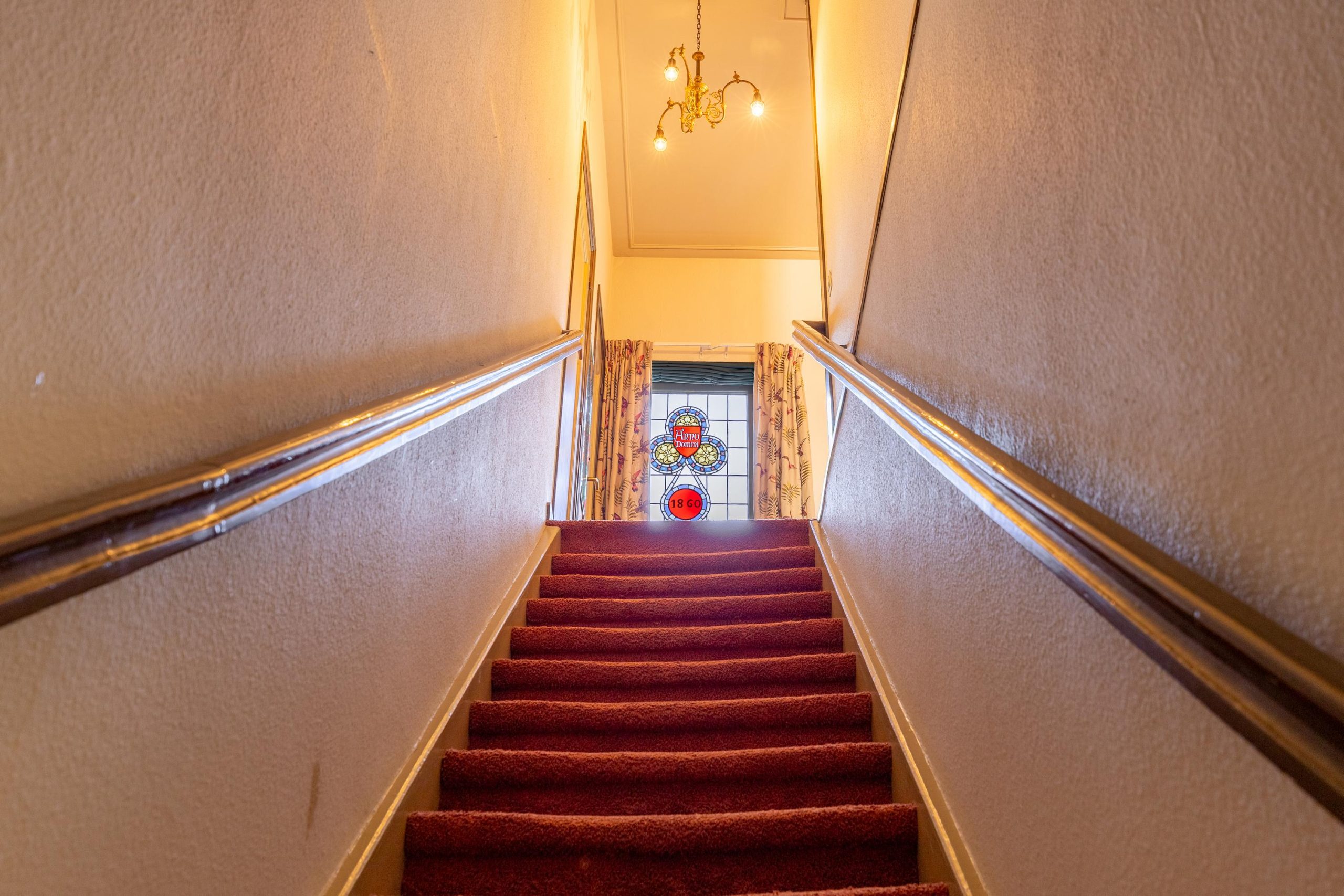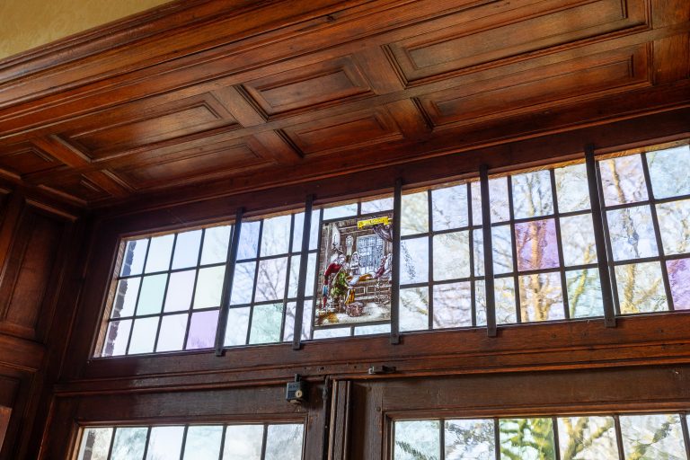 De hal verbindt verschillende royale vertrekken met elkaar, die naar wens kunnen worden ingedeeld als woonkamer, eetkamer, recreatiekamer en zitkamer. De eerste ruimte bevindt zich aan de voorzijde van de woning en is voorzien van prachtige houten elementen, waaronder maatwerk lambrisering met ingebouwde kasten, een fraaie houten vloer en daarnaast diverse glas-in-looddetails.