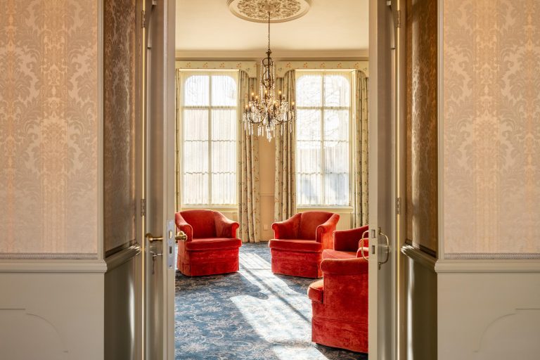 De tweede ruimte aan de achterzijde is uitgerust met een elegante visgraat houten vloer en fungeert als verbinding tussen de kamer aan de voorzijde en de tuinkamer. De lichte kamer aan de voorzijde heeft diverse grote ramen die zorgen voor een prettige lichtinval en een loopdeur biedt toegang tot de hal, terwijl de zonnige tuinkamer openslaande deuren naar de achtertuin heeft.