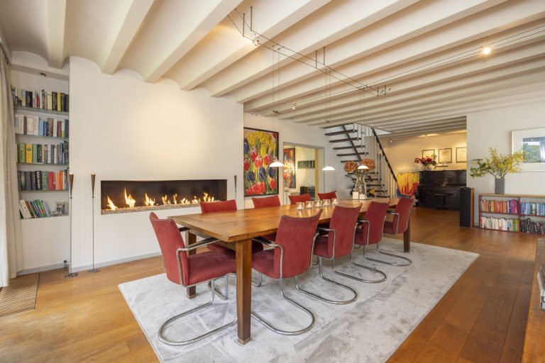 De eethoek bevindt zich bij de stijlvolle, modern vormgegeven, gashaard; hier kunt u heerlijk borrelen en tafelen met familie en vrienden. Aan de achterzijde geeft een schuifpui toegang tot het overdekte terras en de tuin.