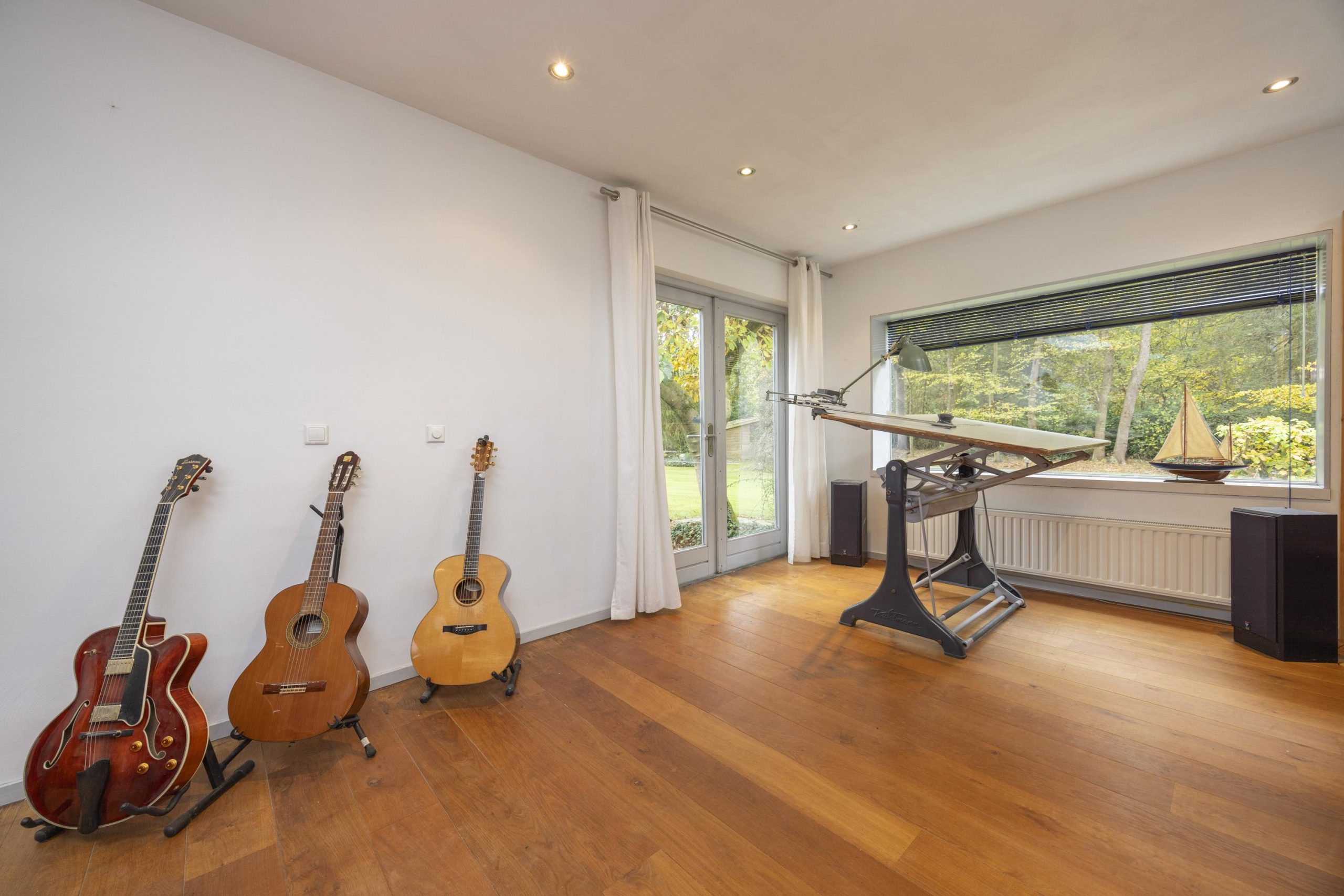 Aan de achterzijde van de villa bevindt zich nog een grote kamer met een houten vloer, nu in gebruik als muziekkamer. Openslaande deuren leiden naar een terras en de tuin.