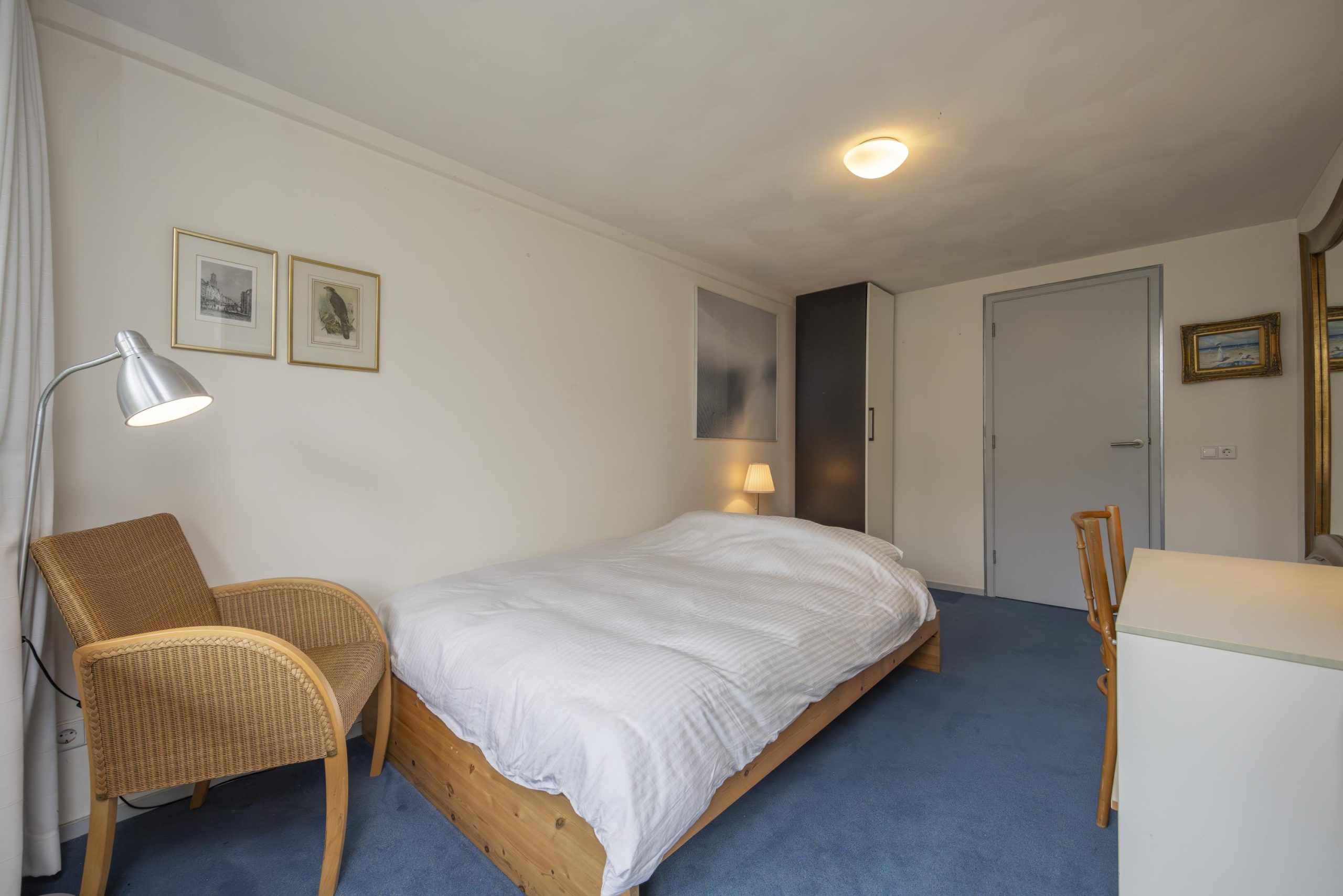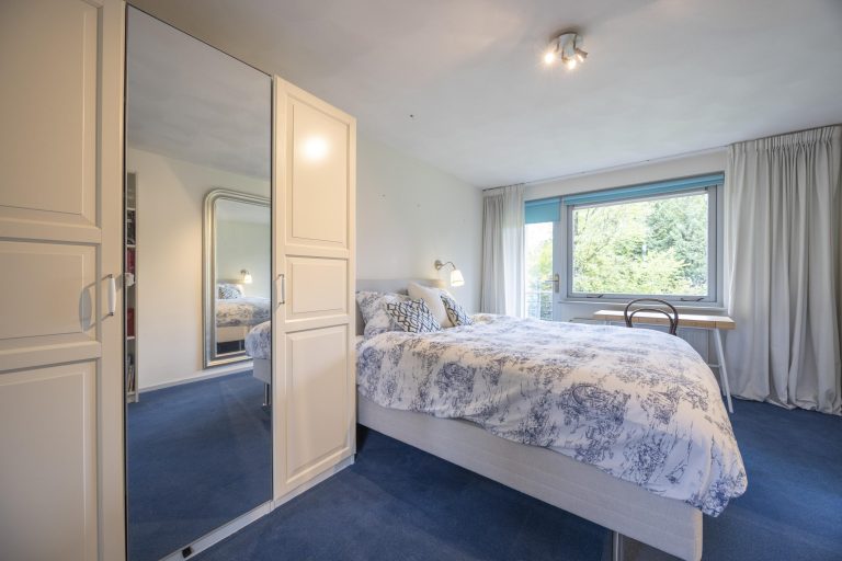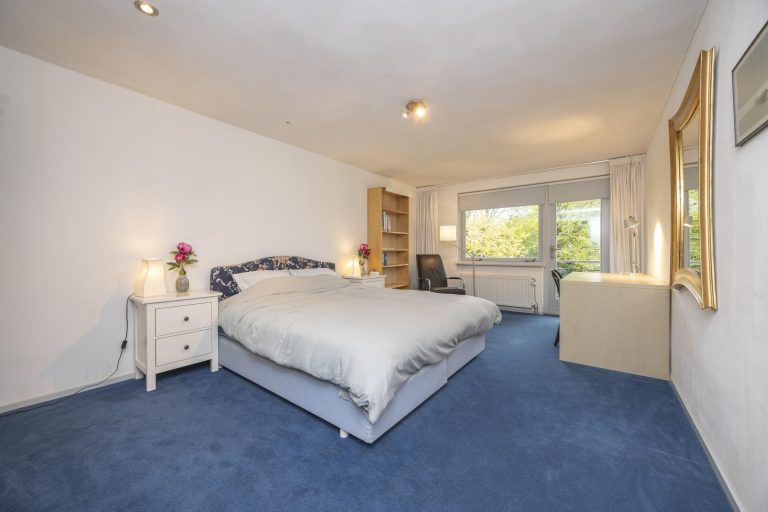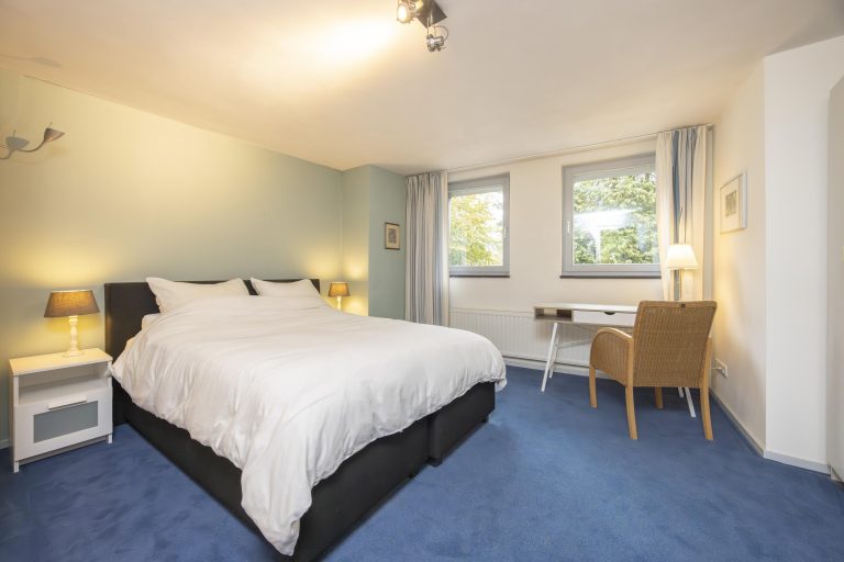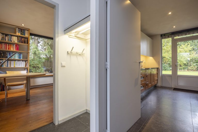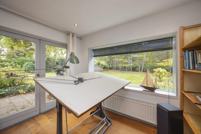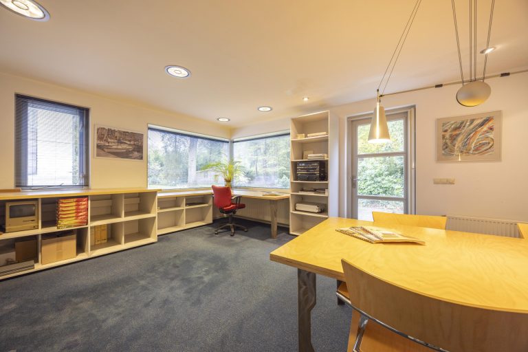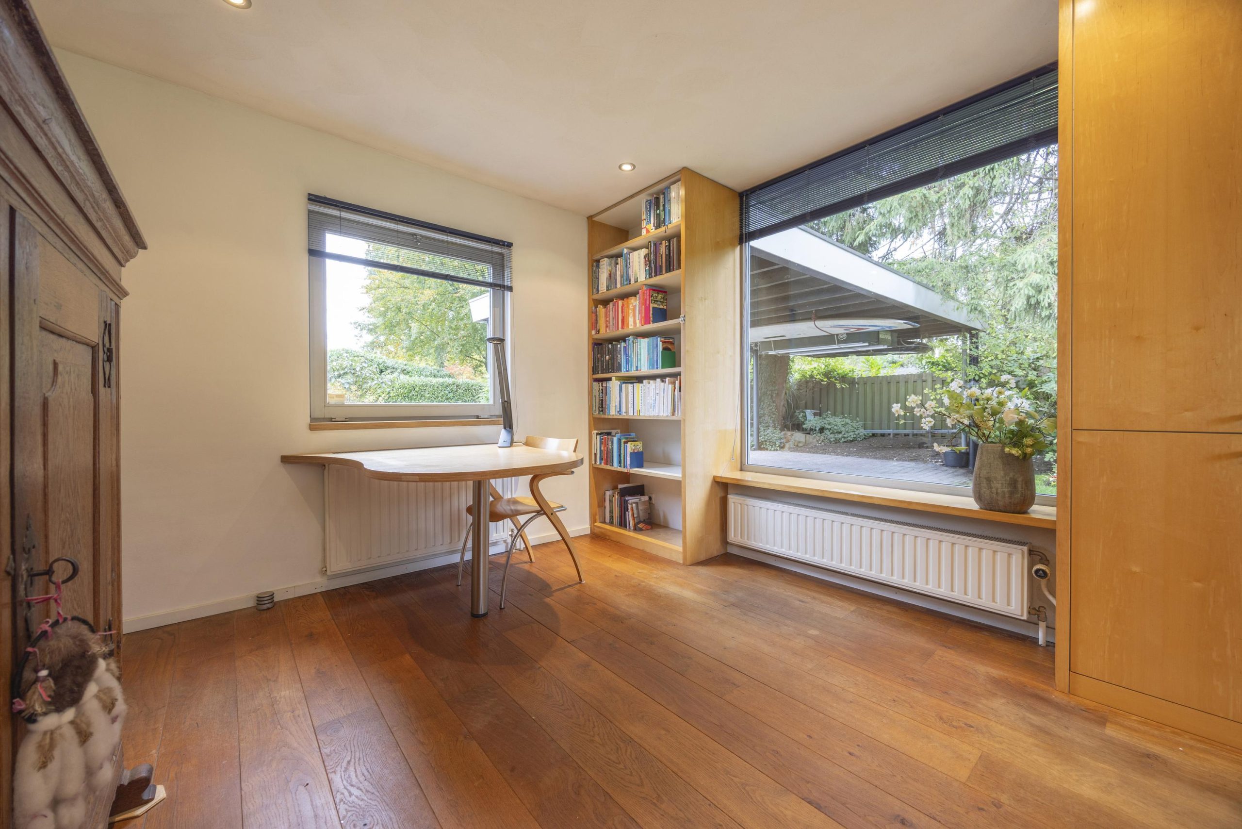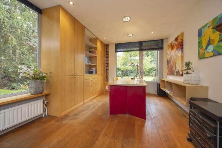 Naast de bijkeuken bevindt zich nog een ruime studeer-/werkkamer met veel kastruimte en een houten vloer. Ook deze kamer kenmerkt zich door een aangename daglichtinval en mooi uitzicht op de tuin en de hoofdentree van de woning.