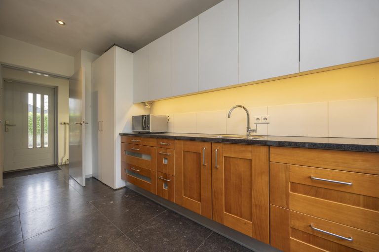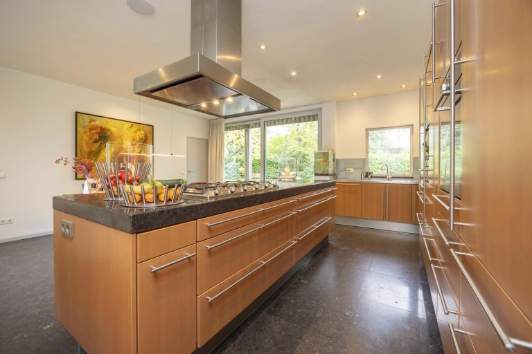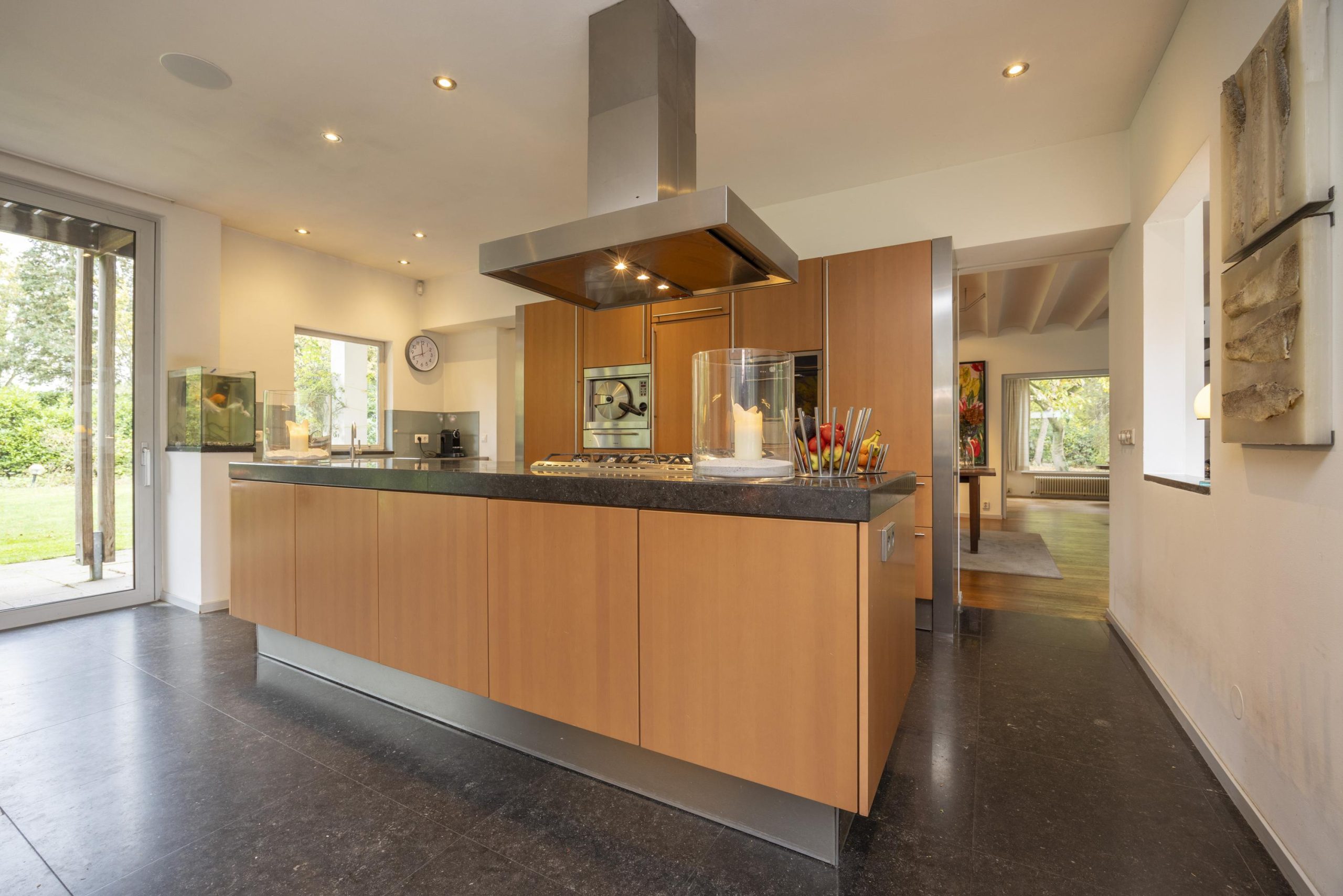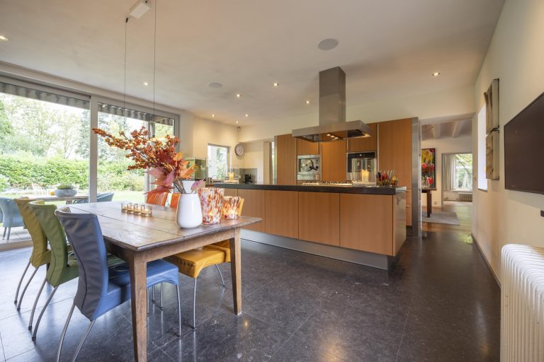 Aansluitend aan de eetkamer is de royale leefkeuken, voorzien van een hardstenen vloer. De praktische inrichting met een kookeiland, wandopstelling en aanrecht maakt dat u hier uitgebreid kunt koken en leven. Er is diverse inbouwapparatuur aanwezig (2003): een 5 pits gaskookplaat (incl. wokbrander) met rvs-afzuigschouw, stoomoven, bordenwarmer, oven, vaatwasser en twee koelkasten. Een schuifpui geeft direct toegang tot het overdekte terras en het buitenleven.