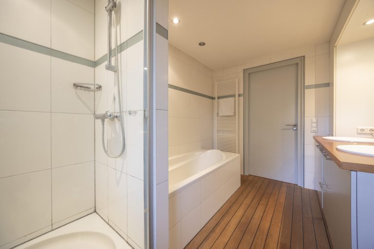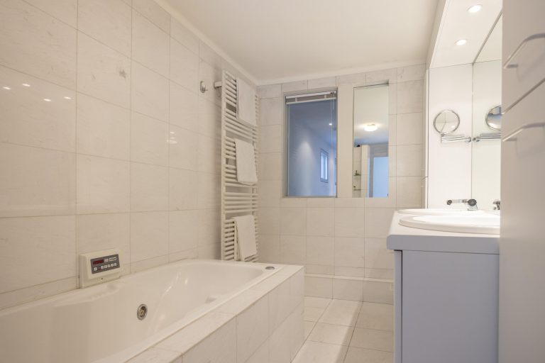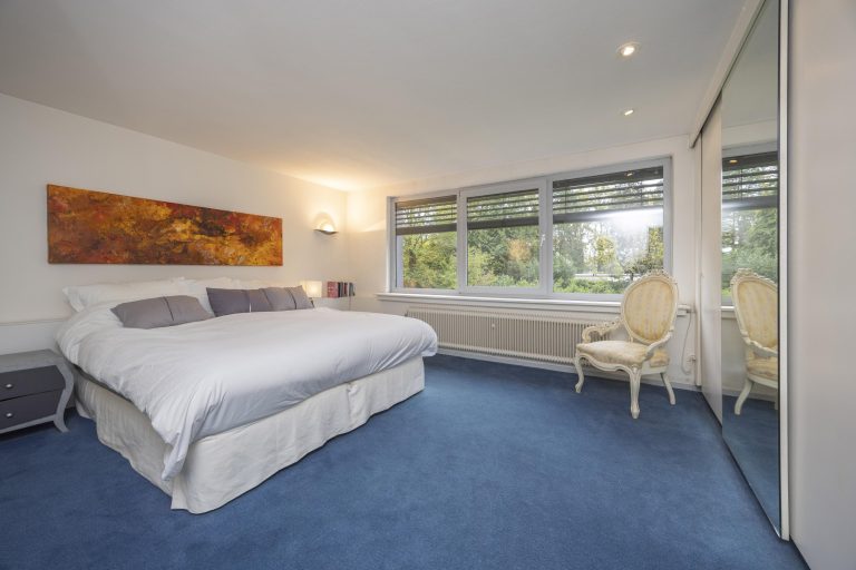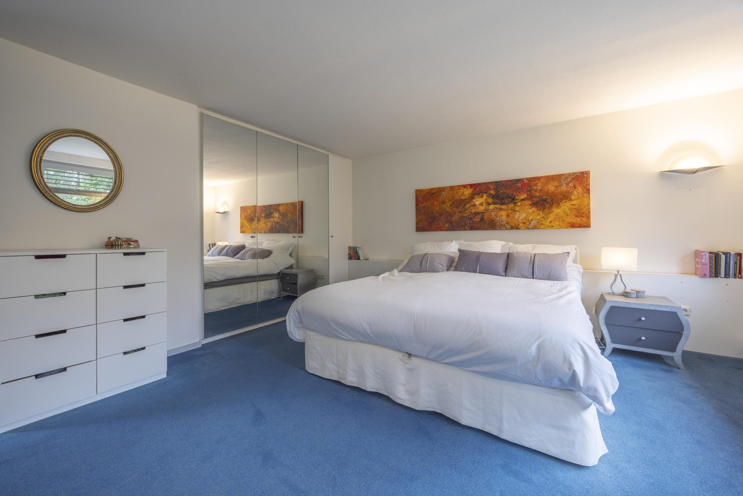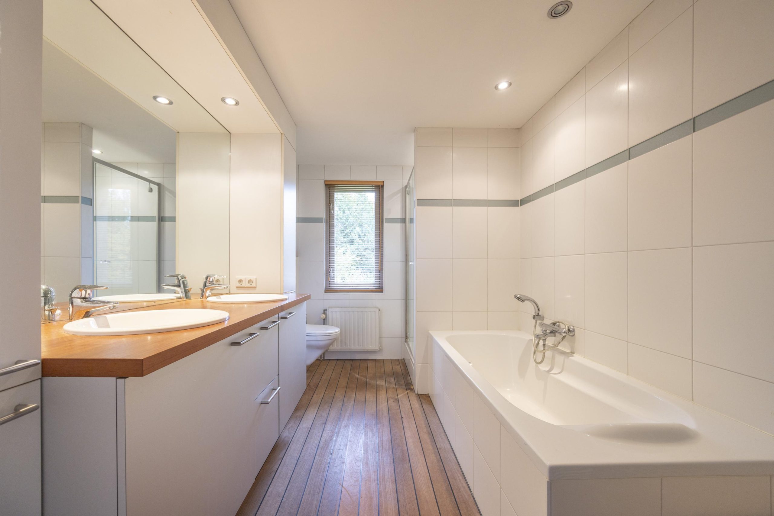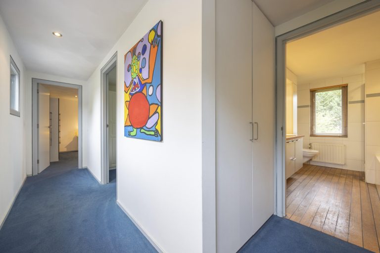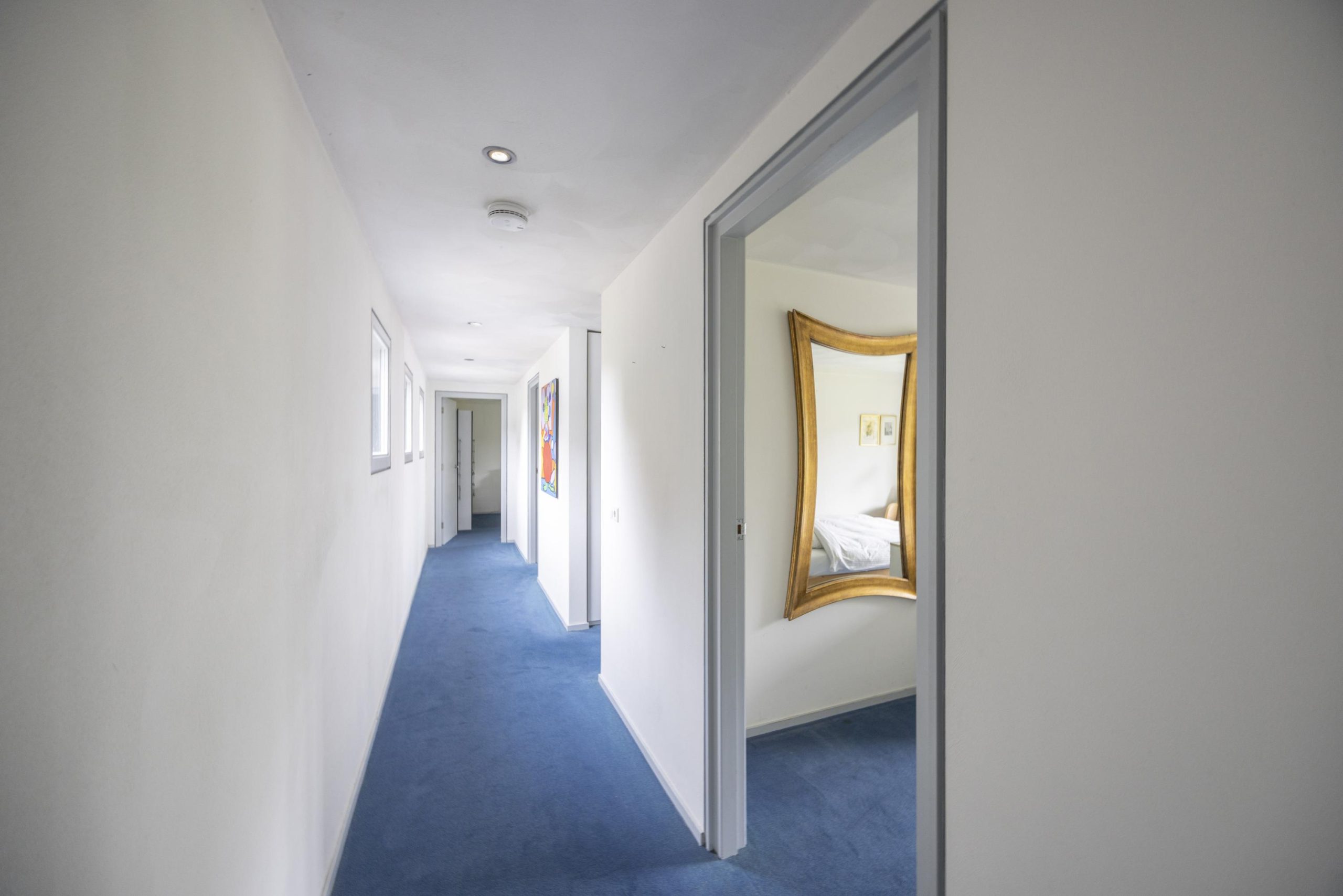 Vanaf de overloop leidt een gang naar de master bedroom aan de achterzijde van de villa; het raam is voorzien van -elektrisch bedienbare- buitenjaloezieën. Aangrenzend een badkamer in neutrale kleurstelling met douche, ligbad, twee wastafels in wandmeubel, designradiator en wandcloset. De andere slaapkamer is aan de voorzijde gelegen.