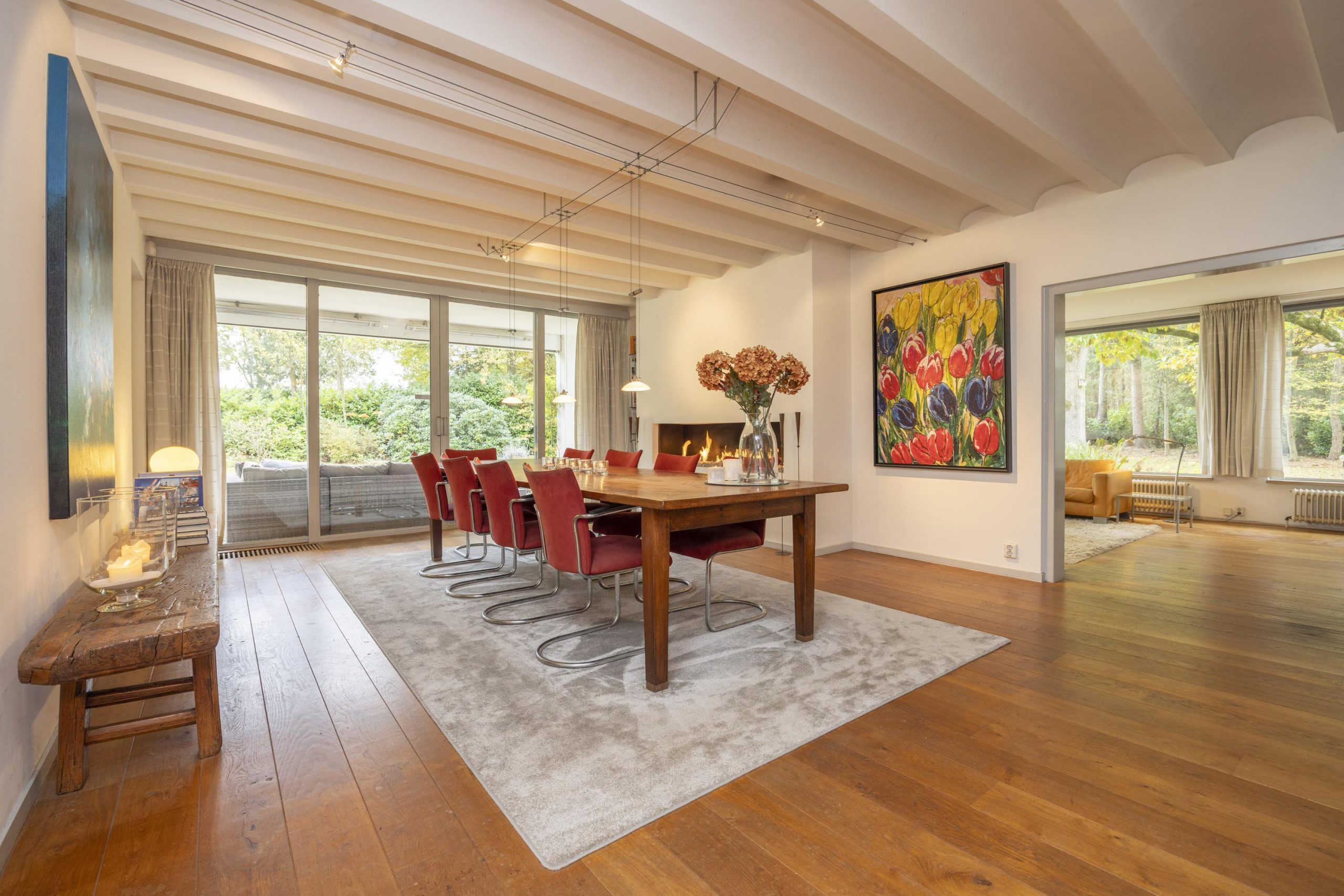 Via een toog is de woonkamer bereikbaar met een panoramisch zicht op de verzorgde tuin en de bosrijke omgeving. Deze kamer heeft eveneens een houten vloer; het zitgedeelte is rondom de haard gegroepeerd.