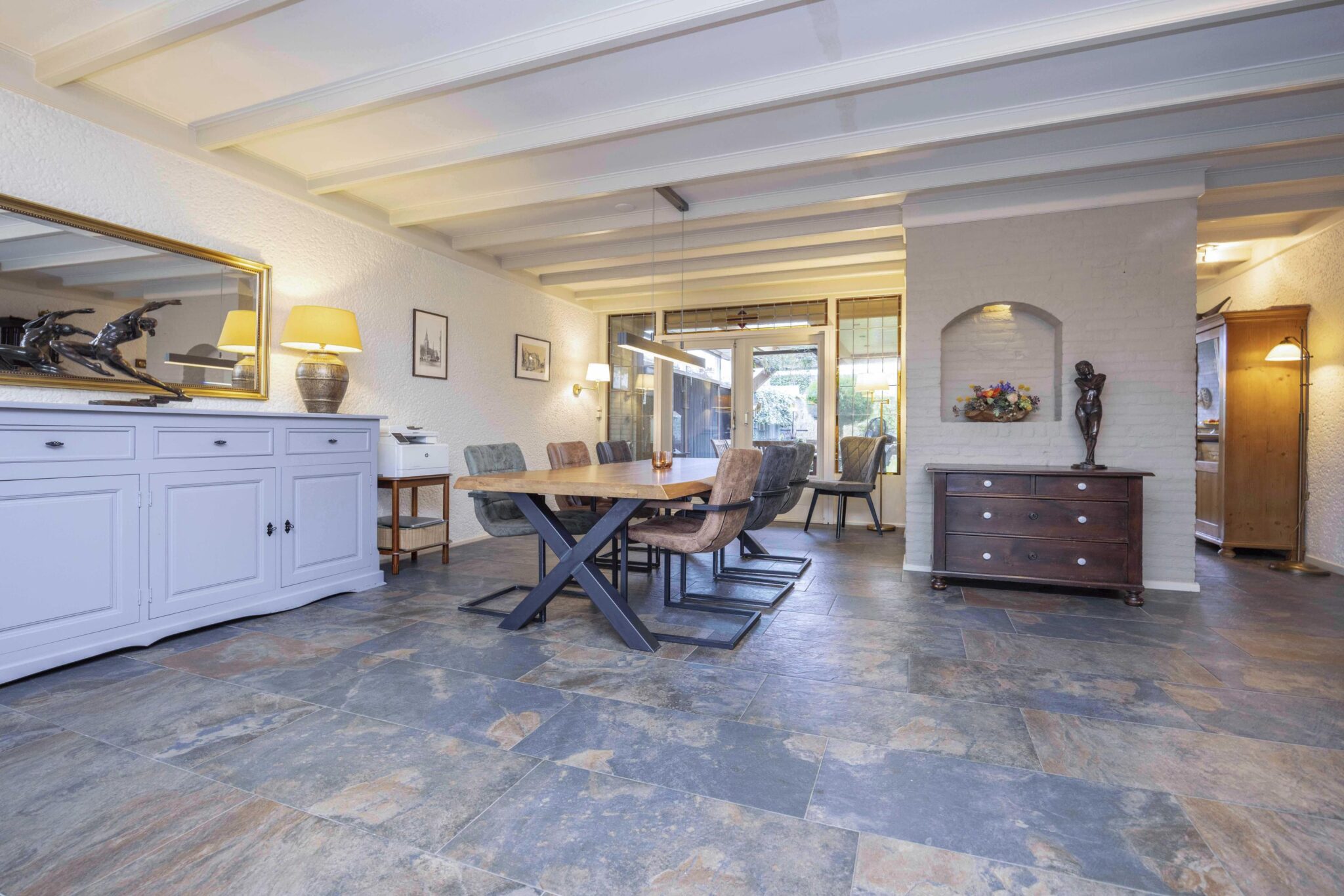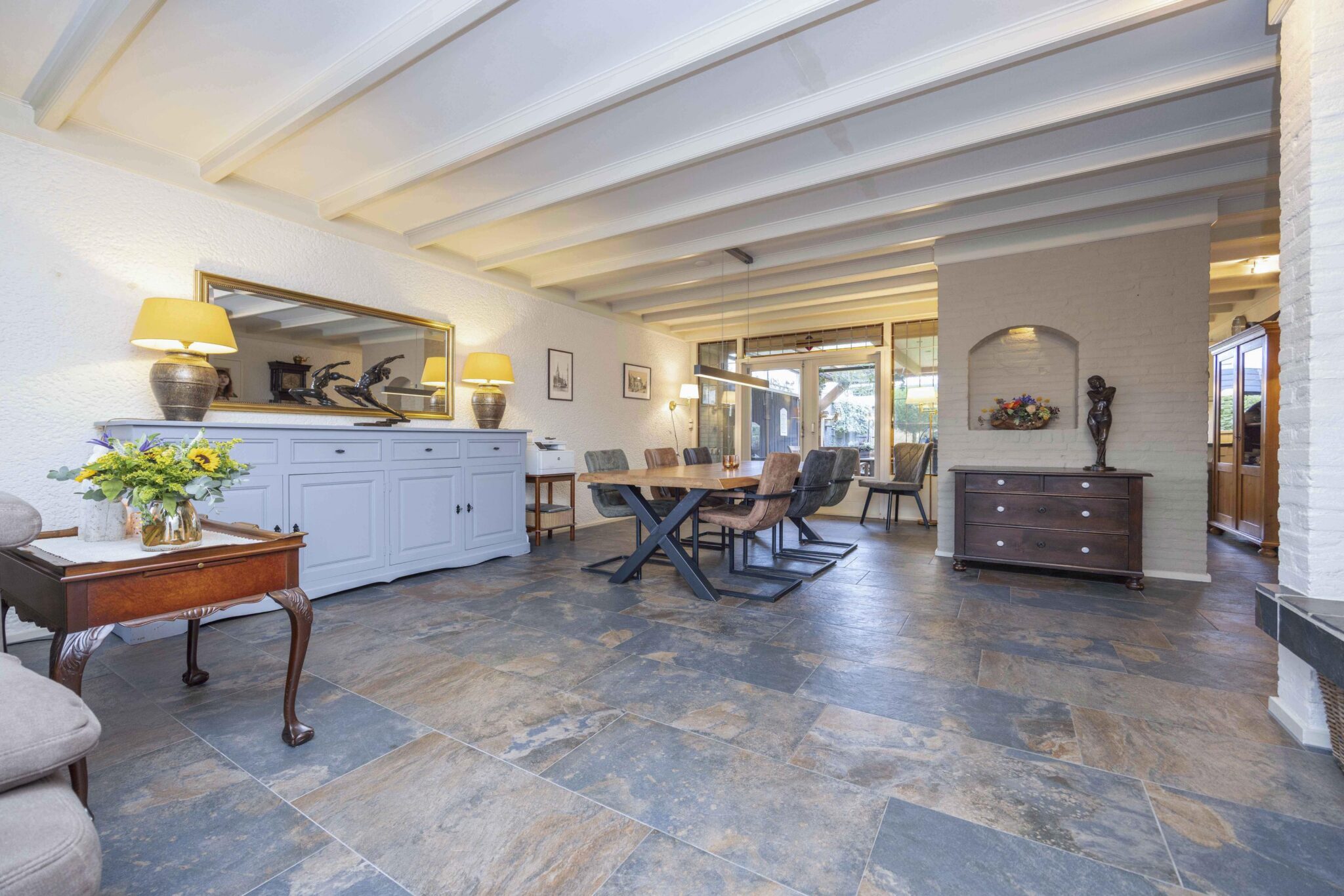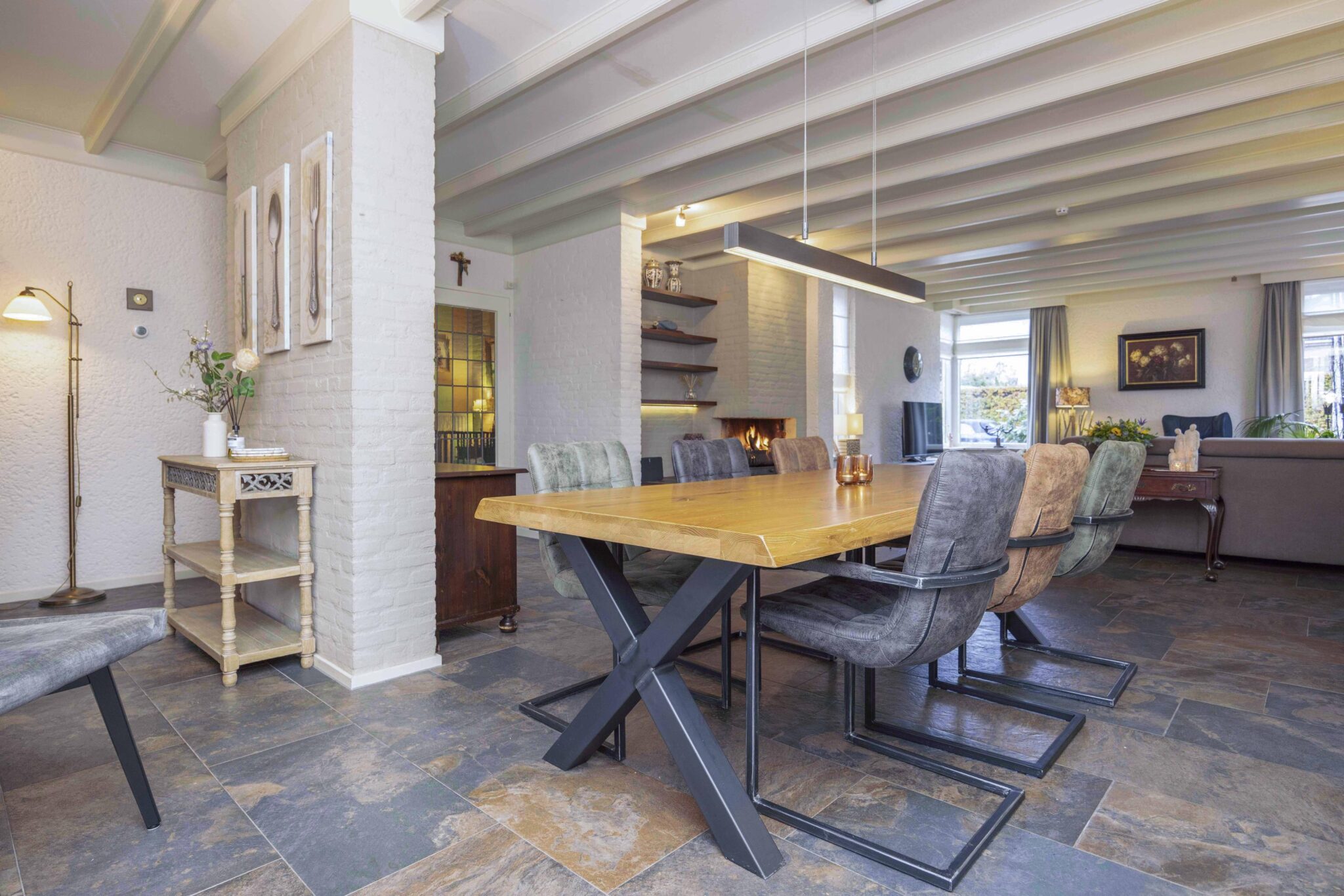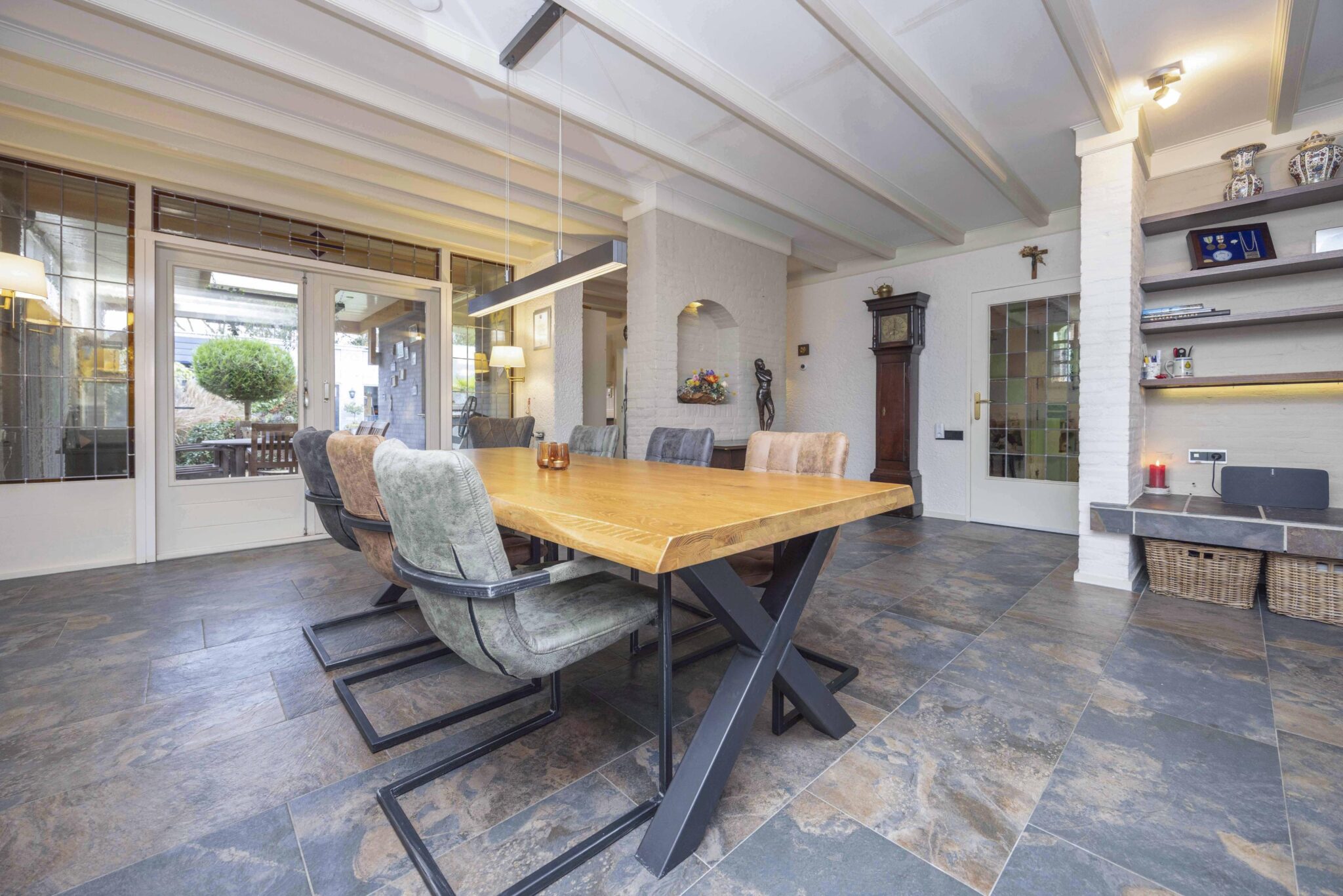 De woonkamer heeft een gashaard en dubbele deuren naar de tweede oprit. Aansluitend ligt de eetkamer, eveneens voorzien van dubbele deuren die toegang geven tot de sfeervolle overkapping en de achtertuin.