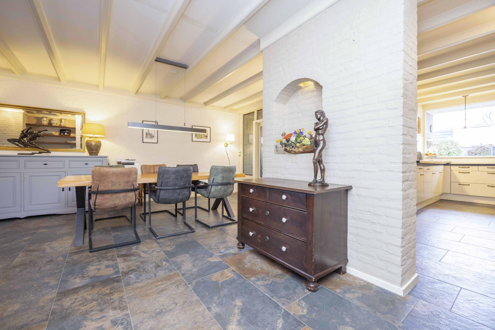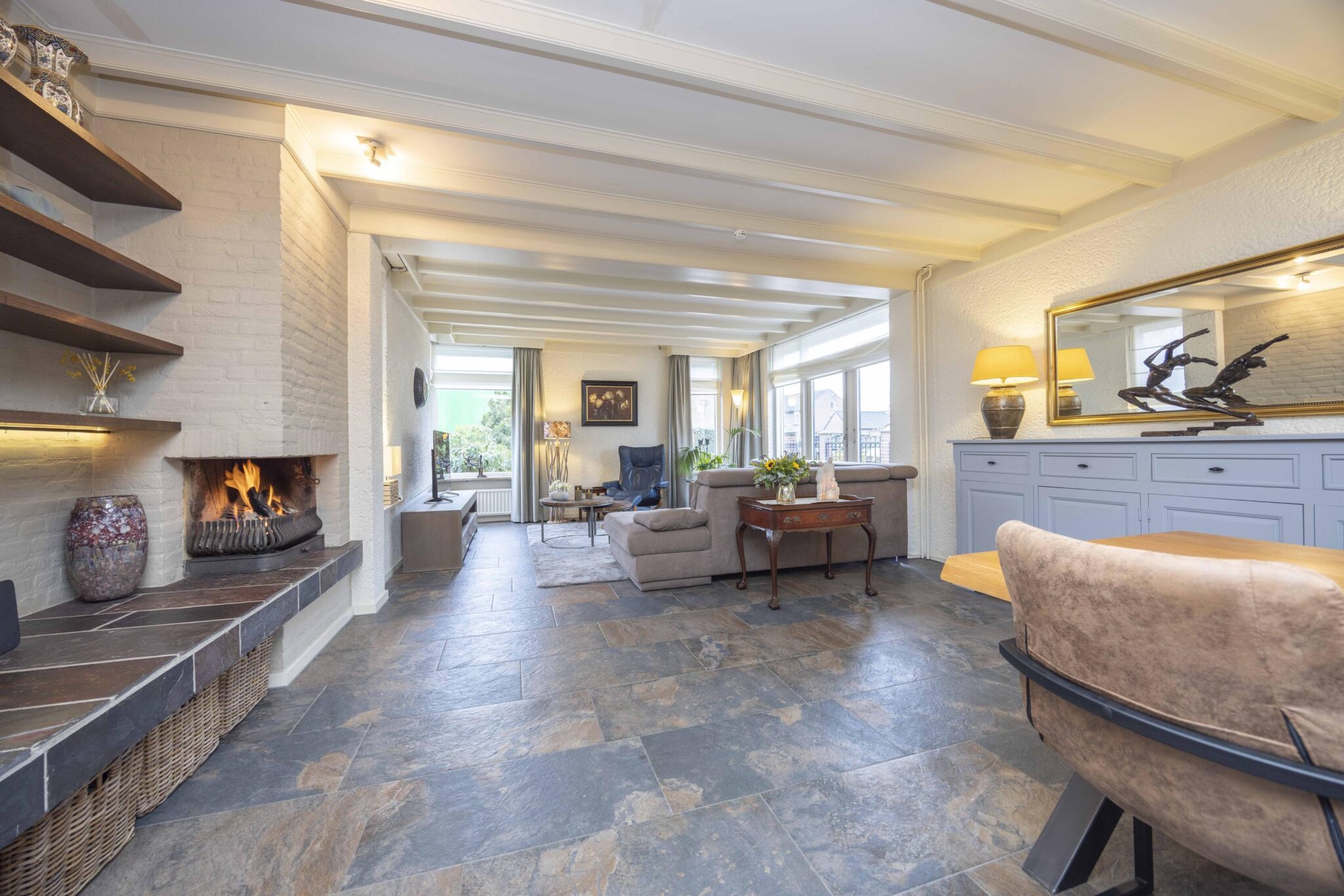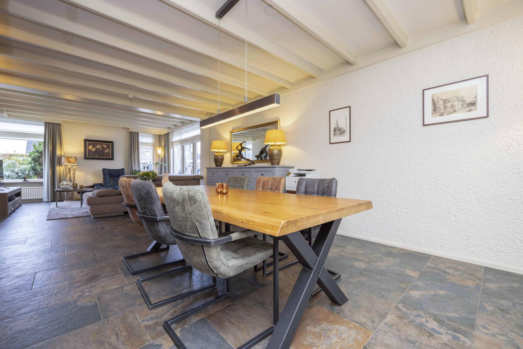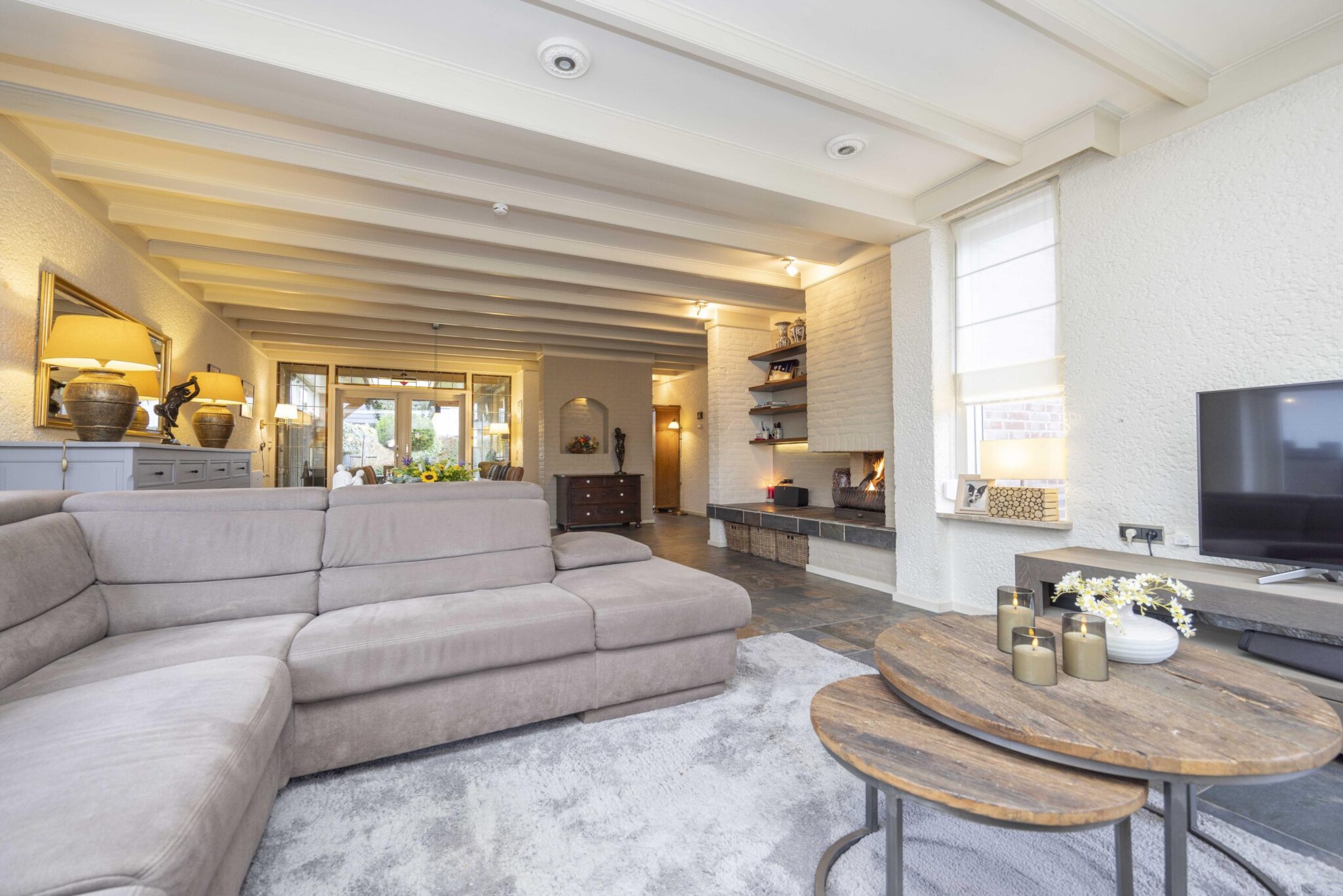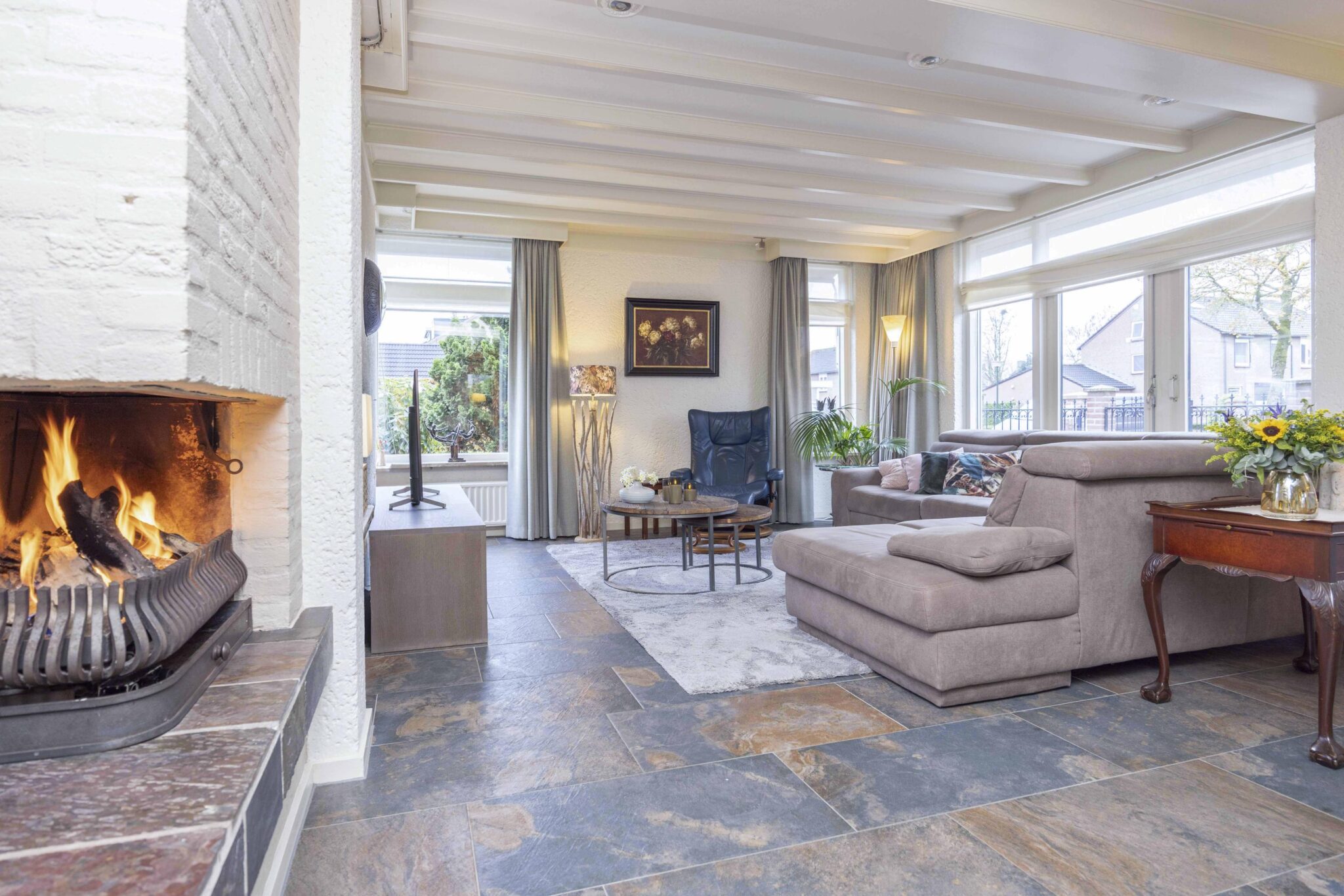 De woonkamer heeft een gashaard en dubbele deuren naar de tweede oprit. Aansluitend ligt de eetkamer, eveneens voorzien van dubbele deuren die toegang geven tot de sfeervolle overkapping en de achtertuin.