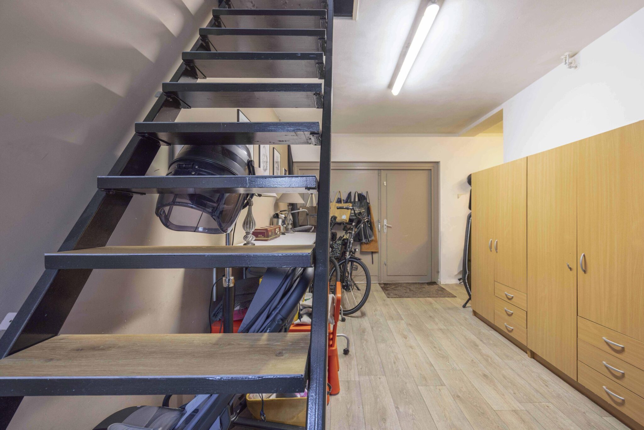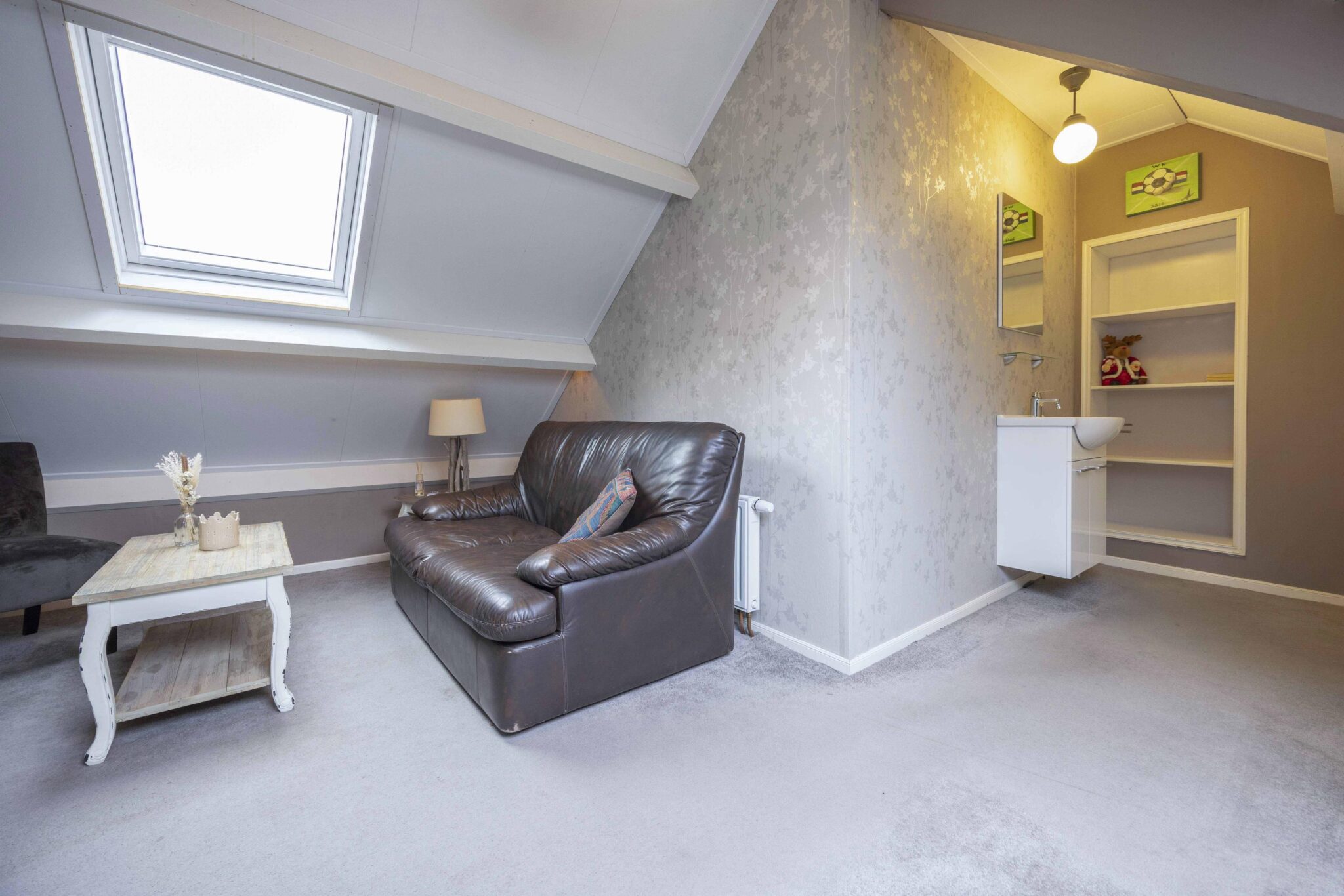 Boven de garage ligt een multifunctionele ruimte die bereikbaar is via de garage. Deze ruimte beschikt over een wastafel, twee dakramen en een inbouwkast.