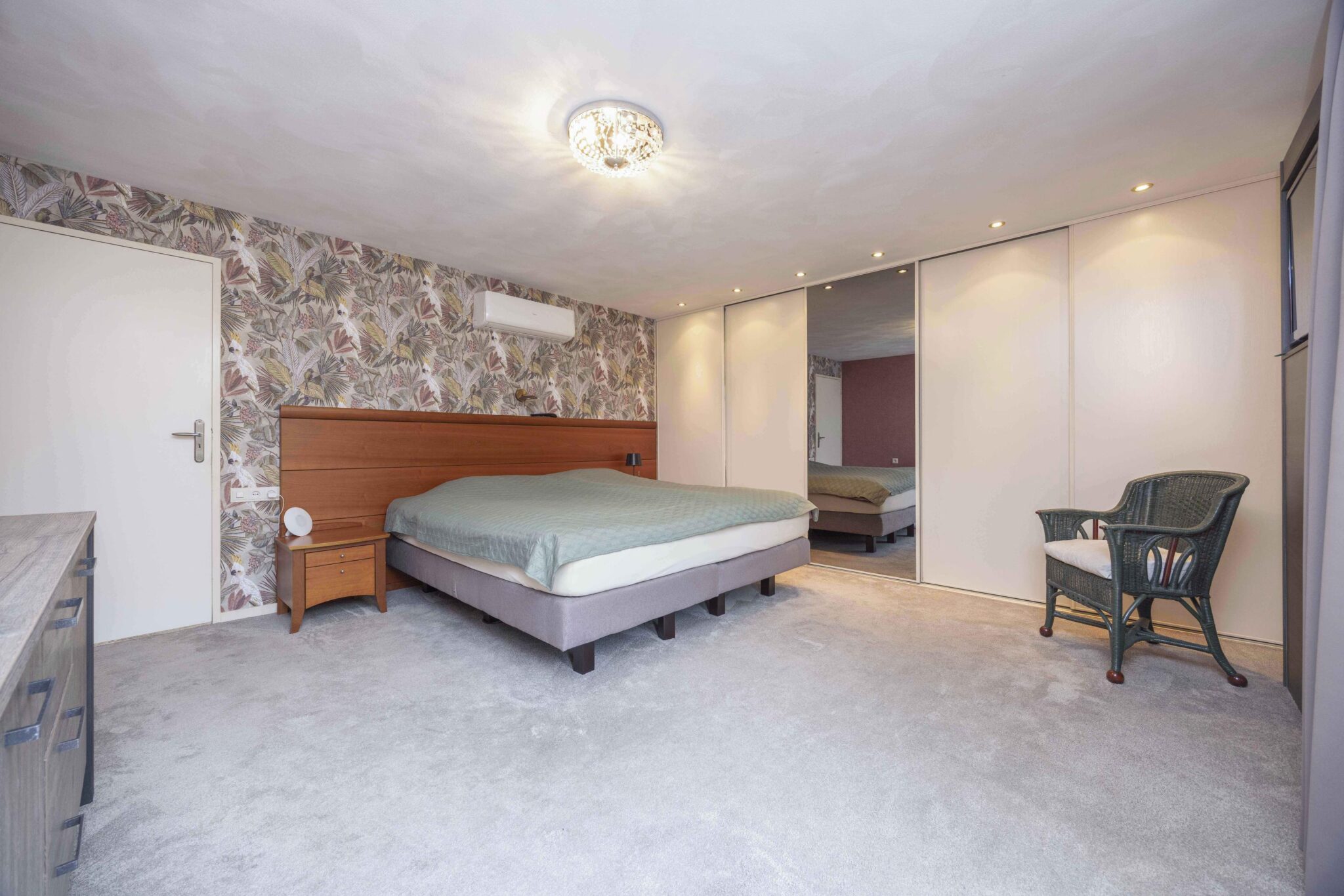 De hoofdslaapkamer is ruim en uitgerust met vloerbedekking, airco, een inbouwkast, een balkon en een rolluik.
