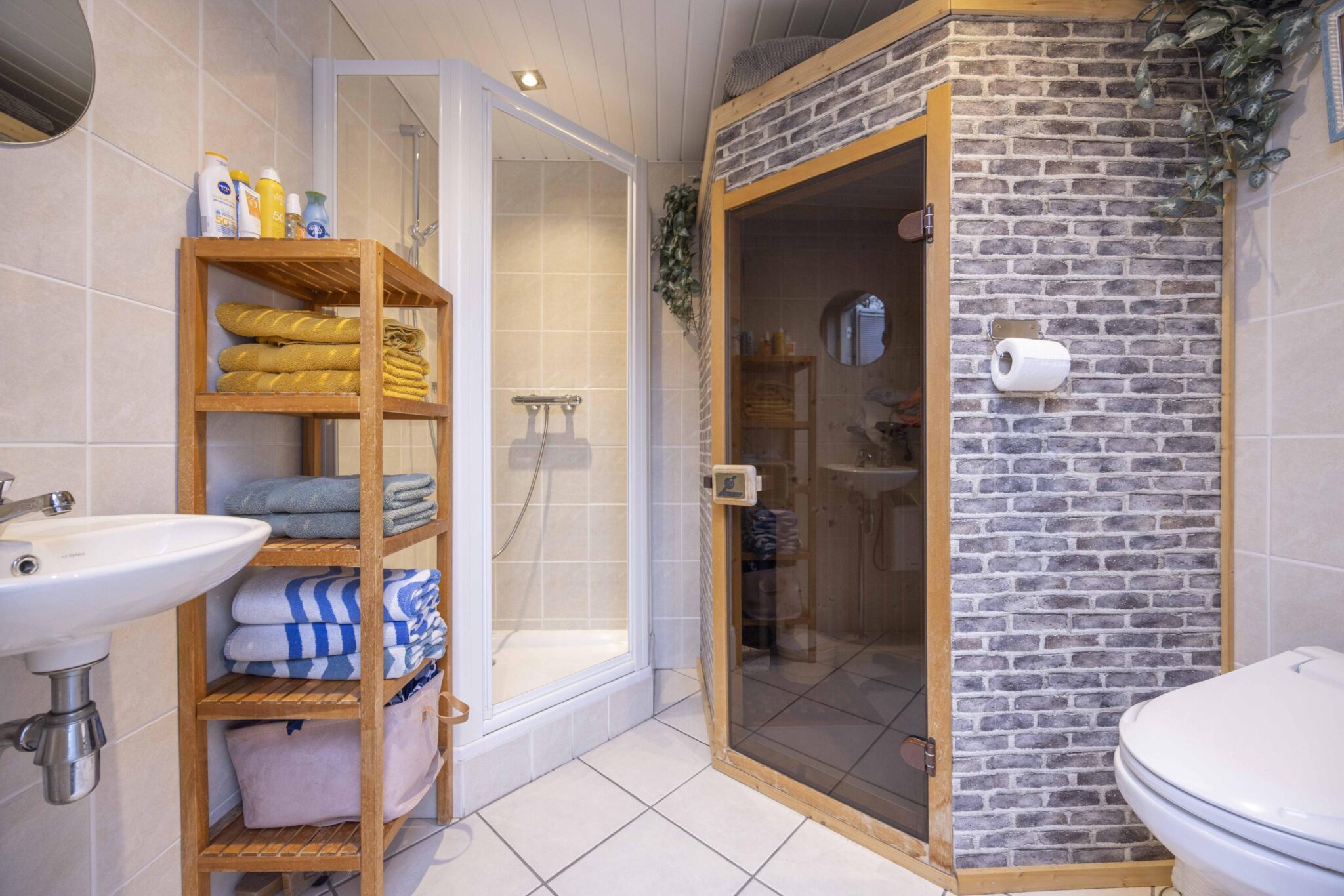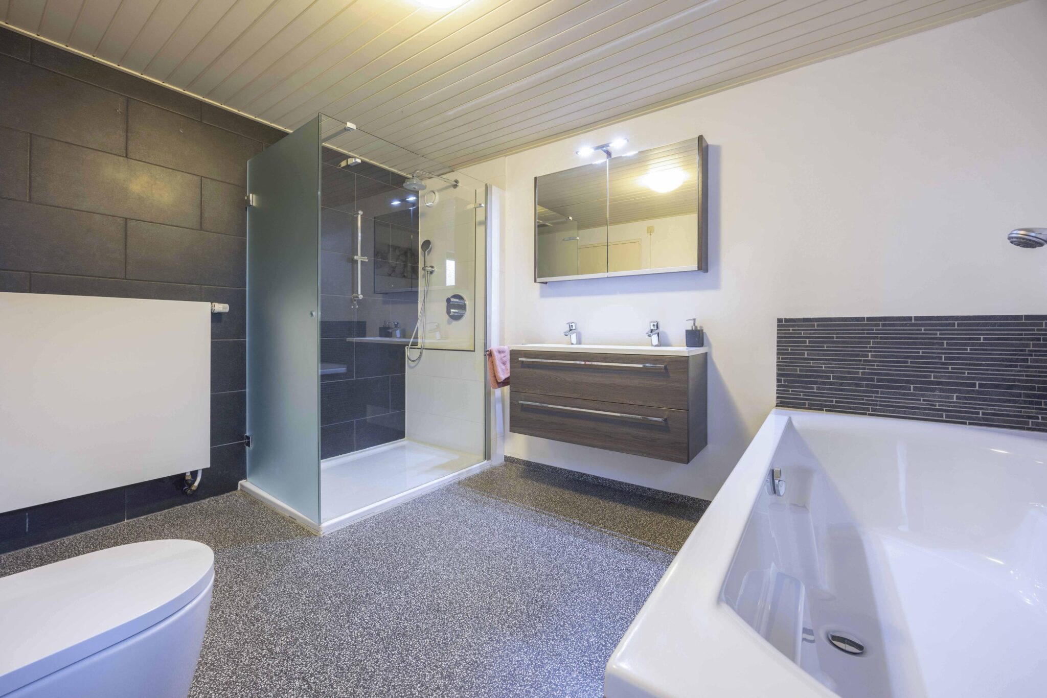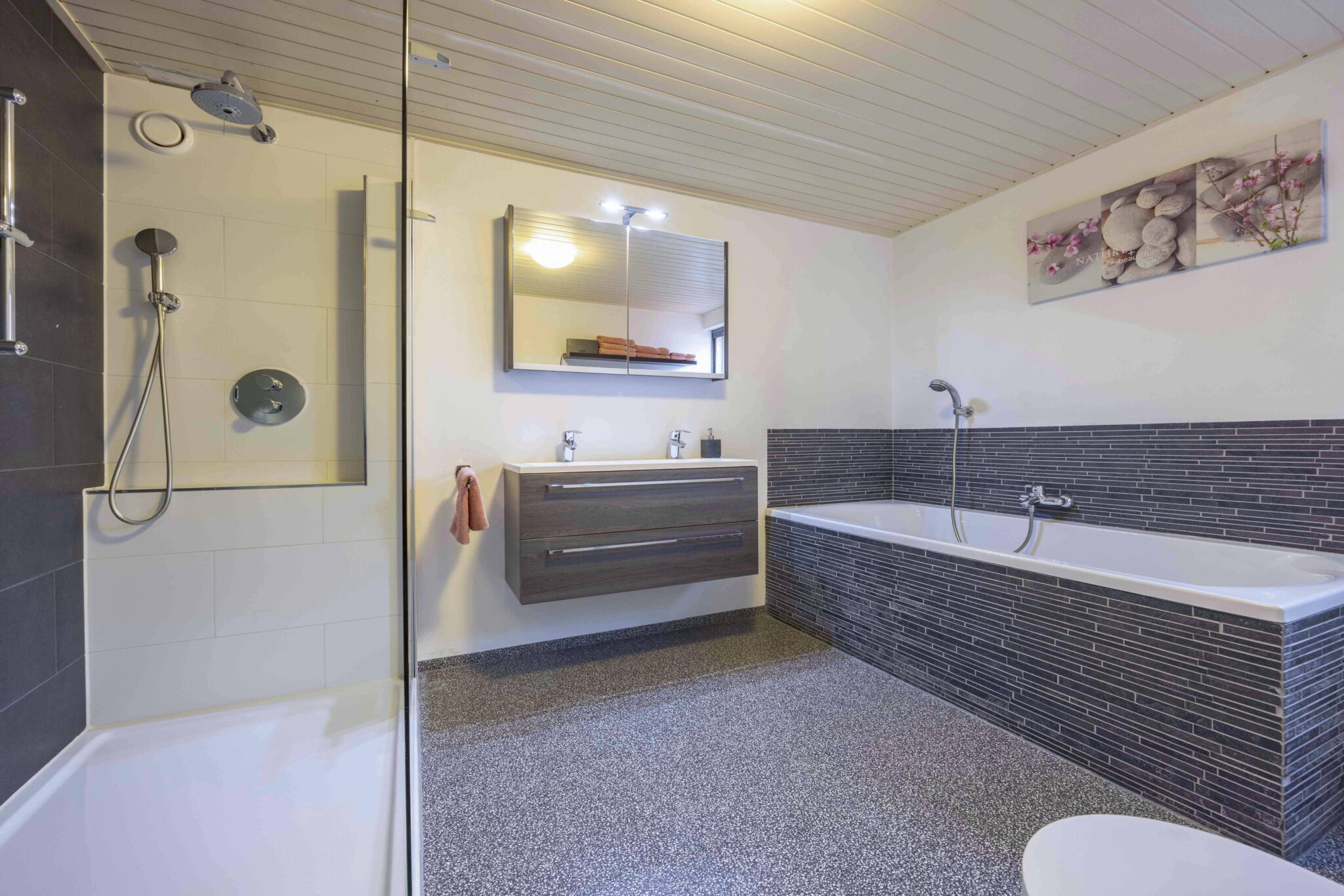 De badkamer is afgewerkt met een pvc vloer en voorzien van een ligbad, toilet, inloopdouche en een dubbele wastafel met meubel.