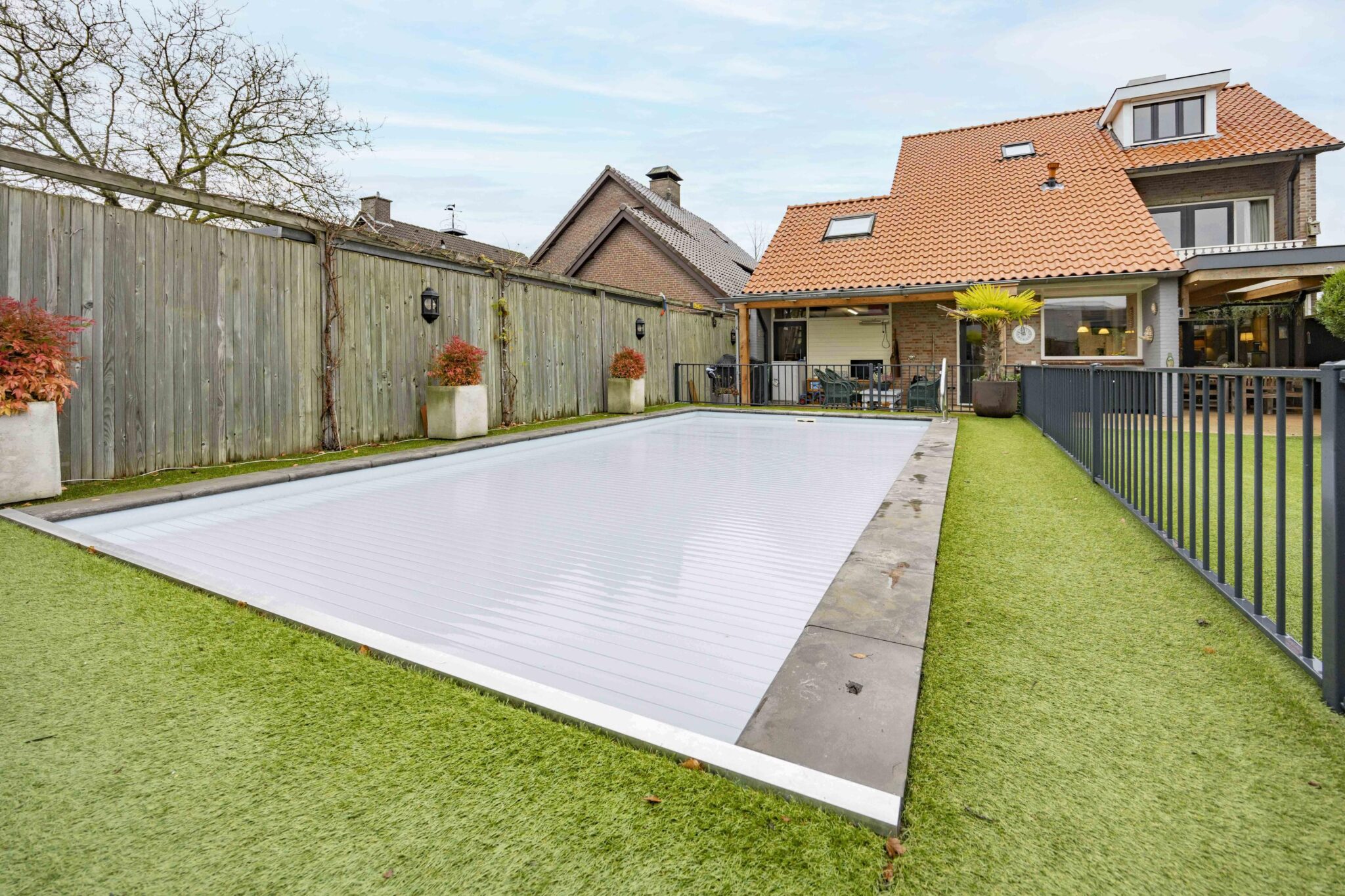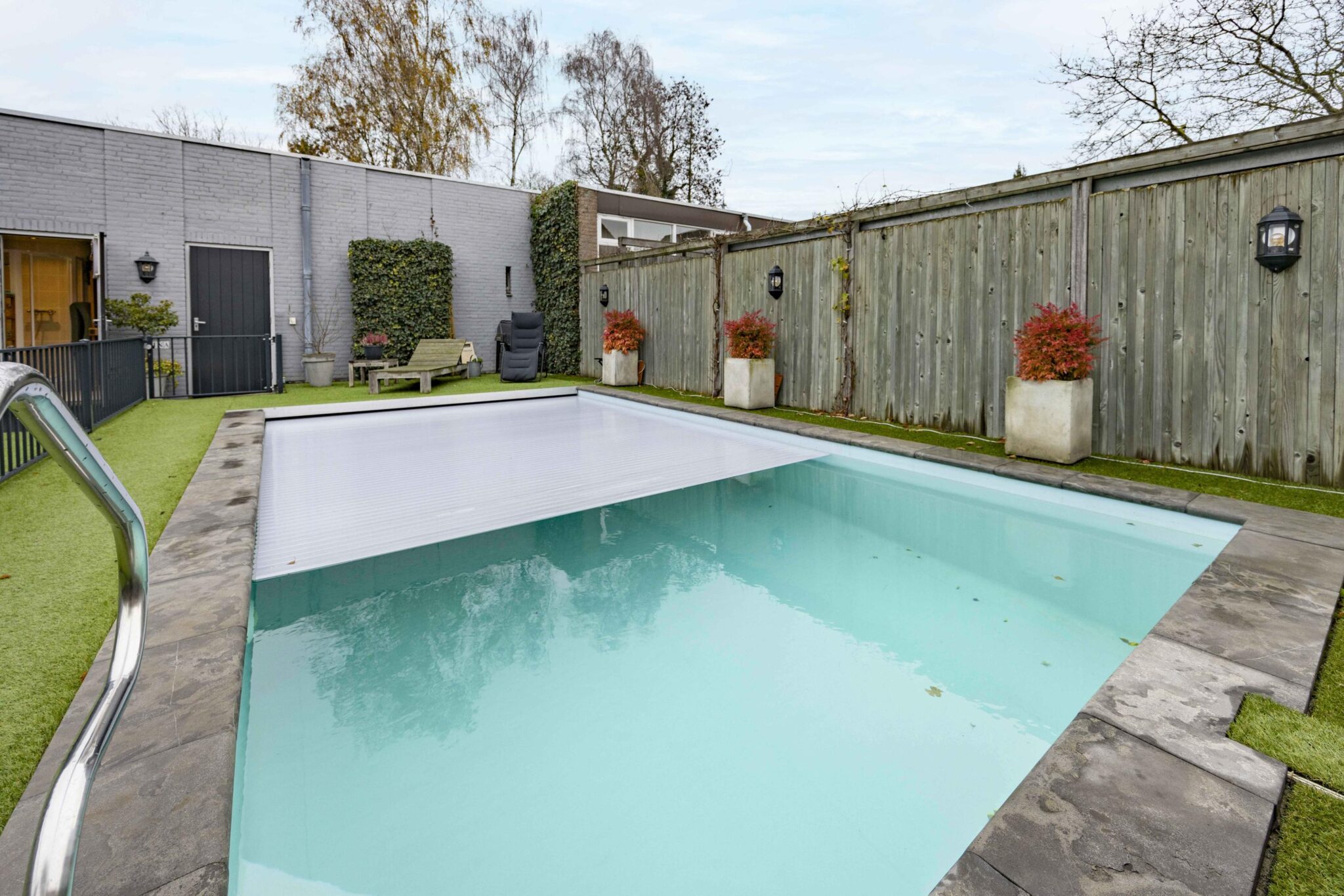 De achtertuin is ingericht voor optimaal buitenleven. Er zijn twee overkappingen met terras en een verwarmd zwembad met roldek, gelegen naast een onderhoudsvriendelijk kunstgras gazon. De tuin heeft twee achterom mogelijkheden. Achter in de tuin bevindt zich een tweede badkamer met sauna, douche en toilet. Aangrenzend ligt een bergruimte waar de warmtepomp voor het zwembad is geplaatst.