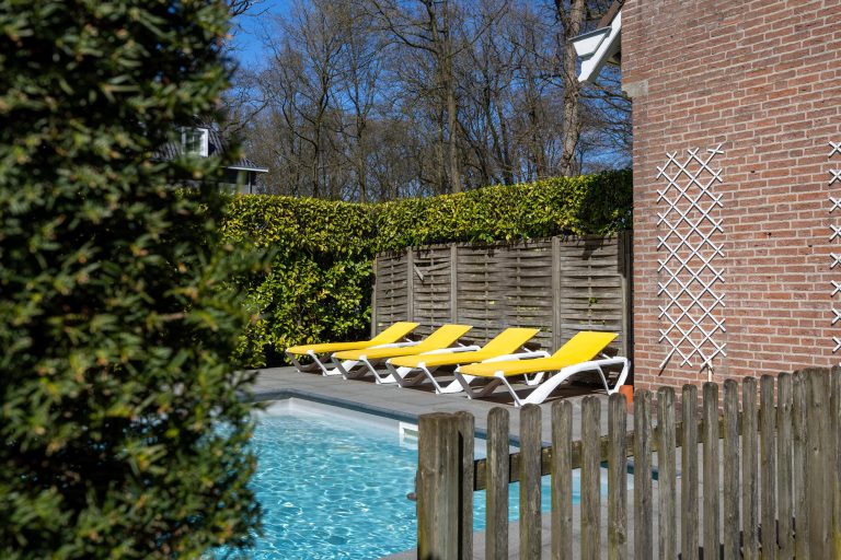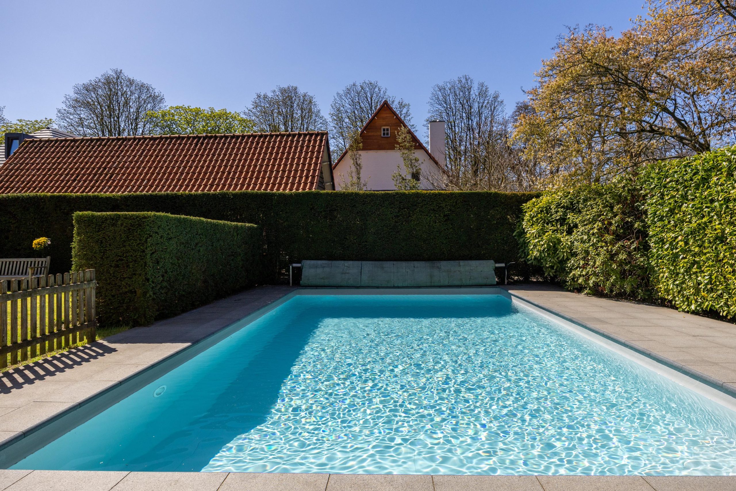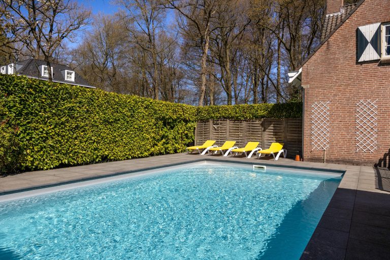 Achterin de tuin bevindt zich een zwembad van circa 9 bij 5 meter.