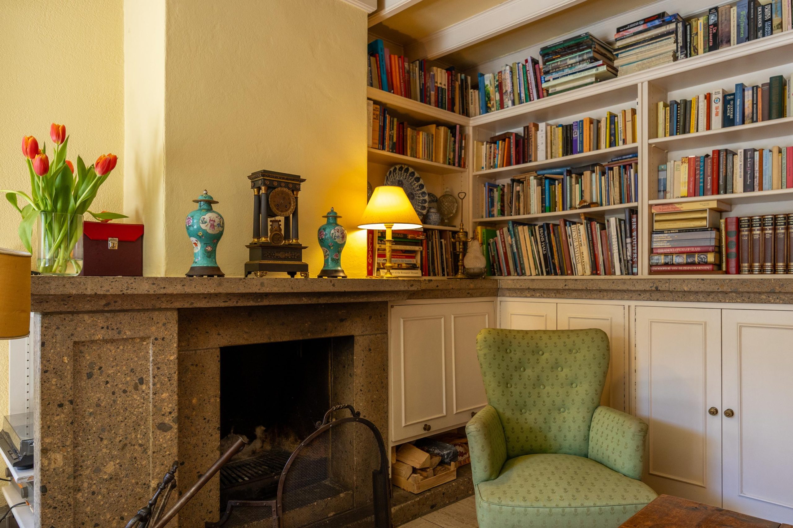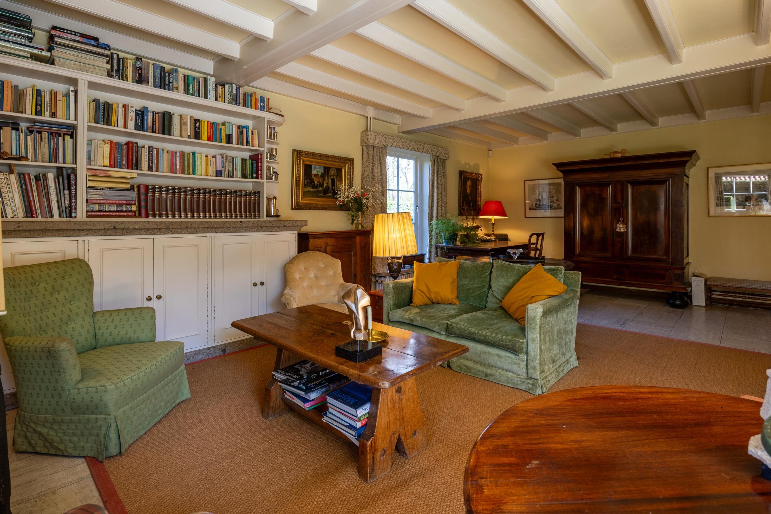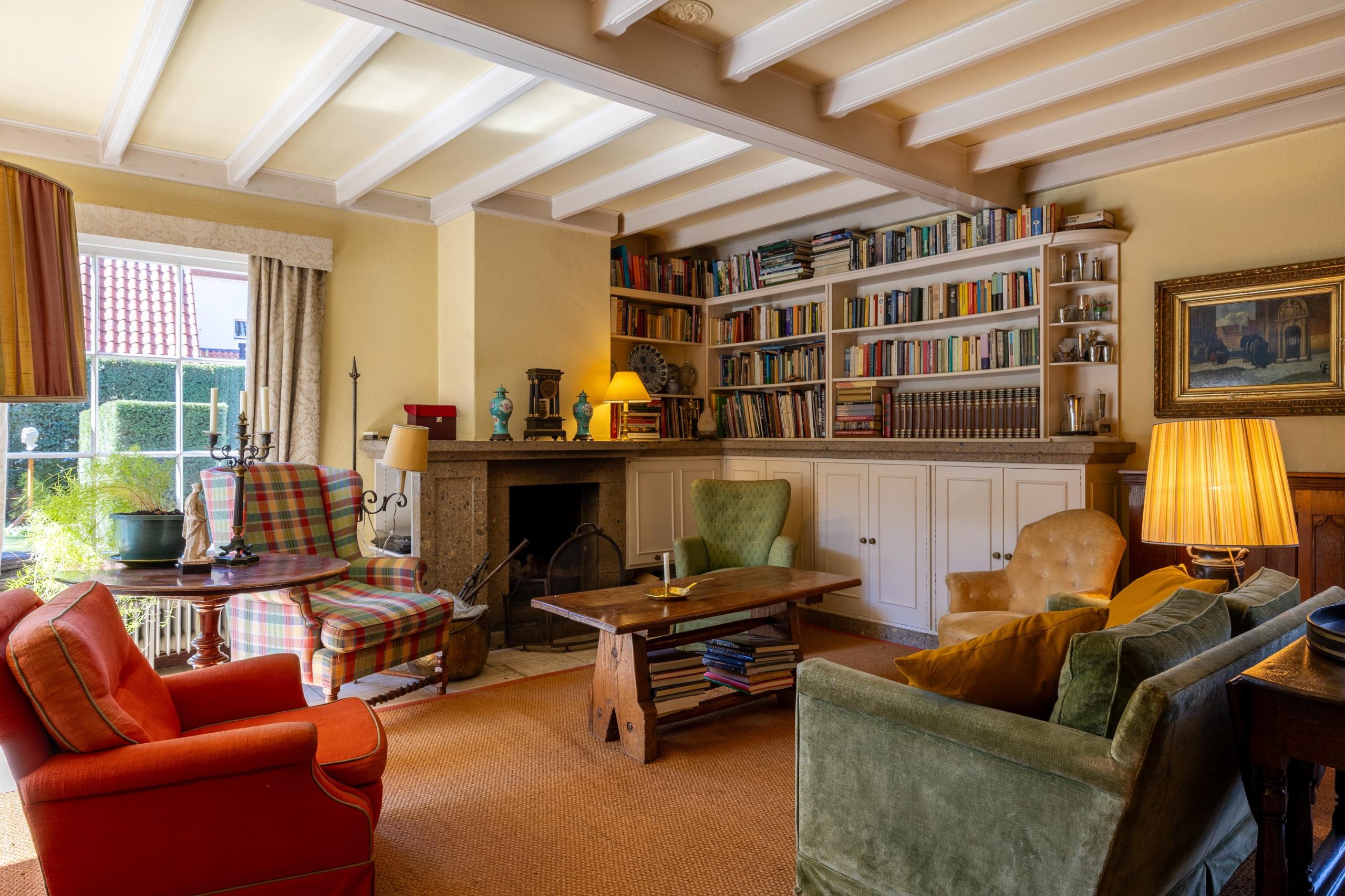 De woonkamer is voorzien van een open haard, grote raampartijen en authentieke kasten.