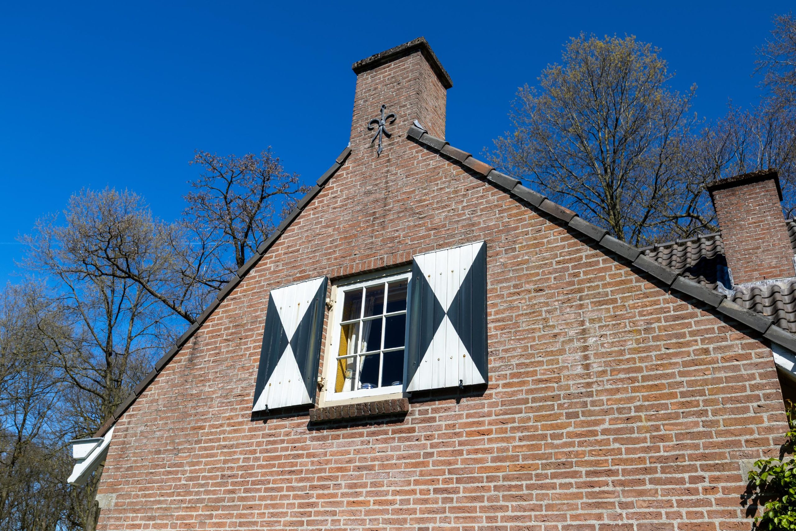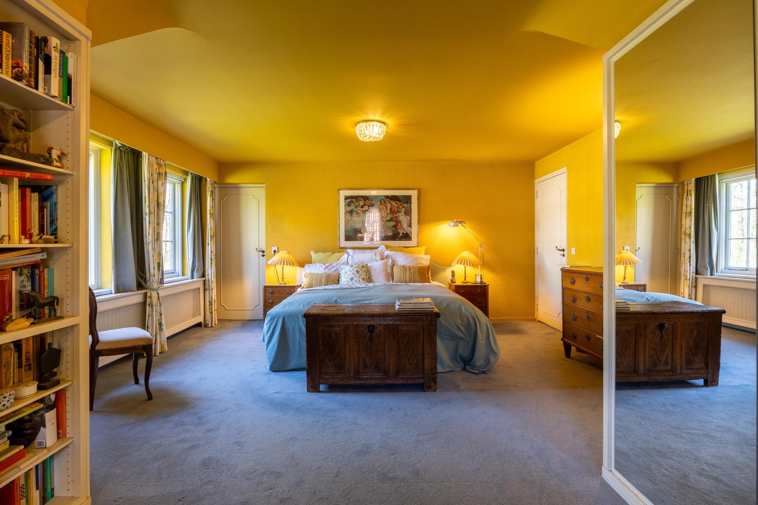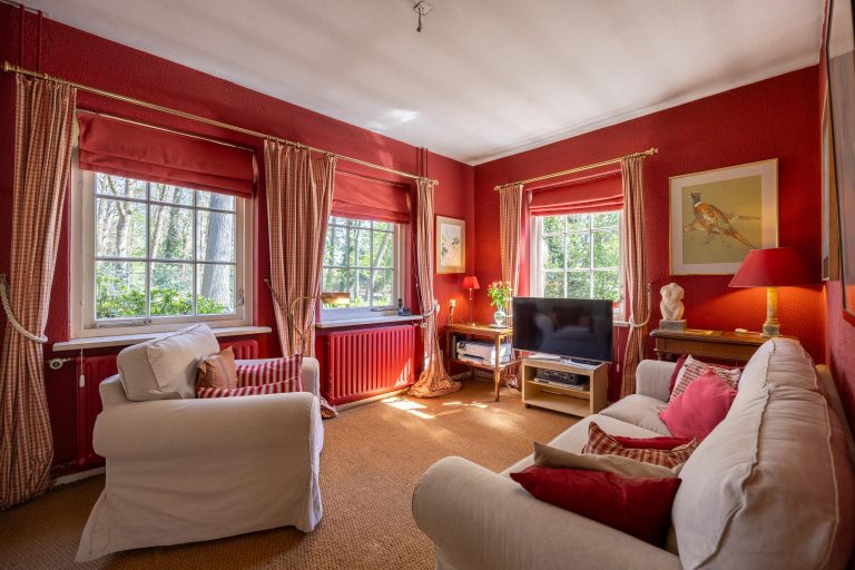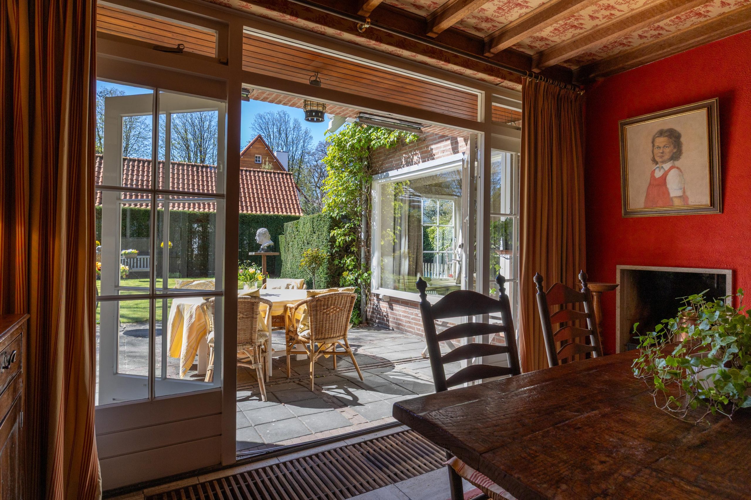 De woonkamer is voorzien van een open haard, grote raampartijen en authentieke kasten.