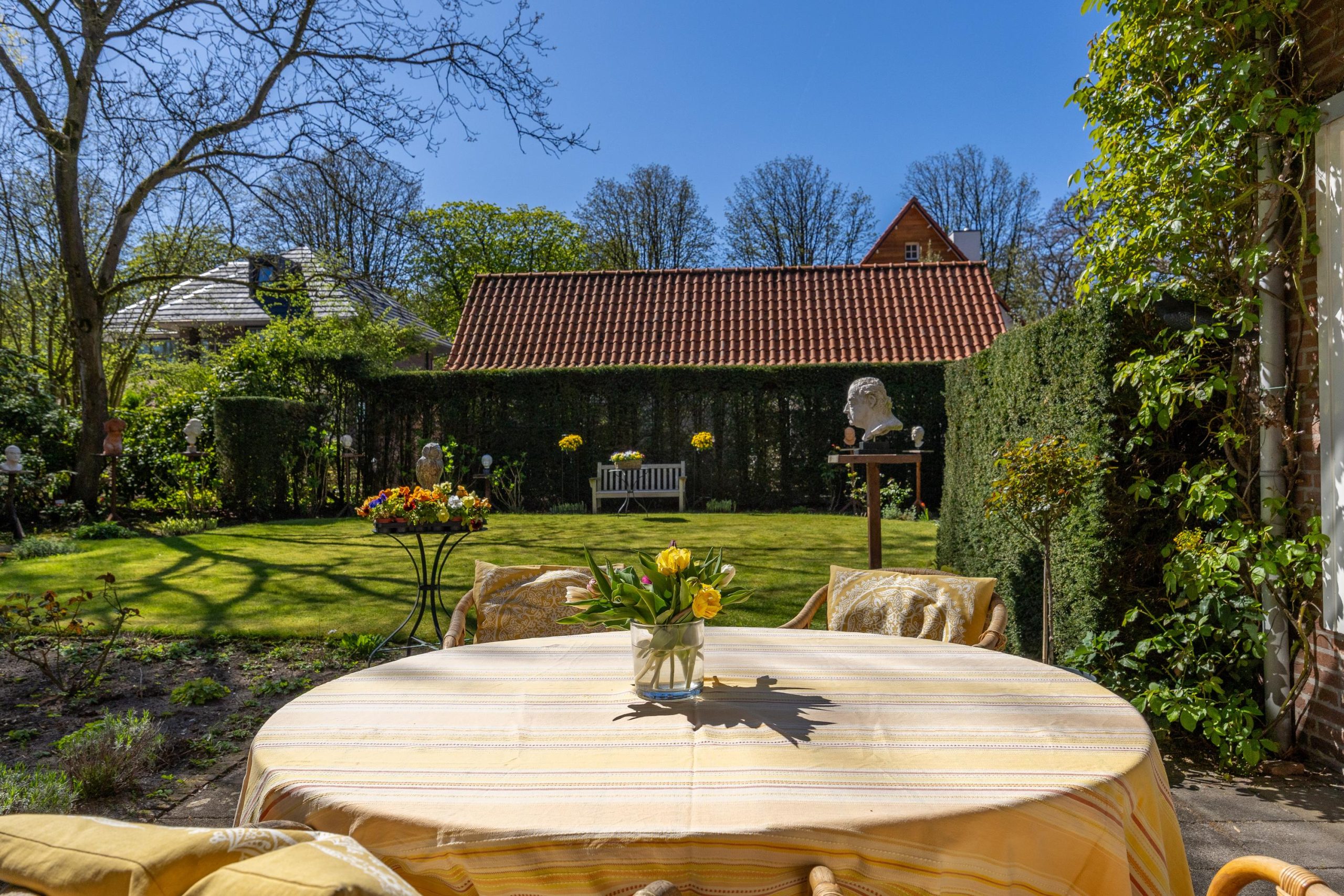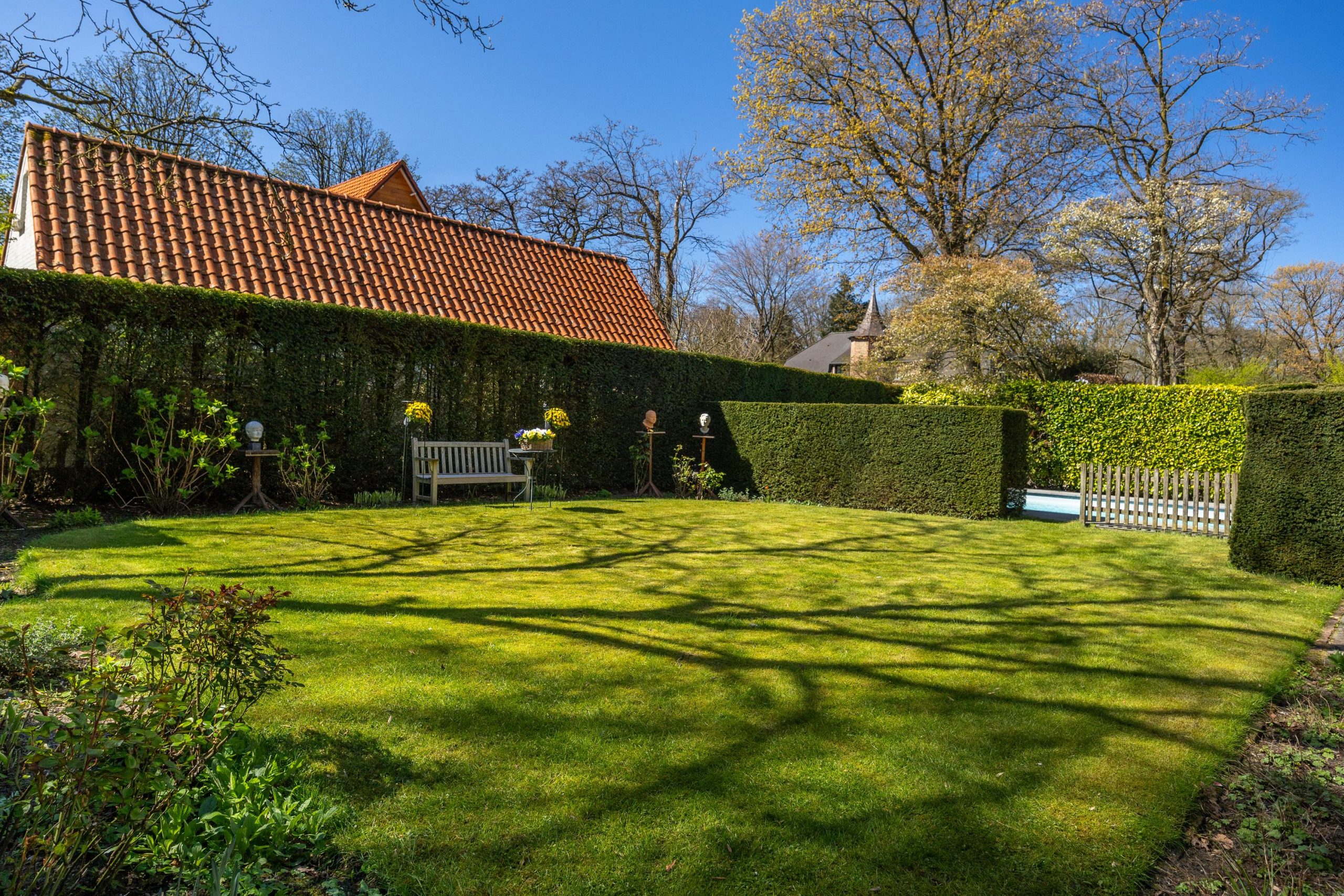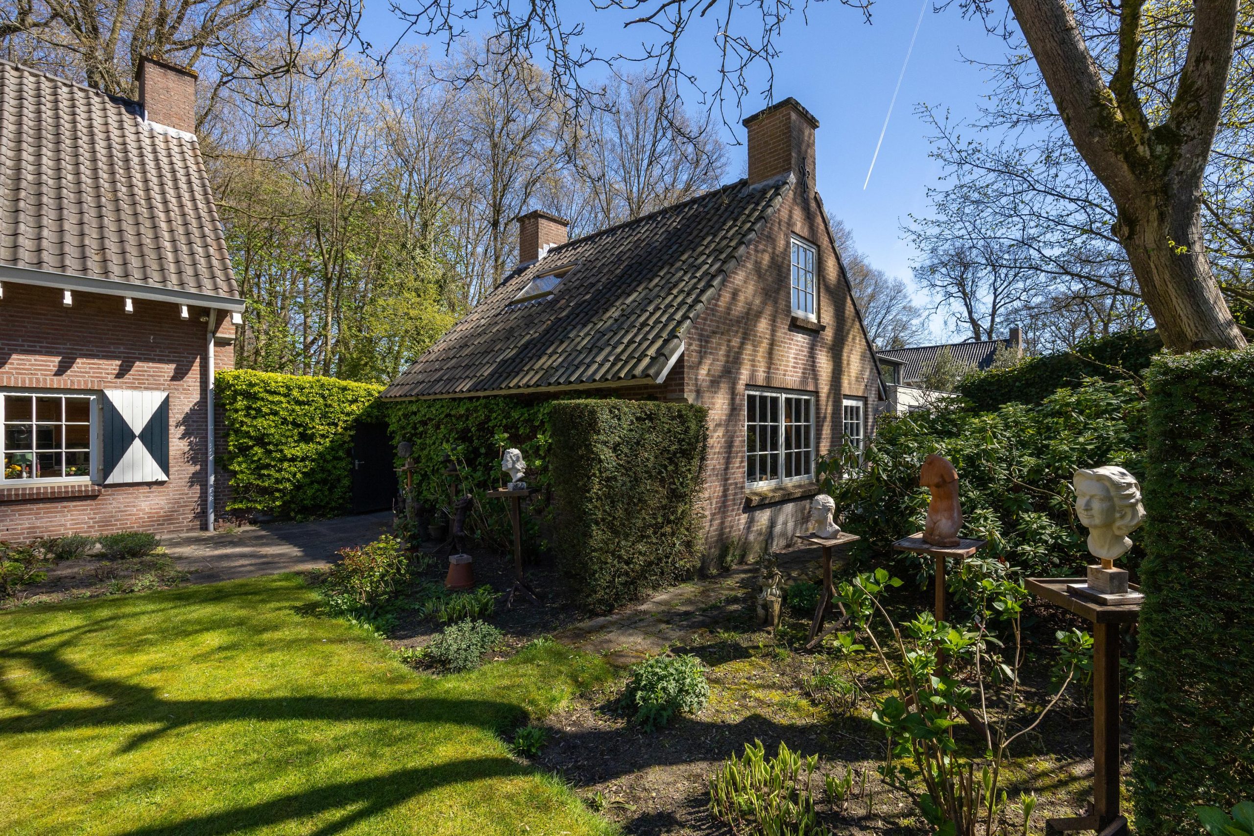 De voortuin is eveneens groen aangelegd en draagt bij aan de verzorgde uitstraling van de woning, met een gazon en volwassen beplanting.