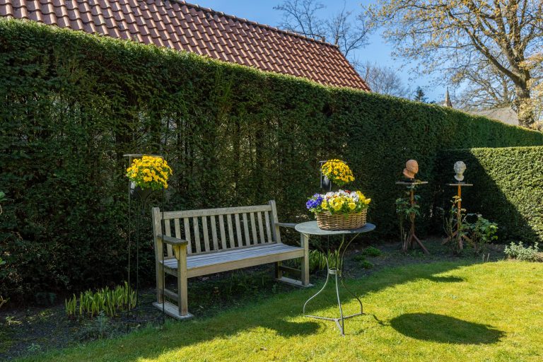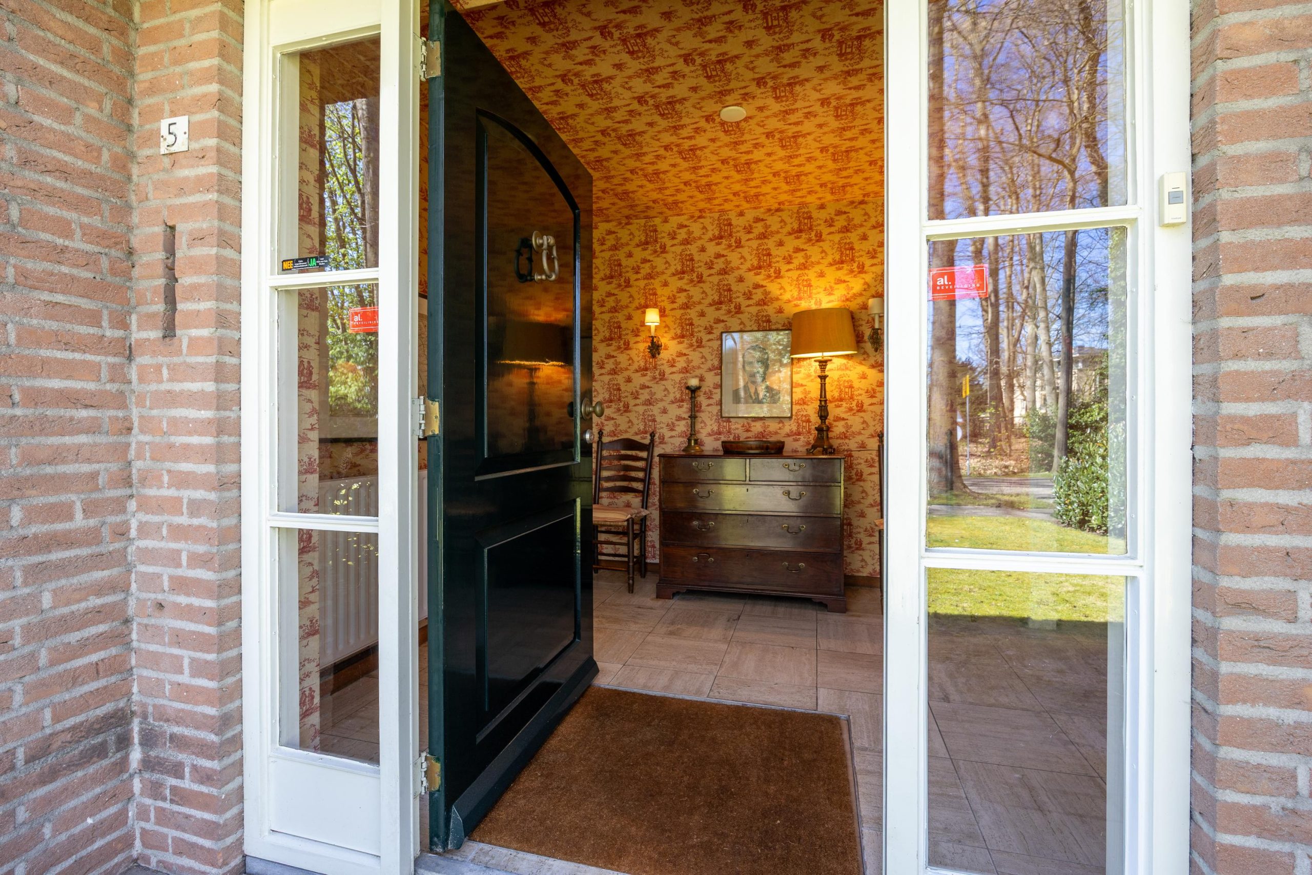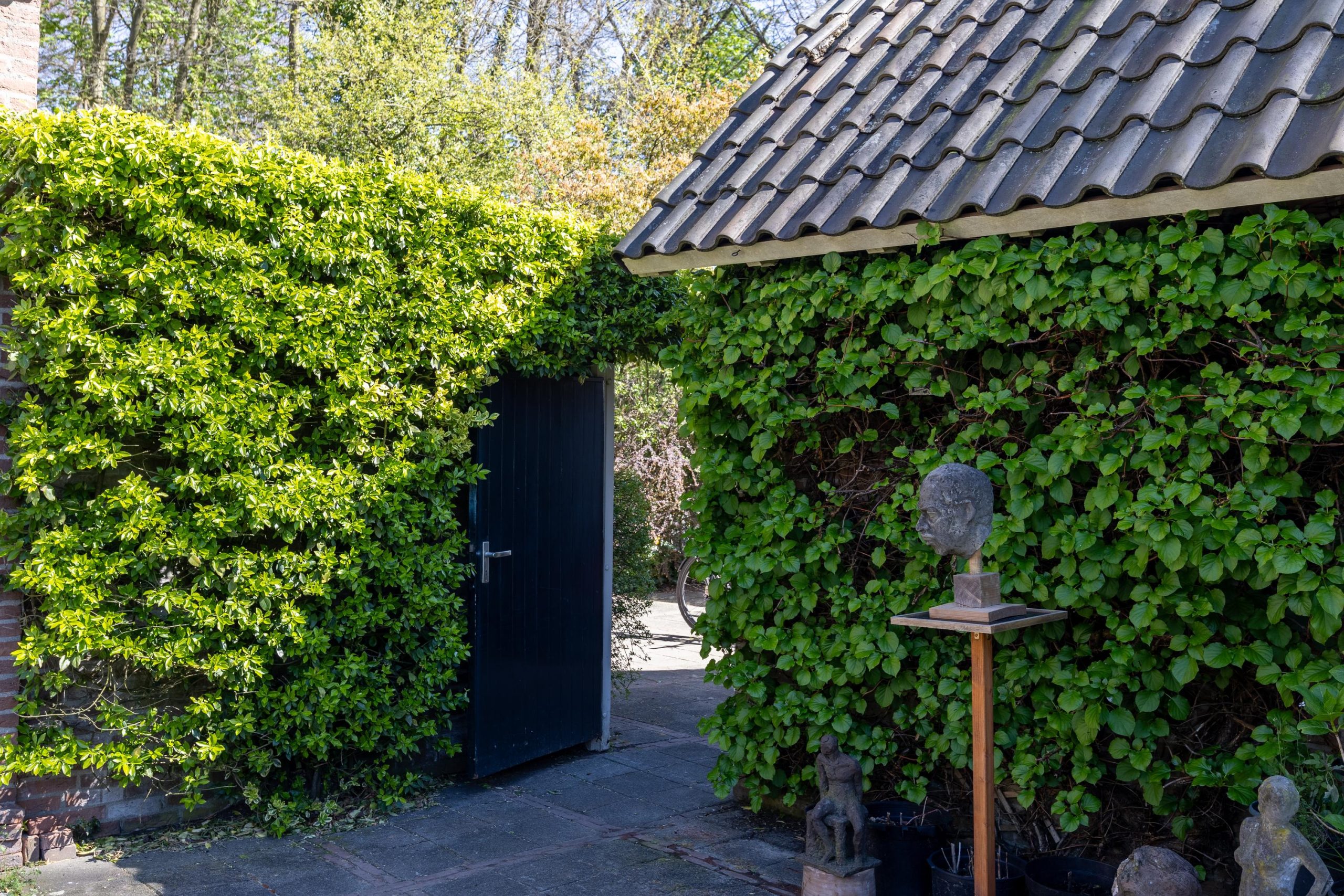 De voortuin is eveneens groen aangelegd en draagt bij aan de verzorgde uitstraling van de woning, met een gazon en volwassen beplanting.