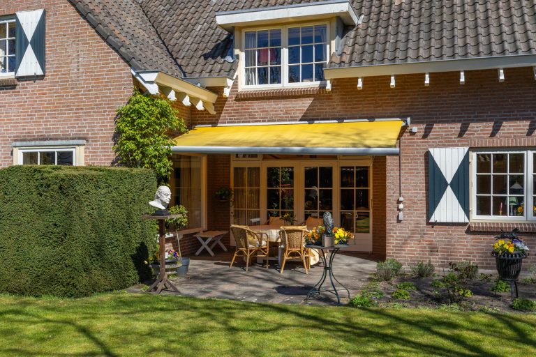De achtertuin beschikt over een prettig terras met fijne zonligging (zuid/west), waar een zonneluifel de mogelijkheid biedt om schaduw te creëren. Aansluitend ligt een verzorgd gazon, omgeven door volwassen groen, wat zorgt voor privacy en een rustige uitstraling.