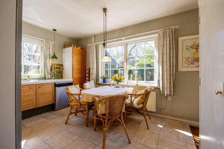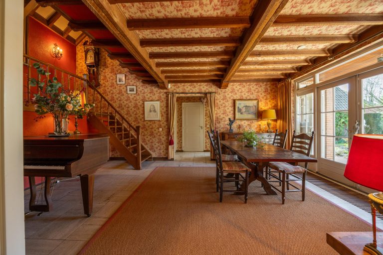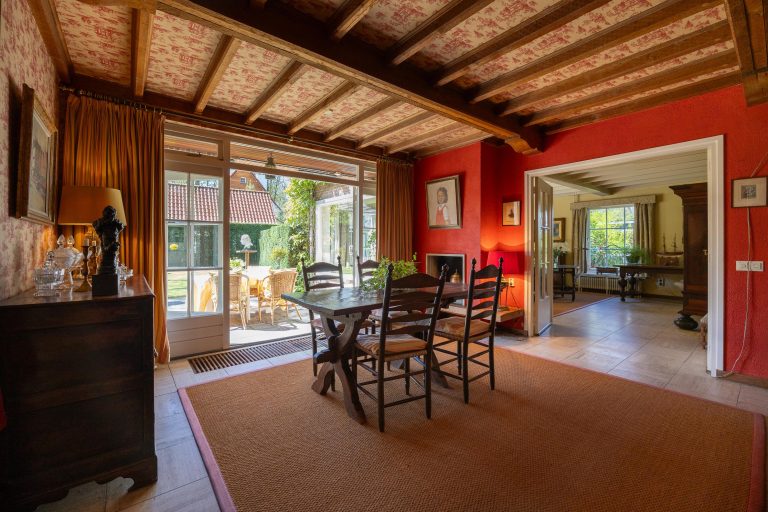 Het karakter van deze villa komt duidelijk naar voren in de verschillende kamers. Het hart van de woning wordt gevormd door de eetkamer (met riante vide), waar tevens de trap naar de verdieping is gesitueerd. De eetkamer beschikt over twee openslaande deuren naar de tuin, een open haard en een convectorput. Vanuit de eetkamer is de woonkamer bereikbaar.