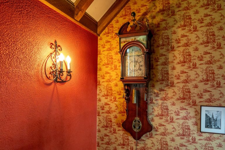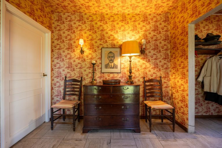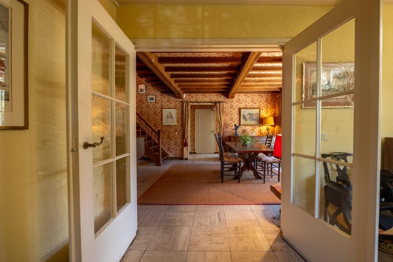 Aan de andere zijde van de eetkamer bevinden zich de voorkamer, de keuken en de bijkeuken. De voorkamer biedt toegang tot de kelder en beschikt over inbouwkasten.