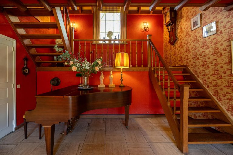 De vloer op de begane grond is afgewerkt met een natuurstenen betegeling.